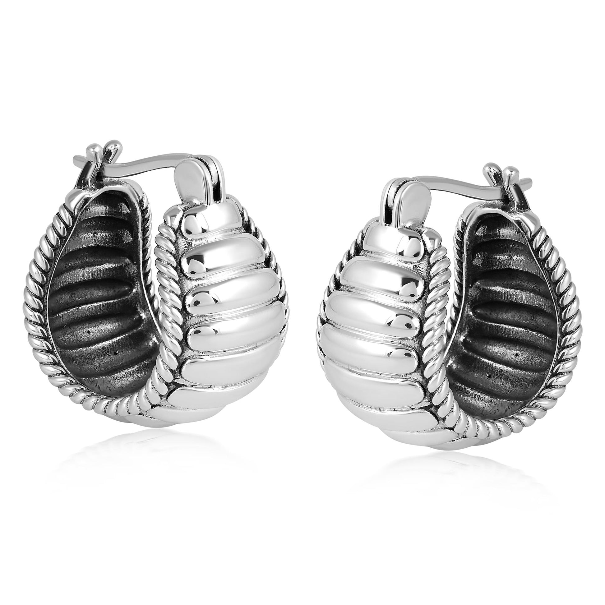 Go big, go bold and get the ease and fun of a hoop in a wide, ear-hugging design with these gorgeous Sterling Silver huggie hoops. They feature a wider profile than a classic hoop with a polished center and rope detailing on the edges. These face-framing hoops will quickly become a staple in your collection. The slight oxidation helps to enhance the details, and the snap-hinge closures are comfortable and easy to use. Pair them with a crisp white blouse and a pair of jeans or add a simple chain and your little black dress - you will find that they will elevate just about any outfit! Whether at work, a date night with your honey or a special party or event– American West Jewelry will get you noticed. Get ready for compliments!