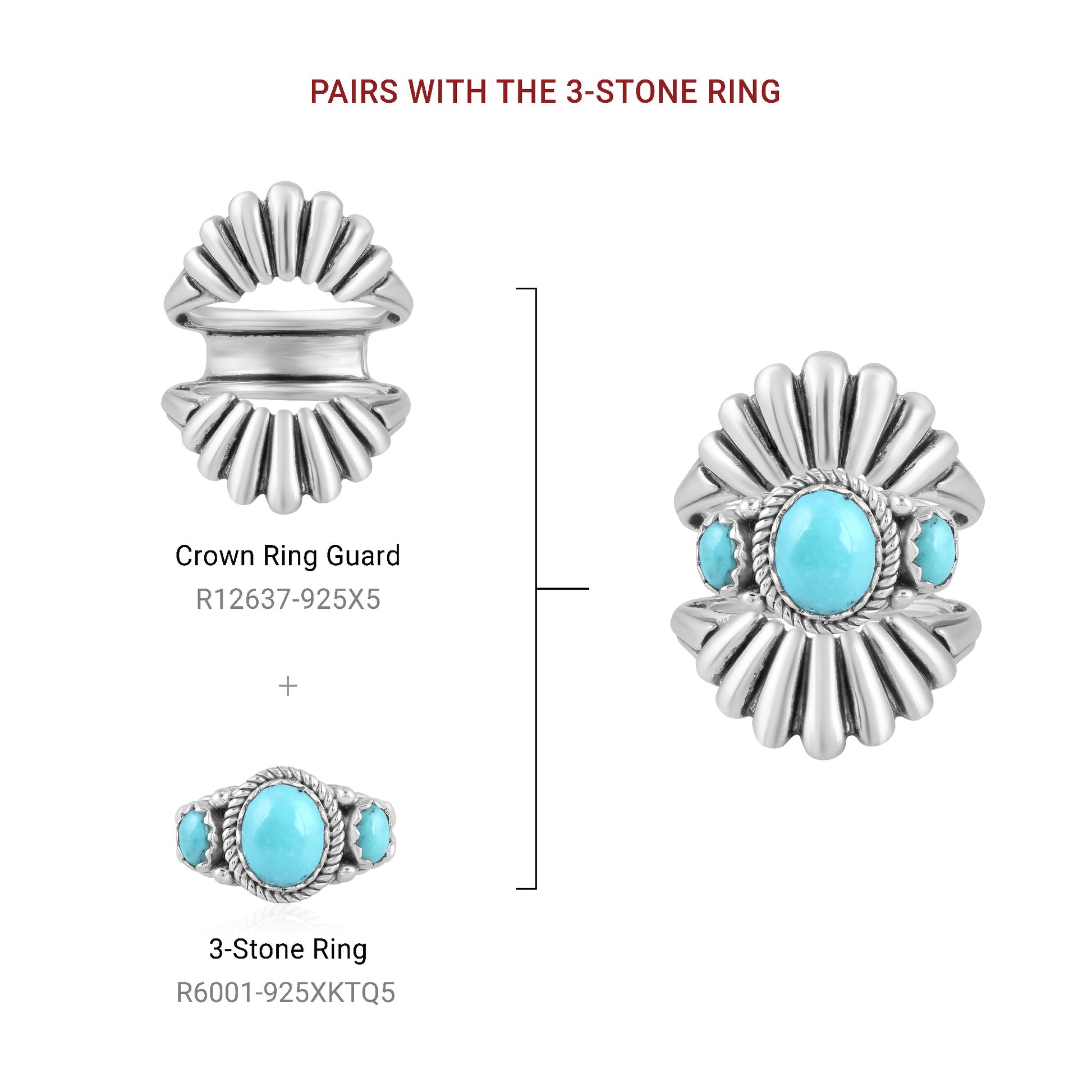 Introducing the American West Jewelry 3-Stone Ring. This naturally colorful, Southwest-inspired Sterling Silver ring features 3 oval Kingman Turquoise gemstones, with a decorative bezel setting with rope detailing and a split shank in a polished, oxidized finish. Create a bold statement and elevate your look. This beautiful ring is designed from nickel-free Sterling Silver and is available in a range of sizes to fit every finger. Pair it with our crown ring guard to create a ring set fit for royalty! Turquoise symbolizes protection, healing, and communication. Its beautiful blue-green color and rich cultural history make it a favorite in both jewelry and spiritual practices.