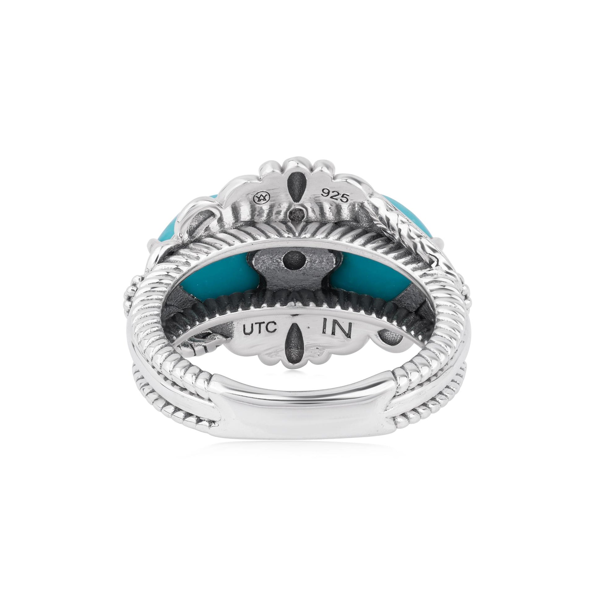 Isn't it romantic? The double heart represents eternal or everlasting love, unity, and deep affection, and this enchanting ring is the perfect symbol of harmony and emotional connection. It starts with two prong-set heart-shaped Kingman Turquoise cabochons at its center, and is framed by leaf and rope detailing with concha flower and beaded accents. The split-shank band is textured in a double rope design and tapers in the back for comfort. Turquoise symbolizes protection, healing, and communication. Its beautiful color and rich cultural history make it a favorite in both jewelry and spiritual practices. Every gemstone in the world is naturally unique, just like you! We carefully select the GIA certified gems for each piece, making your ring one-of-a-kind. You will find it will elevate any outfit! Whether at work, a date night with your honey or a special party or event– American West Jewelry will get you noticed. Get ready for compliments!