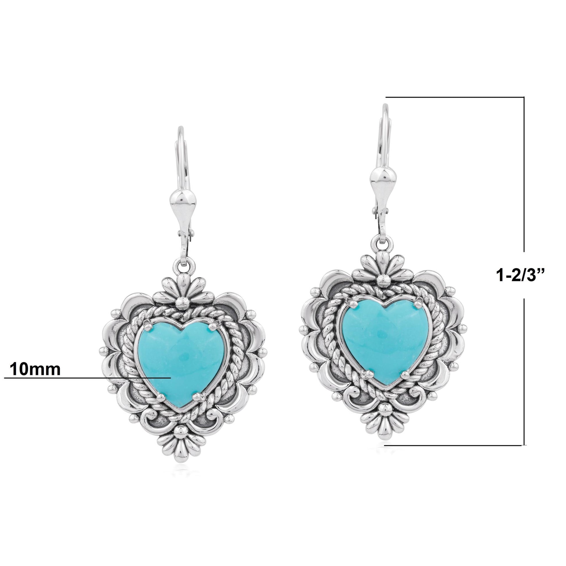 Heartfelt days call for accessories that express your style - these Sterling Silver heart earrings showcase vibrant heart-shaped Kingman Turquoise cabochons framed by rope, fan and concha accents. Whether paired with a flowing blouse or sleek top, the lever back closures offer all-day comfort and the oxidized finish adds Southwest-inspired charm. Turquoise symbolizes protection, healing, and communication. Its beautiful color and rich cultural history make it a favorite in both jewelry and spiritual practices. Every gemstone in the world is naturally unique, just like you! We carefully select the GIA certified gems for each piece, making your earrings one-of-a-kind. You will find they will elevate any outfit! Whether at work, a date night with your honey or a special party or event– American West Jewelry will get you noticed. Get ready for compliments!