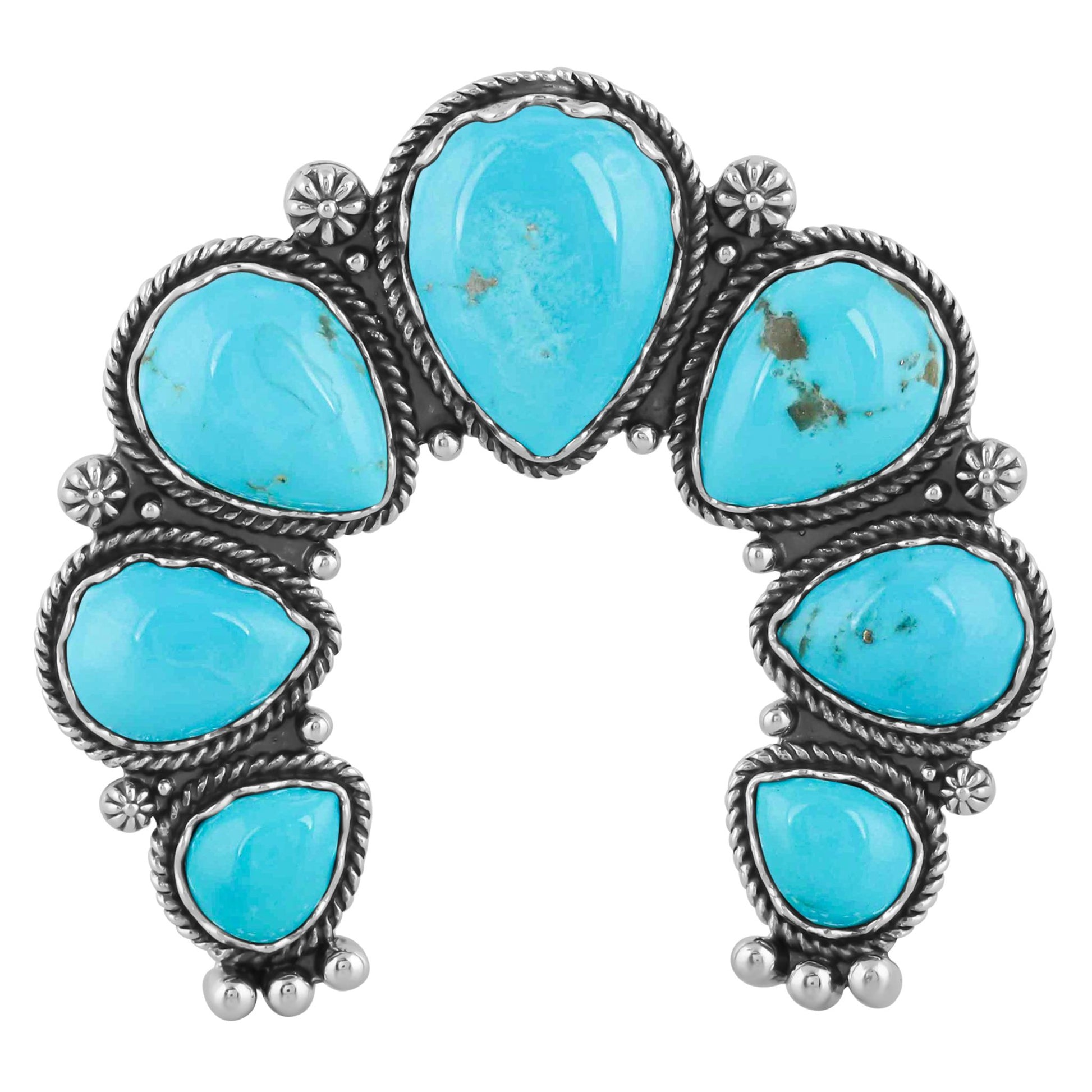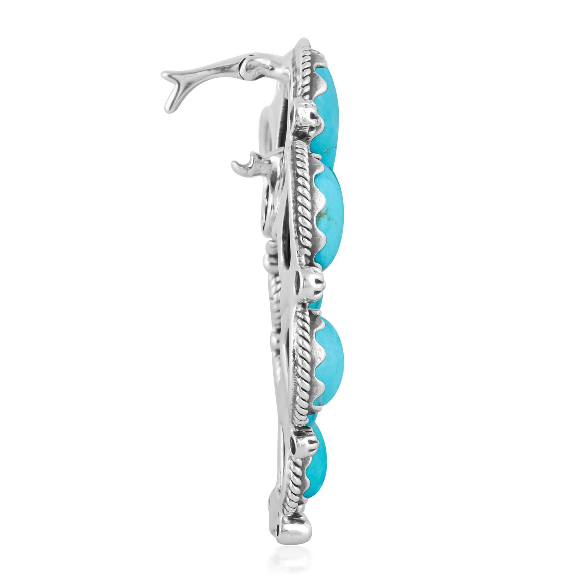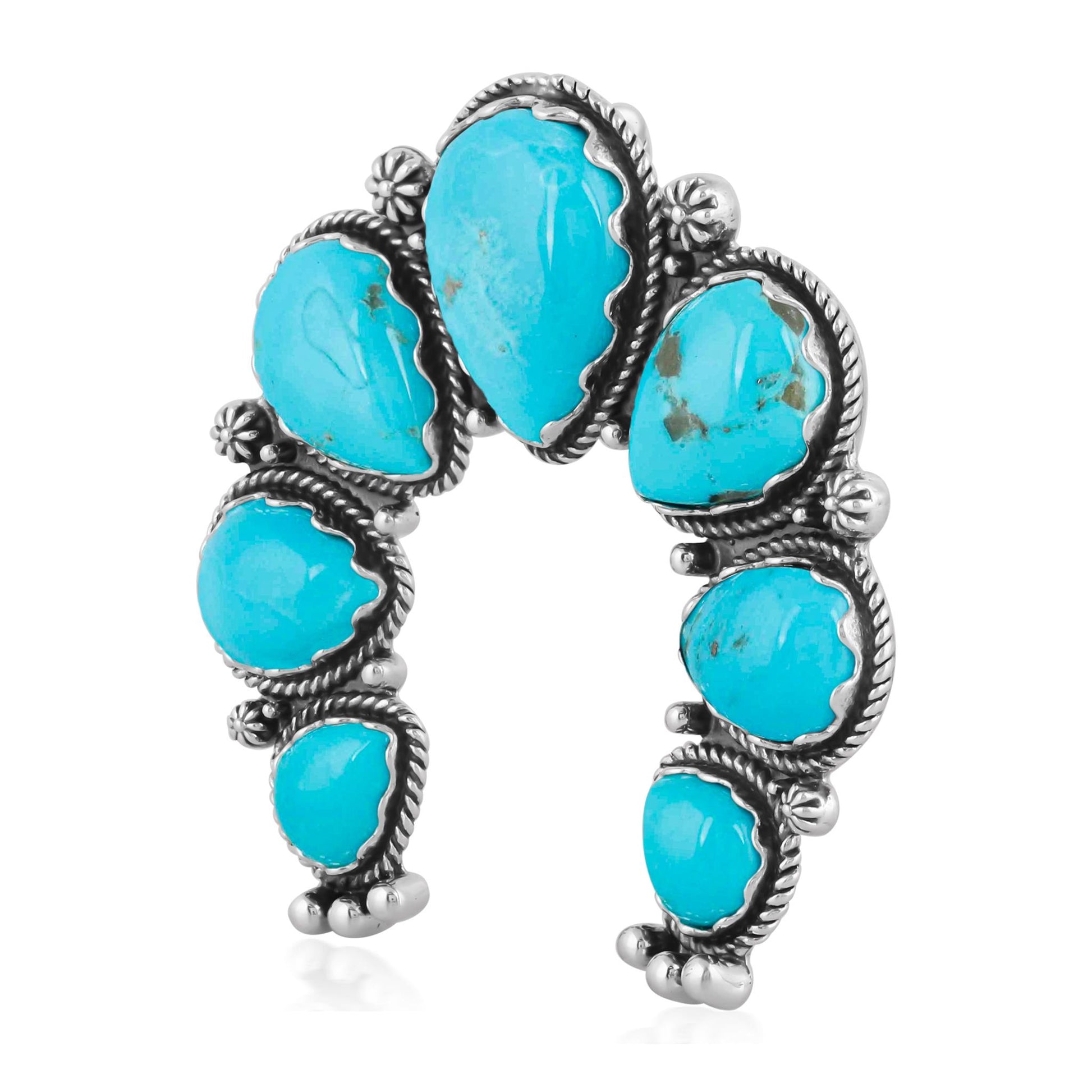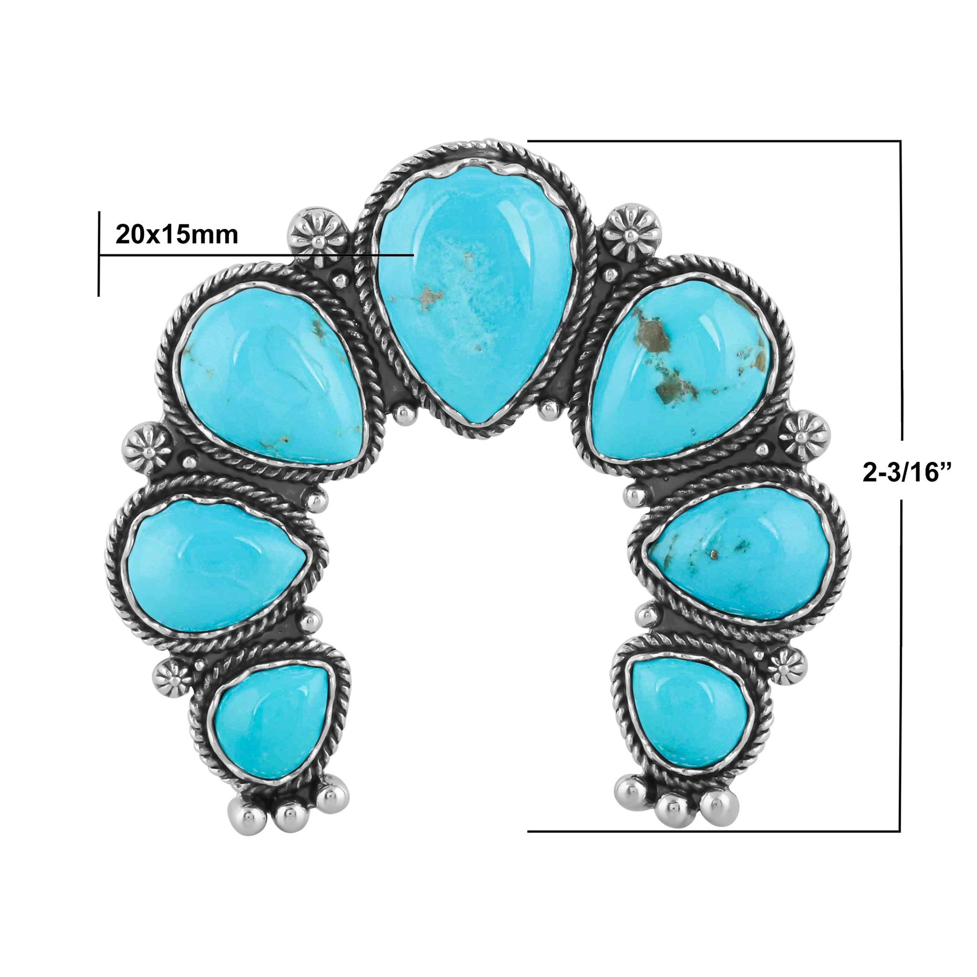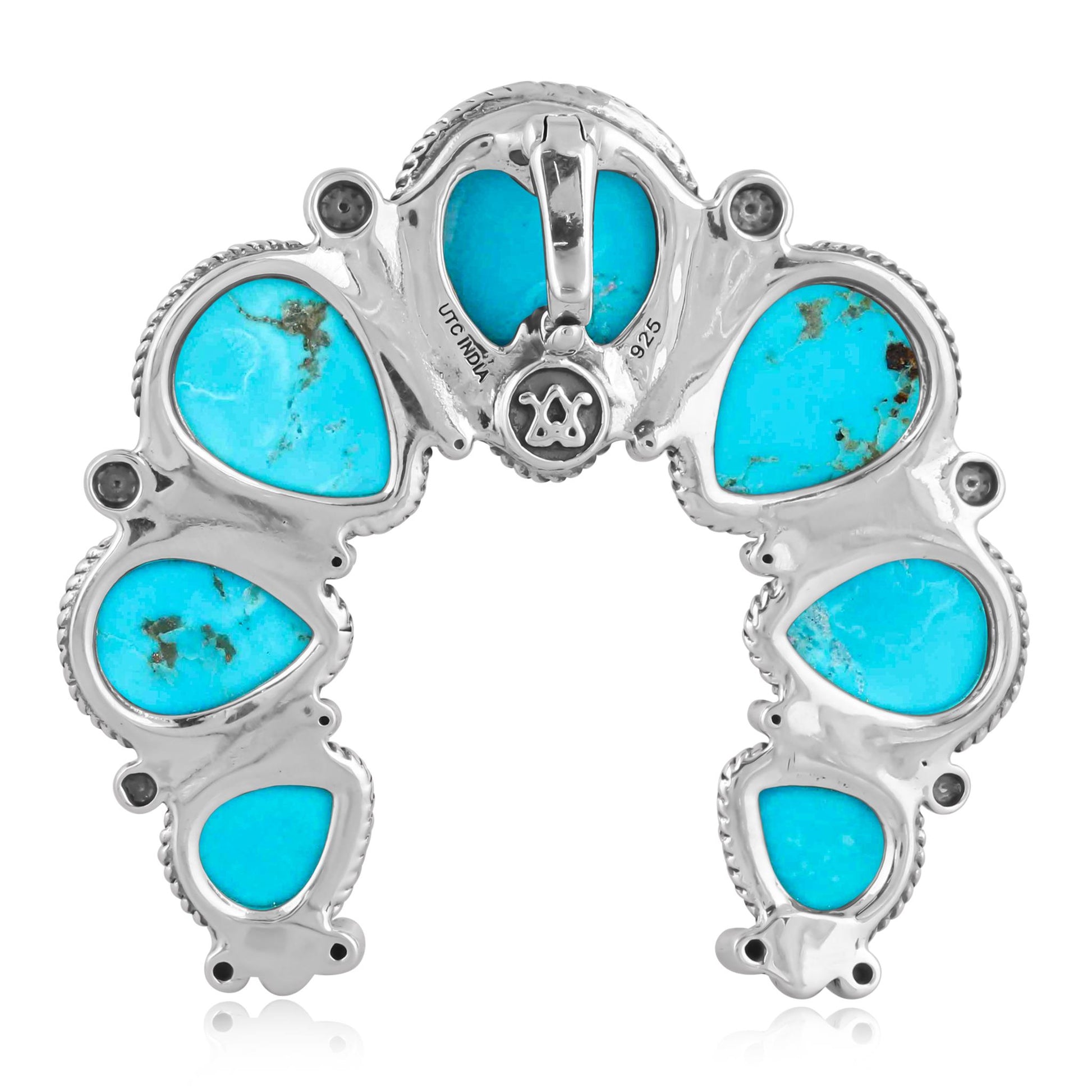 Add a dash of Southwest flair to your outfit when you rock this eye-catching enhancer, flaunting pear-shaped Kingman Turquoise gemstone cabochons in a naja shape with whimsical concha accents and an oxidized finish. It features 7 pear-shaped gemstone cabochons graduated in size, concha and beaded accents, a hidden bail, and a polished, oxidized finish. This gorgeous pendant measures approximately 2"W x 2"L. Kingman Turquoise is a highly prized variety of Turquoise which originates in Kingman, Arizona. Turquoise gemstone provides mental relaxation, stress reduction, confidence, and balance. It also attracts abundance and prosperity for the wearer. Every gemstone in the world is naturally unique, just like you! We carefully select the GIA certified gems for each piece, making your enhancer one-of-a-kind. You will find that this piece will elevate any outfit! Whether at work, a date night with your honey or a special party or event– American West Jewelry will get you noticed. Get ready for compliments!