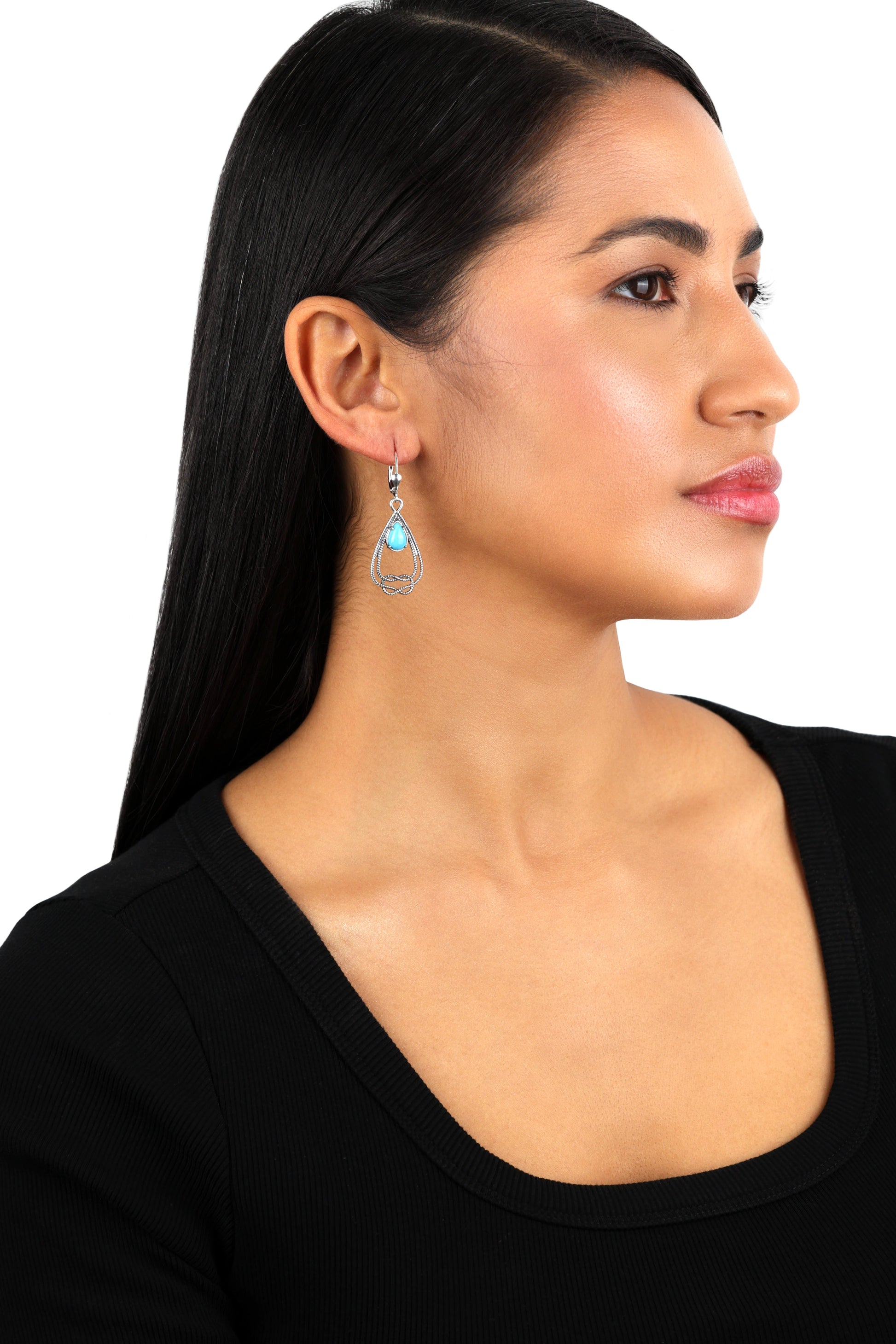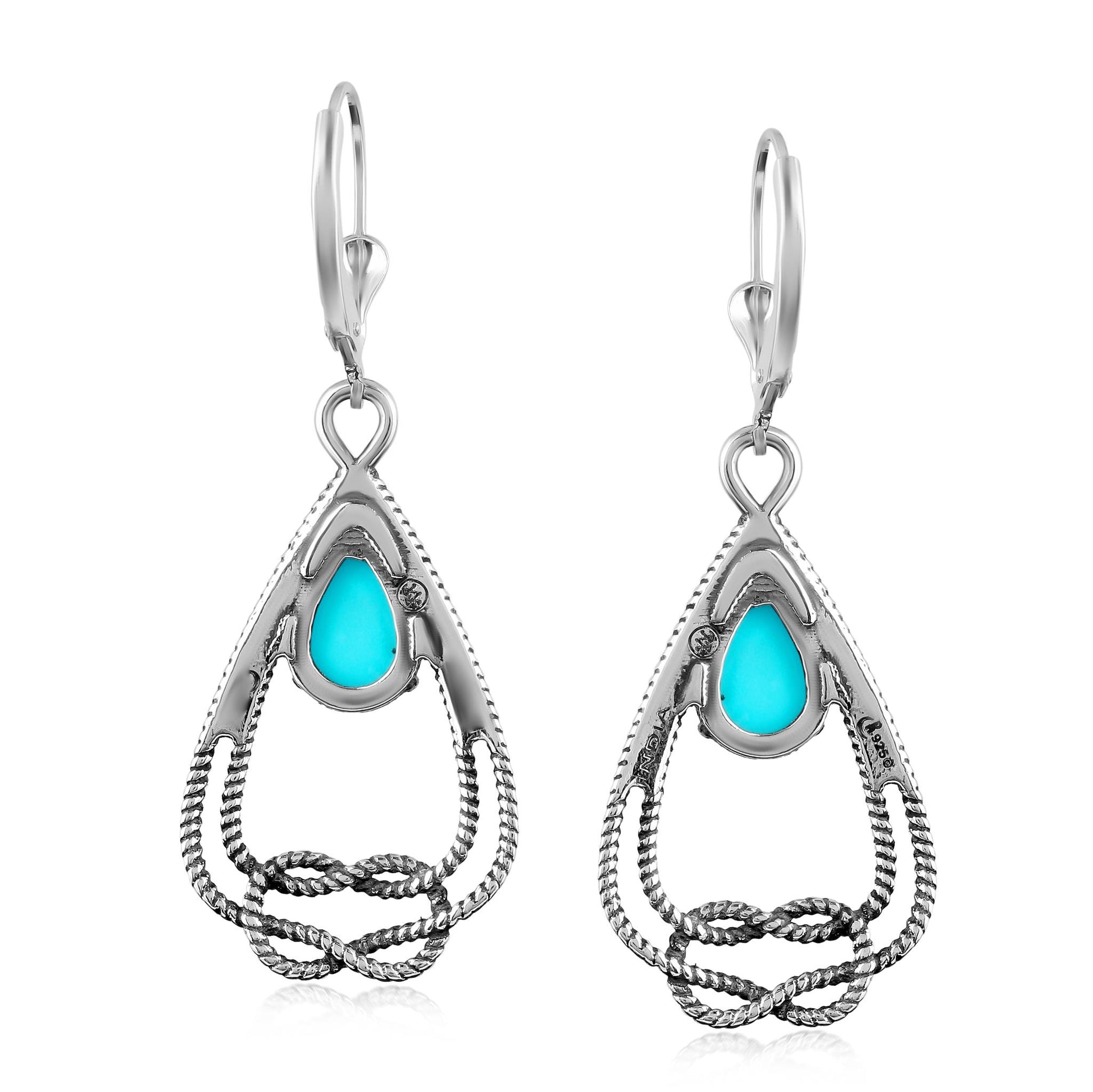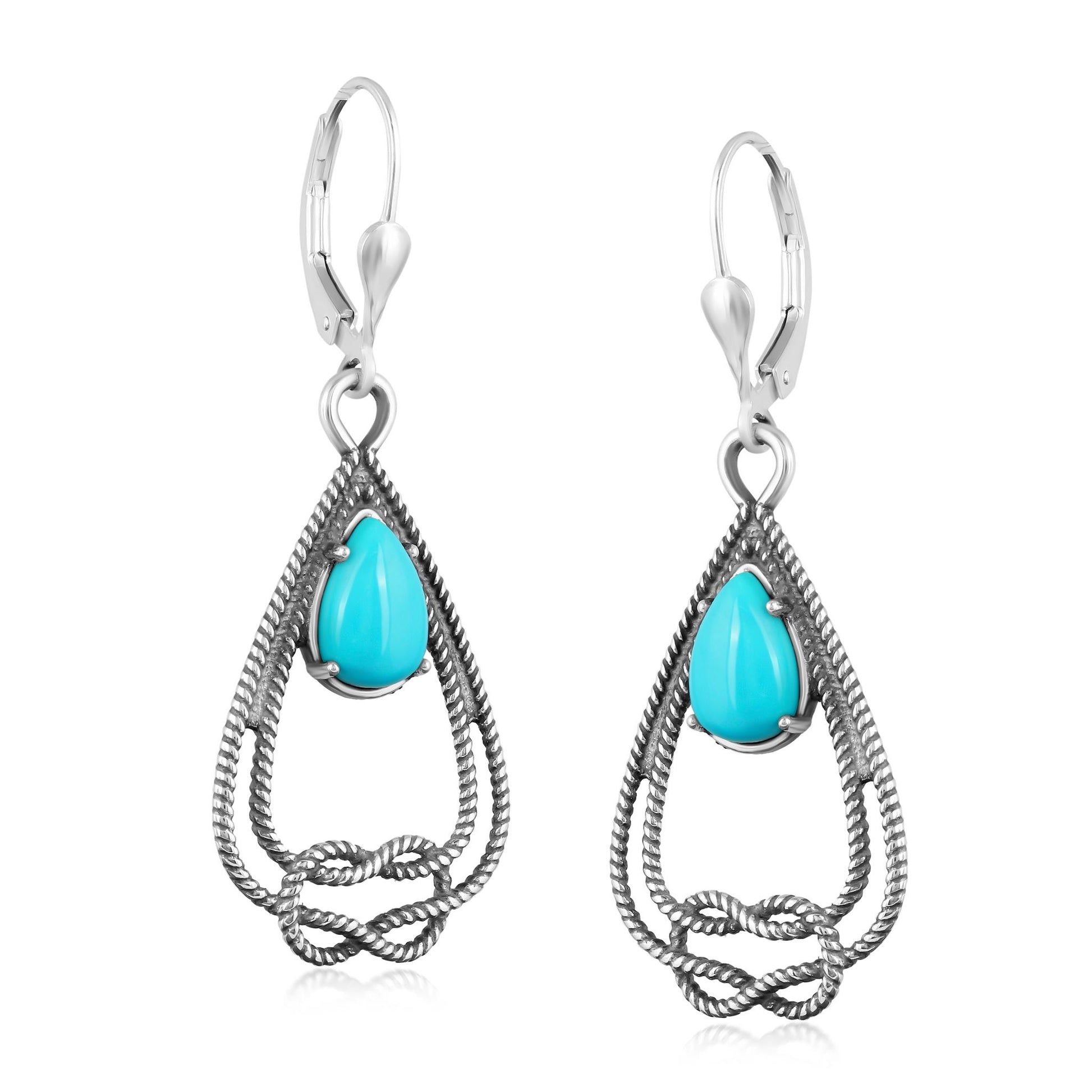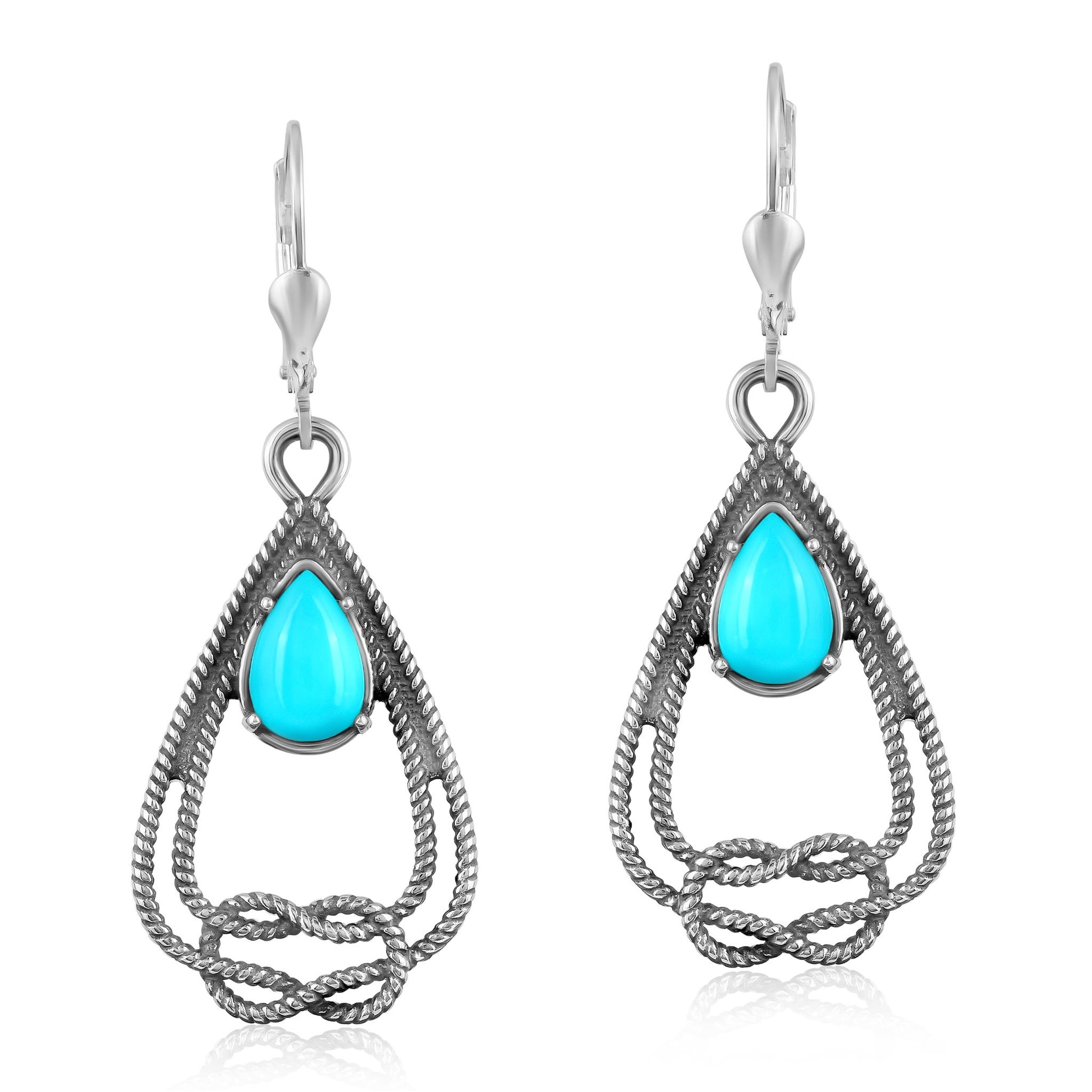 Bring beauty and a touch of romance to your day or evening look with this pair of dangle earrings that feature a stunning 6mm x 9mm pear-shaped, prong-set Kingman Turquoise cabochon. It is surrounded by oxidized Sterling Silver rope detailing and a Sterling Silver love knot. These earrings have secure leverback closures and are for pierced ears only. Turquoise is known to provide mental relaxation, stress reduction, confidence, and balance, while it attracts abundance and prosperity. In Native American lore, Turquoise is referred to as the Sky Stone, representing the eternal heavens, the life-giving sun and renewing rains. Kingman Turquoise is a highly regarded and historically significant type of Turquoise mined in Kingman, Arizona, one of the oldest and most productive Turquoise mines in the United States.