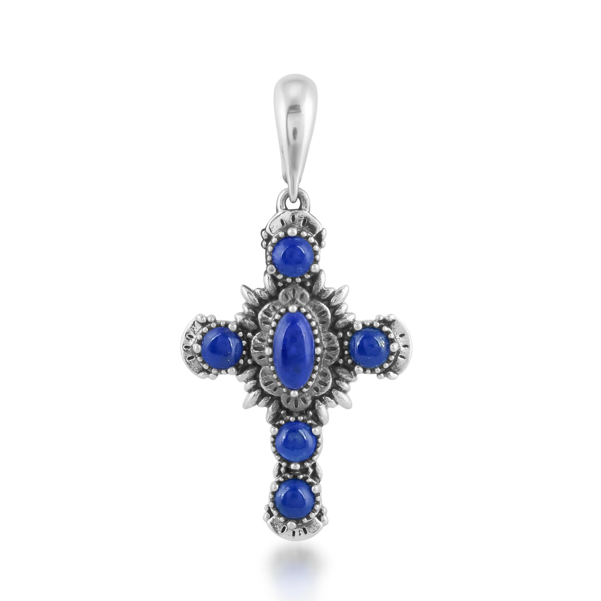 • Cross pendant enhancer with a center 4 x 8mm oval and (5) 4mm round-cut, prong-set Lapis cabochons; oxidized finish
