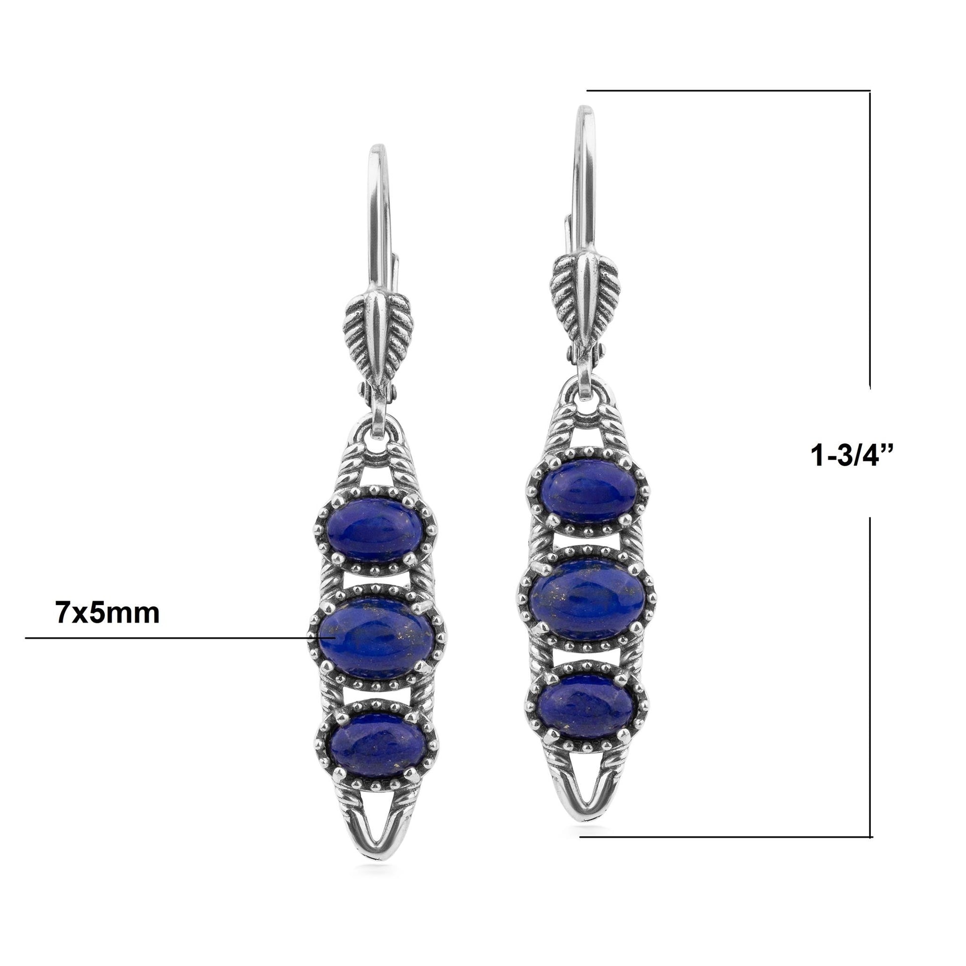 • Dangle earrings with three oval-cut Lapis cabochons (6x4mm and 7x5mm), oxidized, beaded accents; linear design