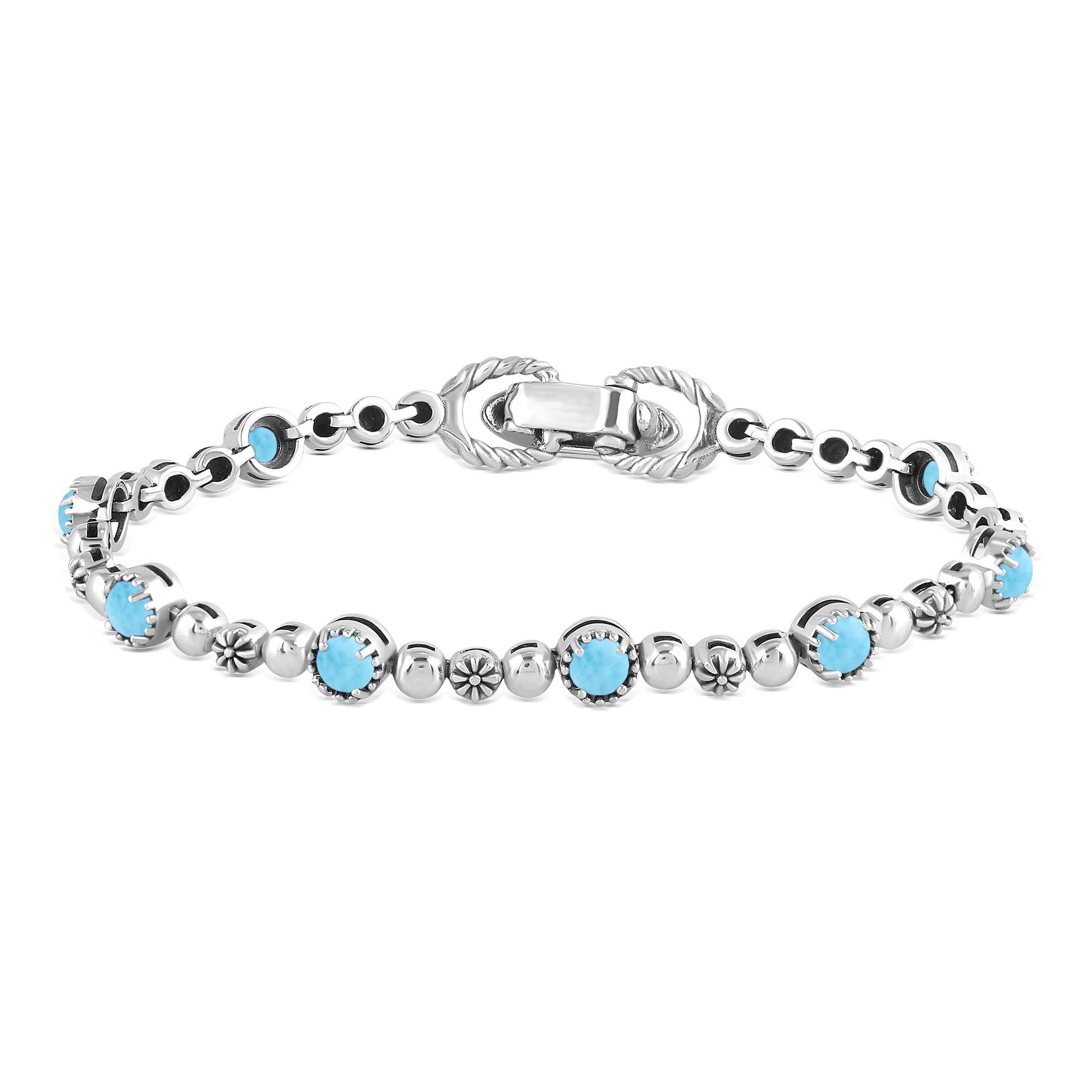 Showcase a wrist full of colorful gemstone cabochons when you don this Sterling Silver tennis bracelet. You will gesture with personality wearing this gorgeous piece outfitted with a selection of round, prong-set Larimar gemstones accented by oxidized, polished Sterling Silver beads and concha flowers which perfectly complement your everyday aesthetic. A fold-over clasp and textured rope Sterling Silver end loops complete the look. Larimar is associated with helping with communication and self-expression. Larimar is also thought to reduce stress, promote relaxation, and enhance emotional well-being. Every gemstone in the world is naturally unique, just like you! We carefully select the GIA certified gems for each piece, making your bracelet one-of-a-kind. You will find that this piece will elevate any outfit! Whether at work, a date night with your honey or a special party or event– American West Jewelry will get you noticed. Get ready for compliments!