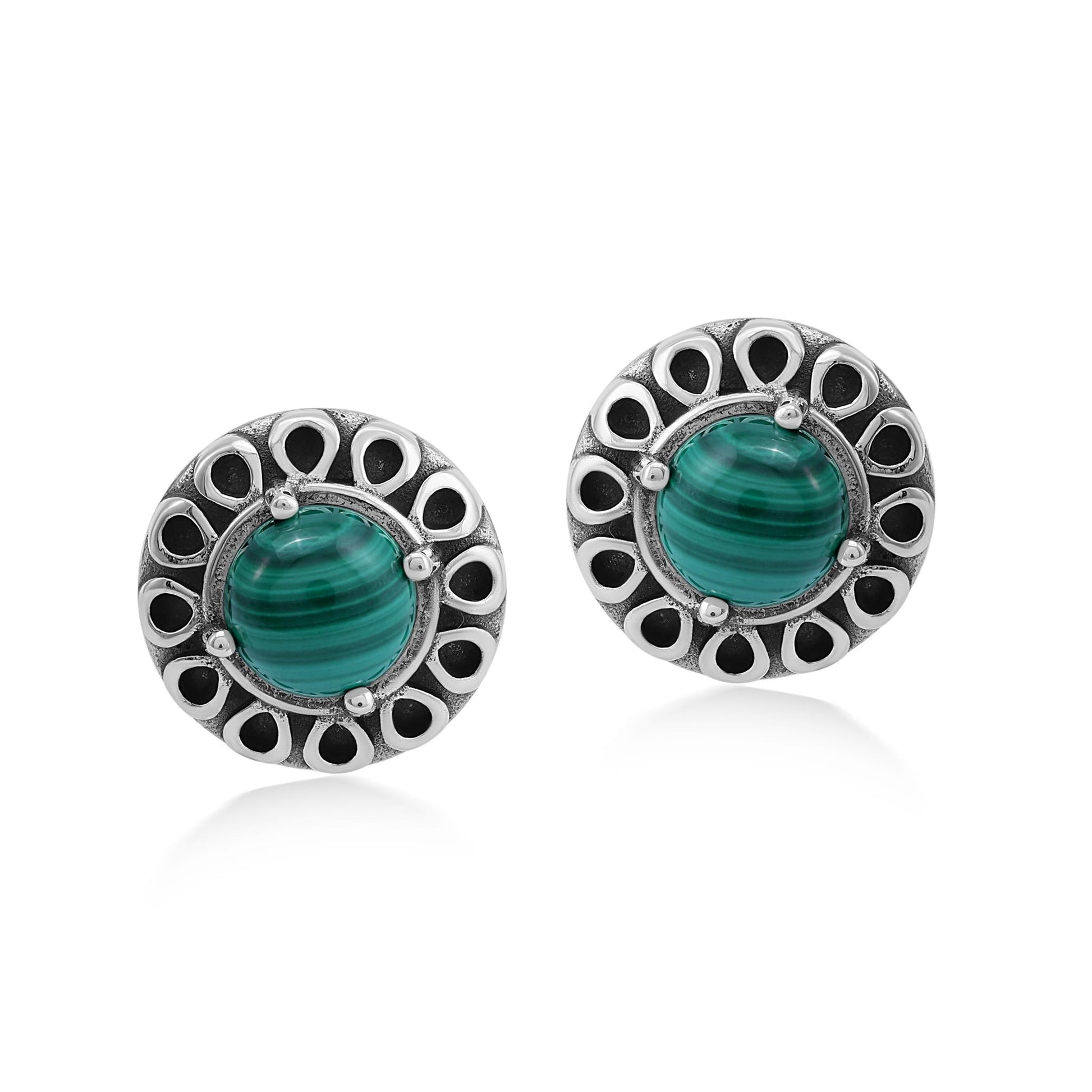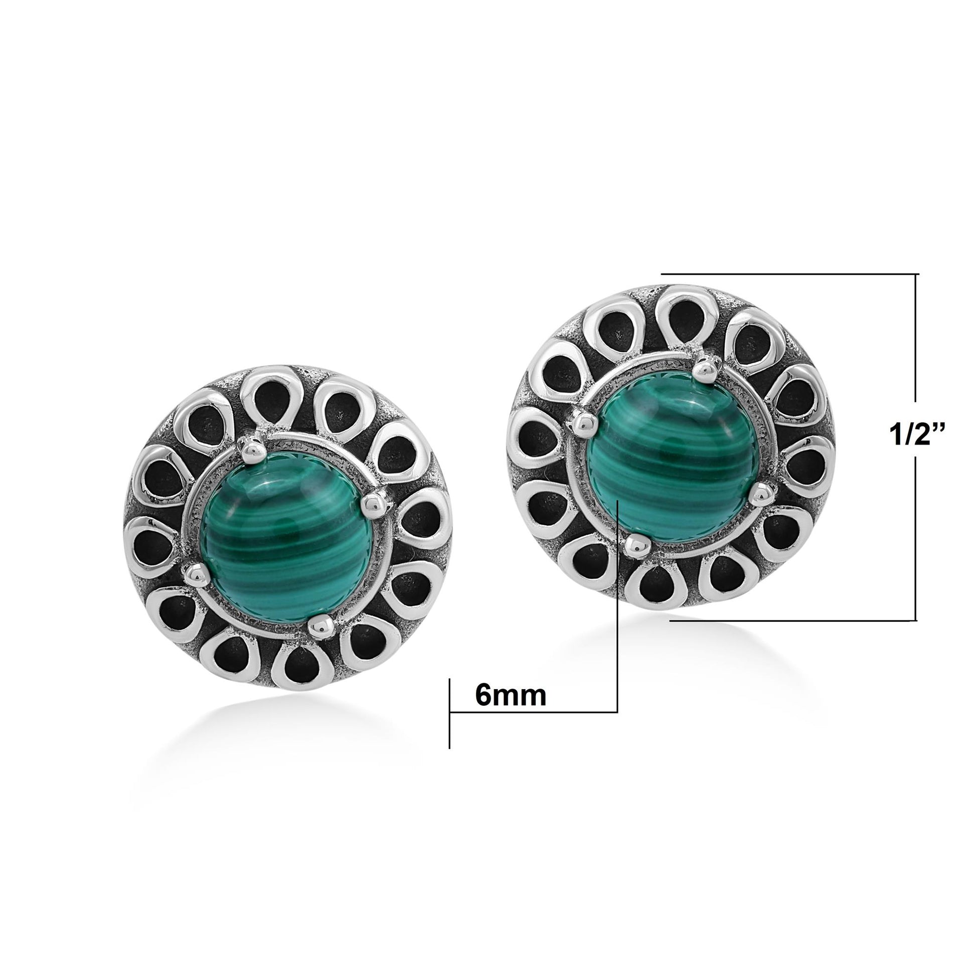 • Stud earrings feature sunburst designs; round, prong-set 6mm Malachite gemstones; slight oxidation to highlight the Sterling Silver details