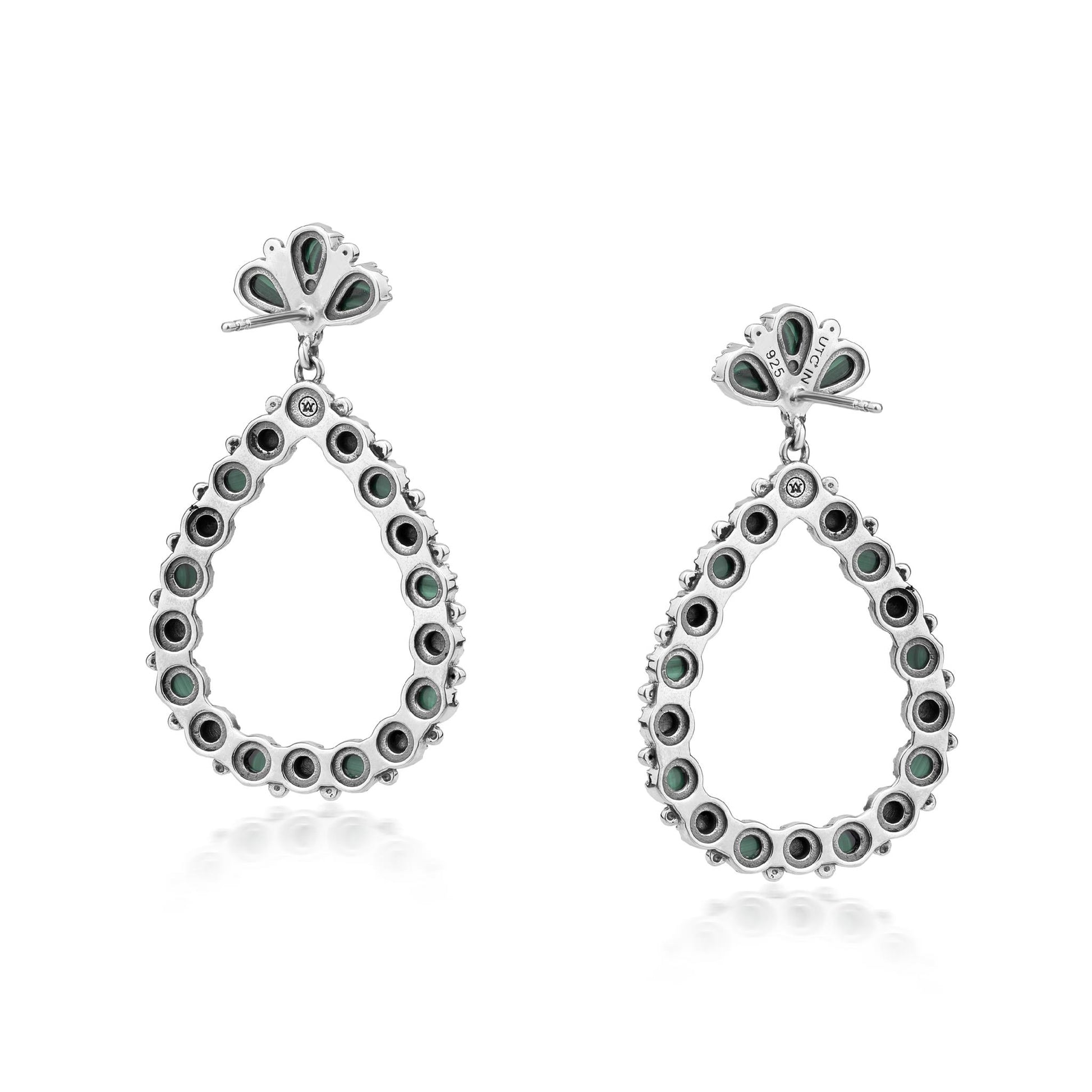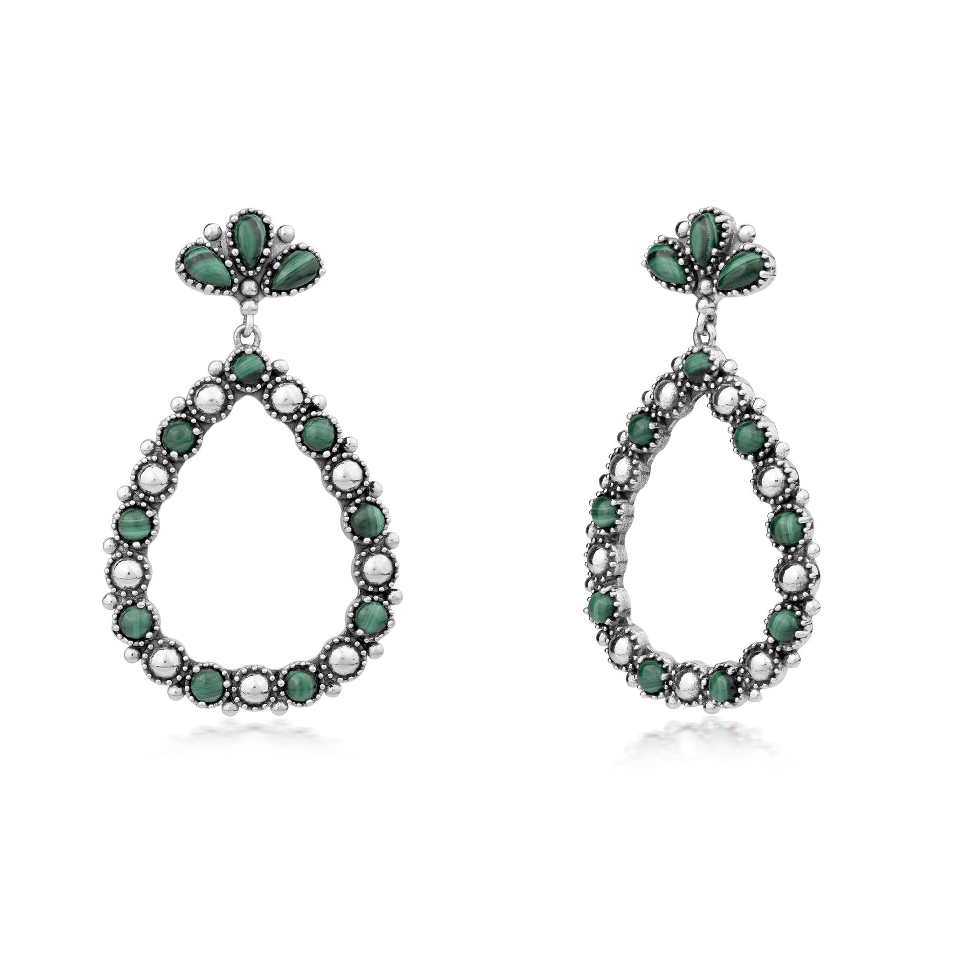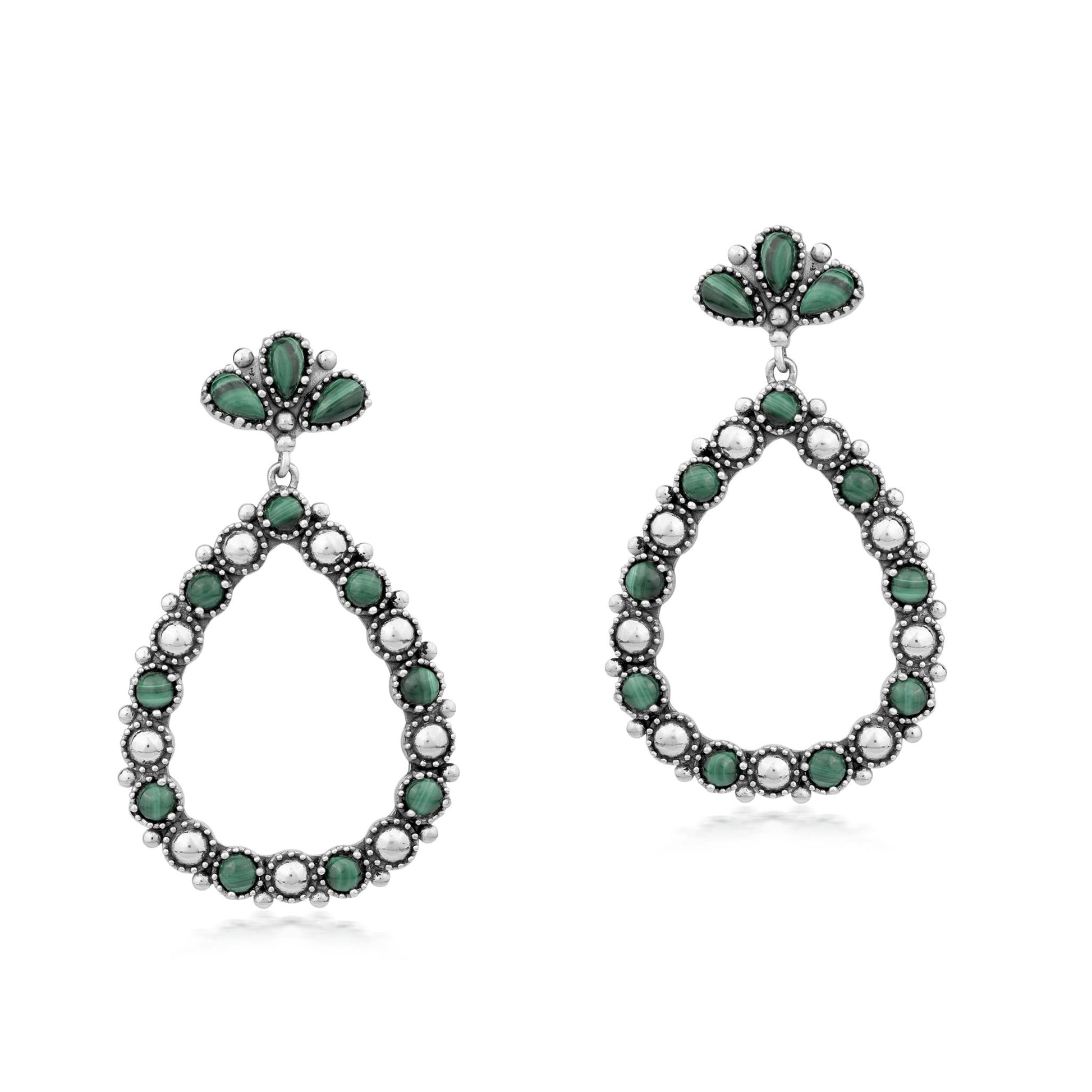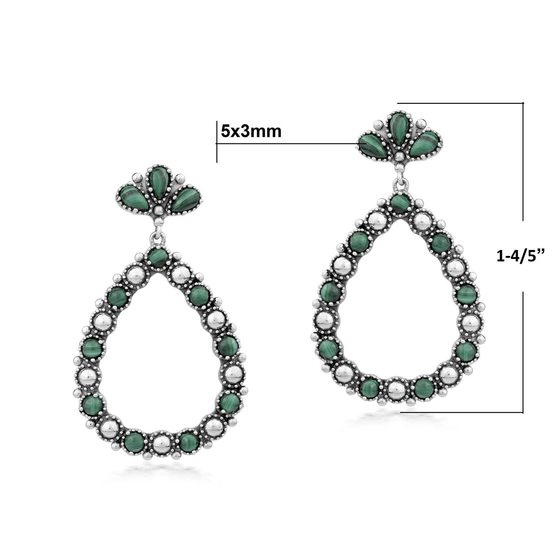 Stroll through your day in style with this pair of vibrant Sterling Silver dangle earrings that bring color and movement to your look. The open teardrop design and vibrant gemstones add personality for coffee catch-ups, celebrations, or everyday outings. A trio pf pear-cut Malachite cabochons adorn each post, enhanced by oxidized, beaded accents. Beneath them hangs an open teardrop encrusted with 36 (total) round cabochons, all in a beaded setting. These bright green hues evoke the gorgeous Palo Verde trees of the desert Southwest, all in a single glance. Post and oversized clutches hold these stunners securely and comfortably in place. Every gemstone in the world is naturally unique, just like you! We carefully select the GIA certified gems for each piece, making your earrings one-of-a-kind. You will find that they will elevate any outfit! Whether at work, a date night with your honey or a special party or event– American West Jewelry will get you noticed. Get ready for compliments!