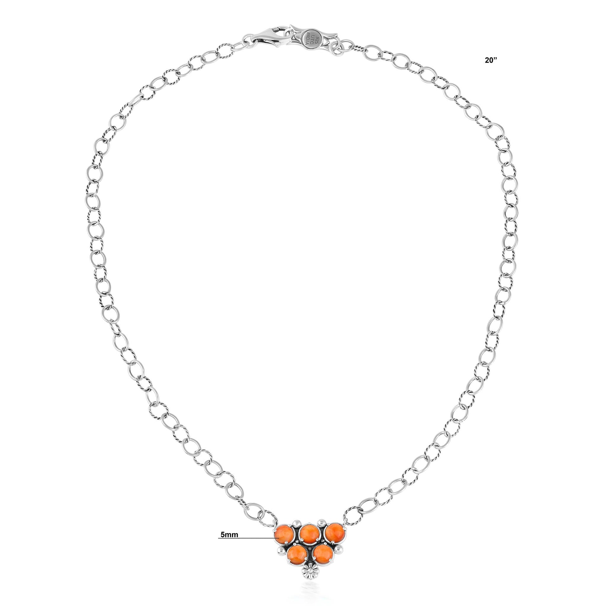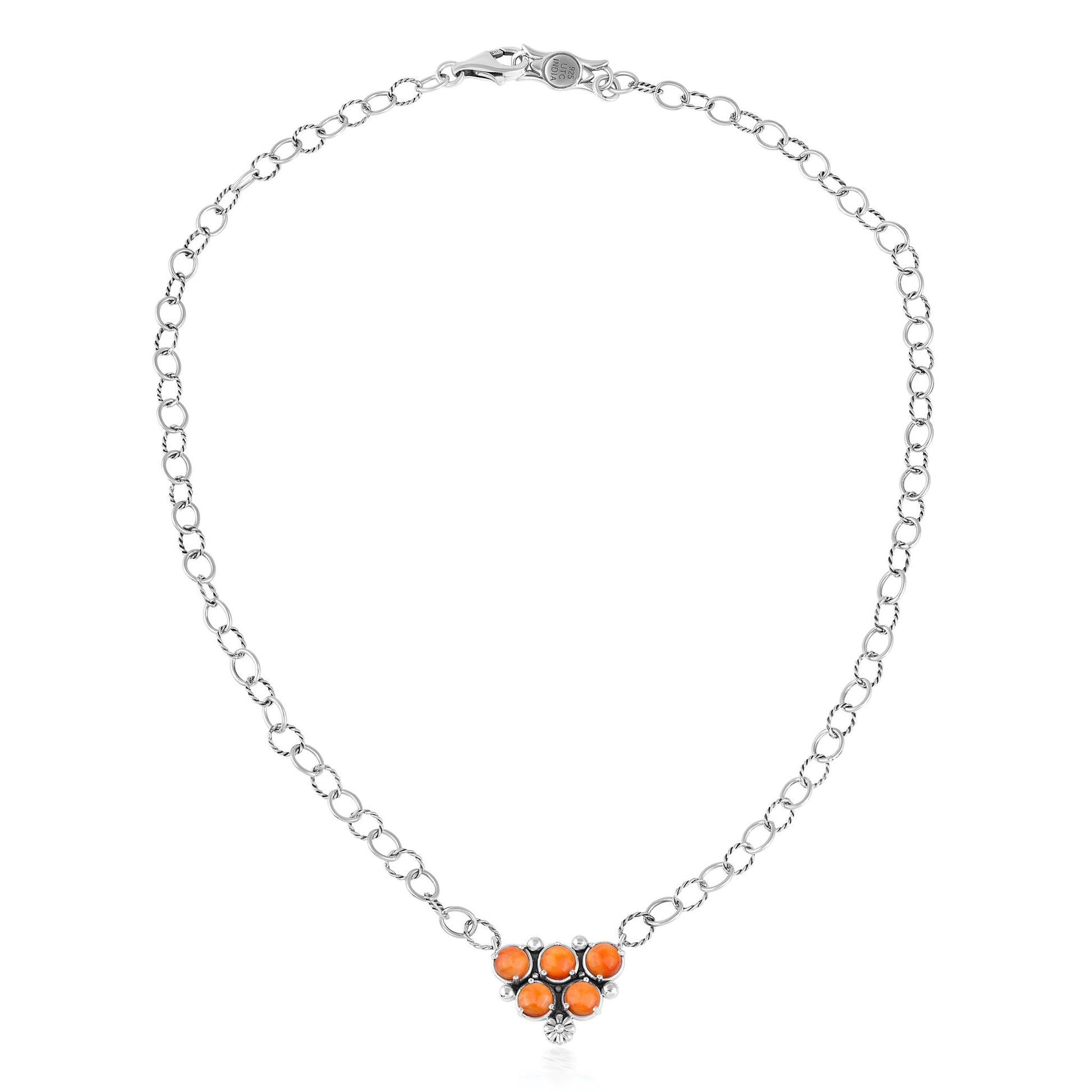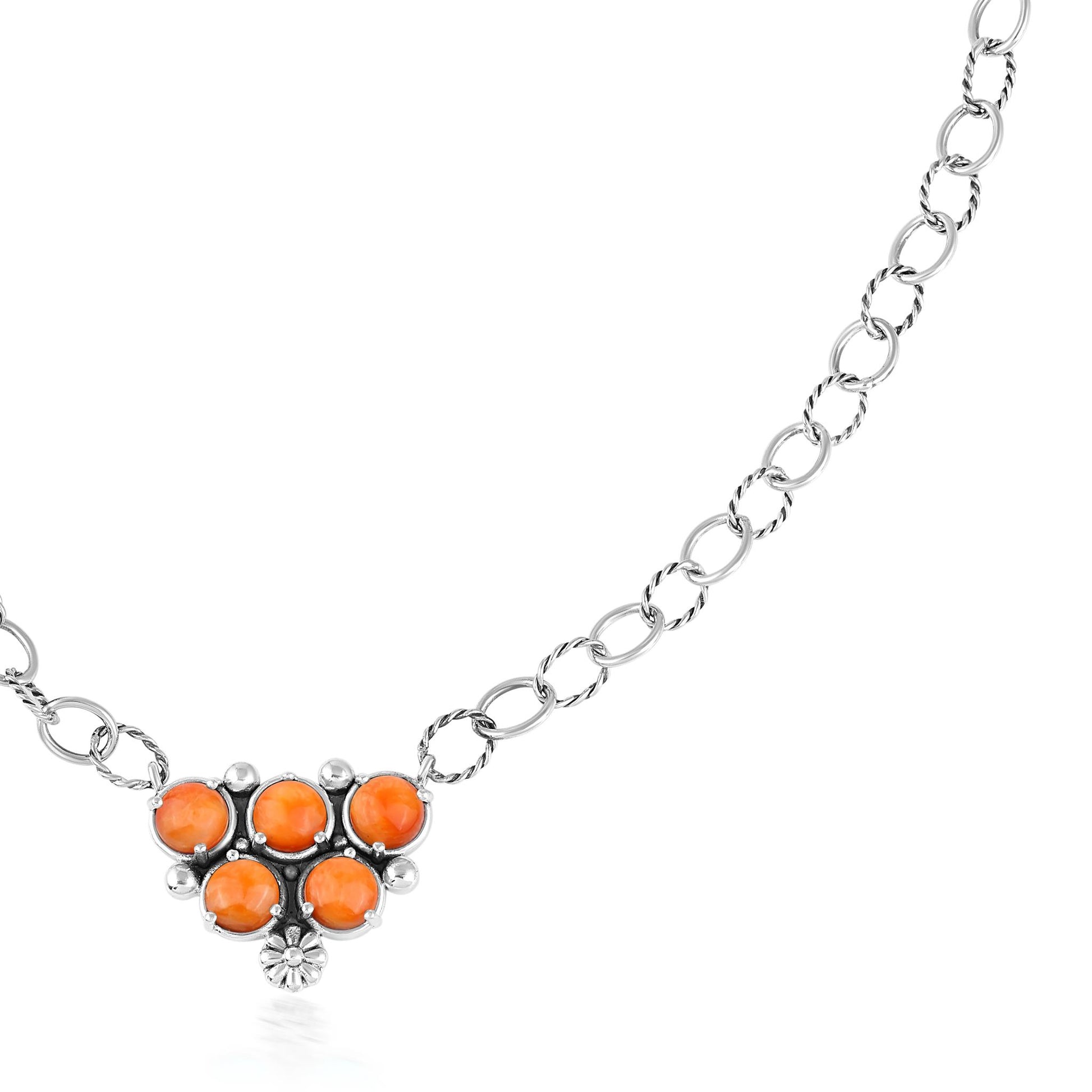 • Sterling Silver necklace with center cluster of 5 round 5mm Orange Spiny Oyster cabochons; oval textured link chain; oxidized finish