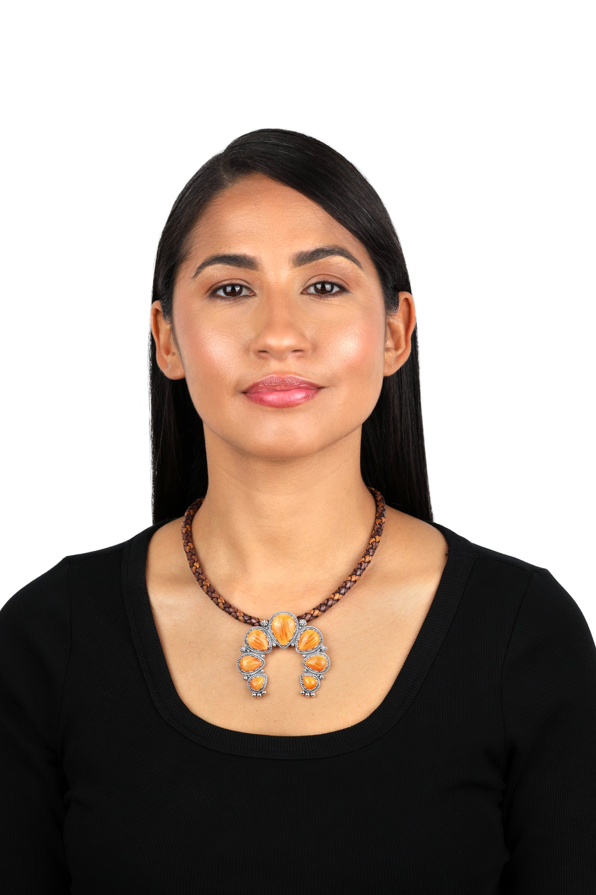 Add a dash of Southwest flair to your outfit when you rock this eye-catching enhancer, flaunting pear-shaped Orange Spiny Oyster gemstone cabochons in a naja shape with whimsical concha accents and an oxidized finish. It features 7 pear-shaped gemstone cabochons graduated in size, concha and beaded accents, a hidden bail, and a polished, oxidized finish. This gorgeous pendant measures approximately 2"W x 2"L. Like other earth-toned materials, Orange Spiny Oyster is seen as a grounding force that can help bring stability during times of change or emotional upheaval. Every gemstone in the world is naturally unique, just like you! We carefully select the GIA certified gems for each piece, making your enhancer one-of-a-kind. You will find that this piece will elevate any outfit! Whether at work, a date night with your honey or a special party or event– American West Jewelry will get you noticed. Get ready for compliments!