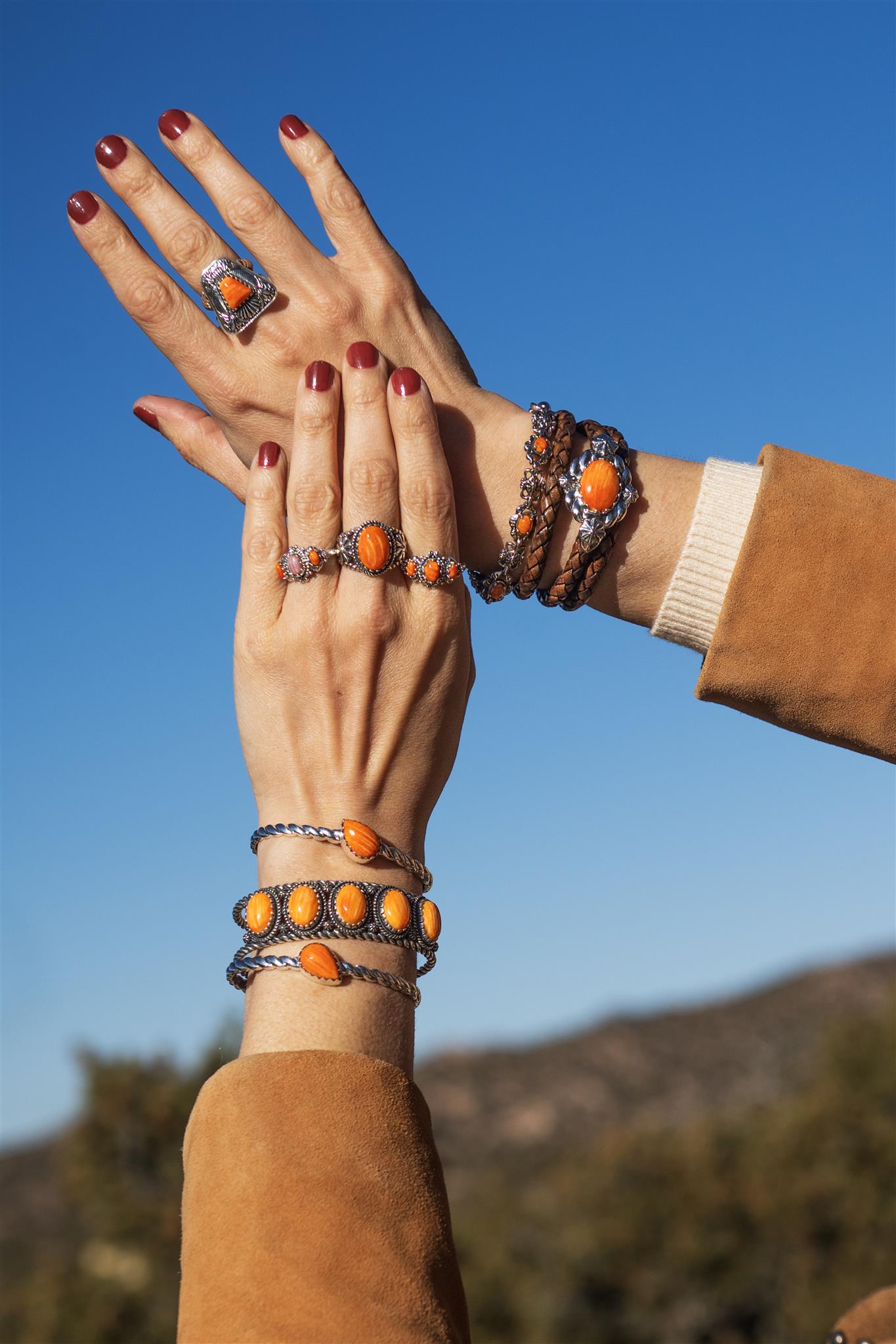 Worn alone or paired with other favorite bangles, this Sterling Silver cuff bracelet is a stand-out beauty. The twisted rope design cast into the narrow Sterling Silver cuff combines with the stunning pear-cut Orange Spiny Oyster cabochon for a look that is both understated and dramatic. The gemstone cabochon is set in a serrated bezel which adds additional texture and character to this piece. Orange Spiny Oyster symbolizes the life that flourished in the mystical oceans, far away from the desert Southwest. Every gemstone in the world is naturally unique, just like you! We carefully select the GIA certified gems for each piece, making your bracelet one-of-a-kind. You will find that this bracelet will elevate any outfit! Whether at work, a date night with your honey or a special party or event– American West Jewelry will get you noticed. Get ready for compliments!