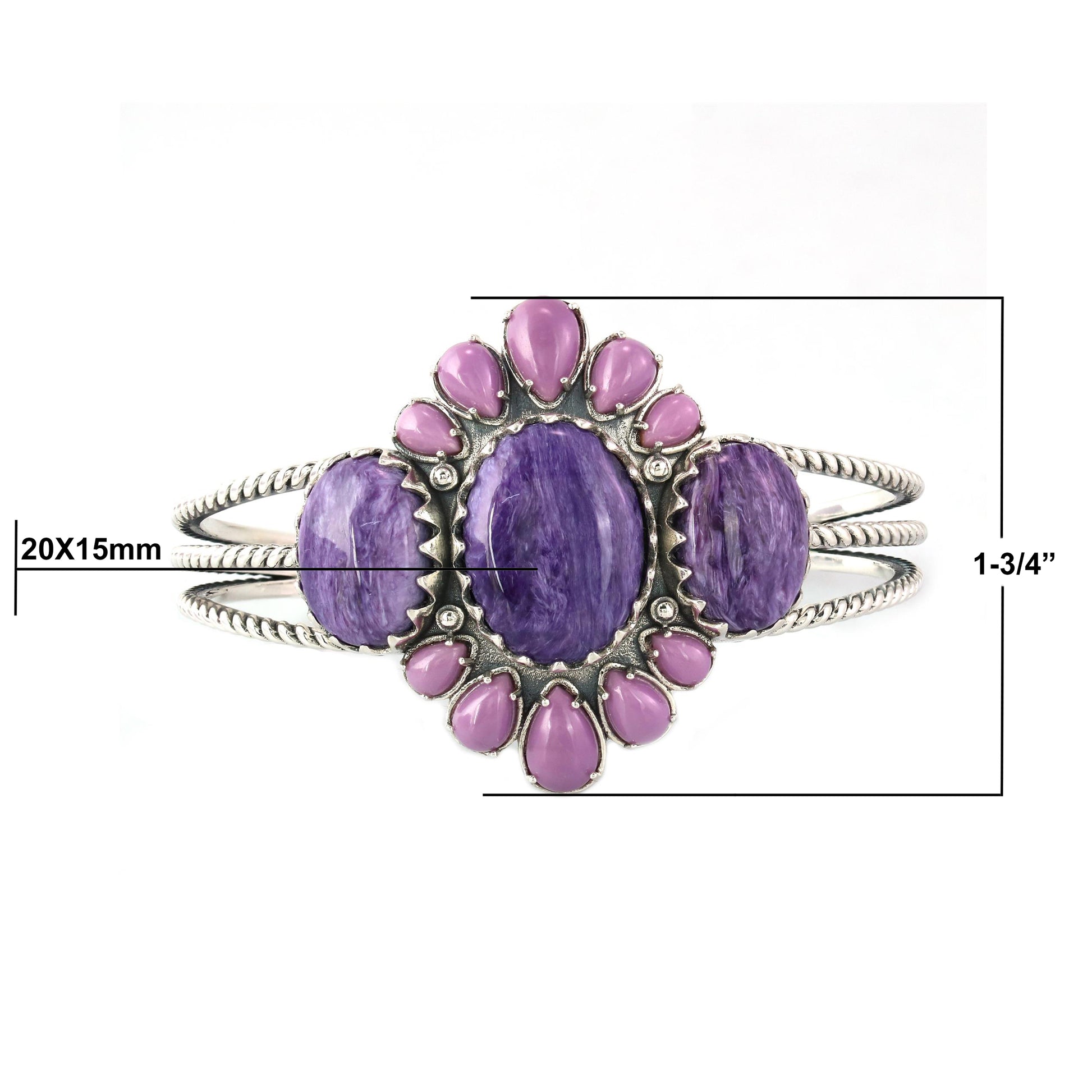 Slip on a touch of elegance with this Sterling Silver cuff, showcasing 3 beautiful Oval Charoite gemstone cabochons set in serrated bezels surrounded by 10 pear-cut Phosphosiderite gemstones graduating in size. The assortment of gorgeous violet-hued stones add a kick of vibrant color to your wrist. Intricate etchings and three-row rope shoulders add a unique flair to this striking piece, making it sure to complement any outfit. We carefully select the GIA certified gems for each piece, making your bracelet one-of-a-kind. You will find that this bracelet will elevate any outfit! Whether at work, a date night with your honey or a special party or event– American West Jewelry will get you noticed. Get ready for compliments!