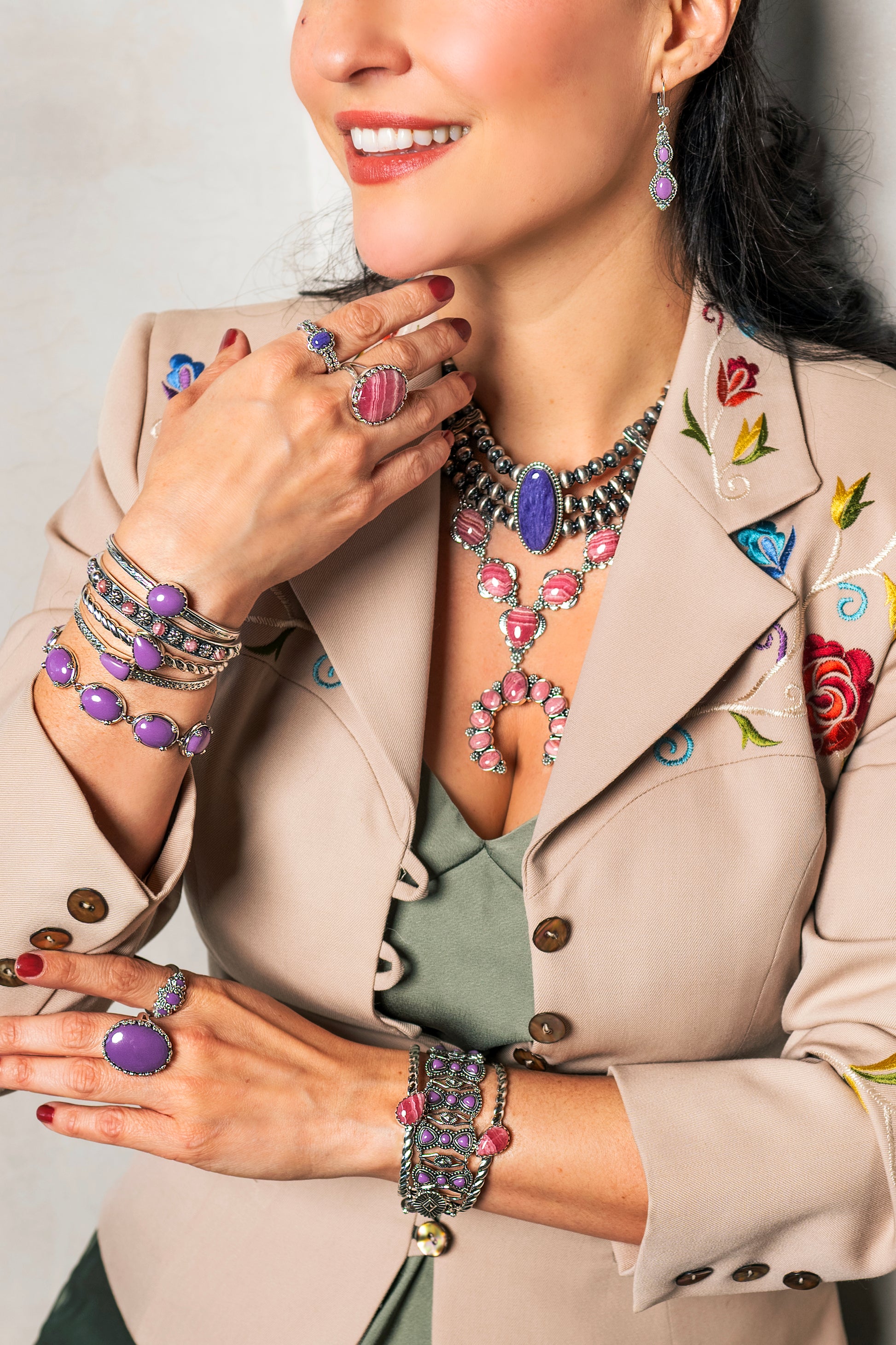 Accessorize with intention and meaning in this richly toned gemstone cabochon link bracelet. Your bold personality deserves this beautiful Phosphosiderite stunner, detailed with concha flower prongs and accents and secured with a rope designed toggle clasp. It features oval 16mm x 12mm Phosphosiderite cabochons set in oxidized, polished .925 Sterling Silver. Phosphosiderite is associated with the heart chakra. It helps open the heart to love, compassion, and forgiveness, and enhances one’s ability to connect with others on an emotional level. Every gemstone in the world is naturally unique, just like you! We carefully select the GIA certified gems for each piece, making your bracelet one-of-a-kind. You will find that this piece will elevate any outfit! Whether at work, a date night with your honey or a special party or event– American West Jewelry will get you noticed. Get ready for compliments!