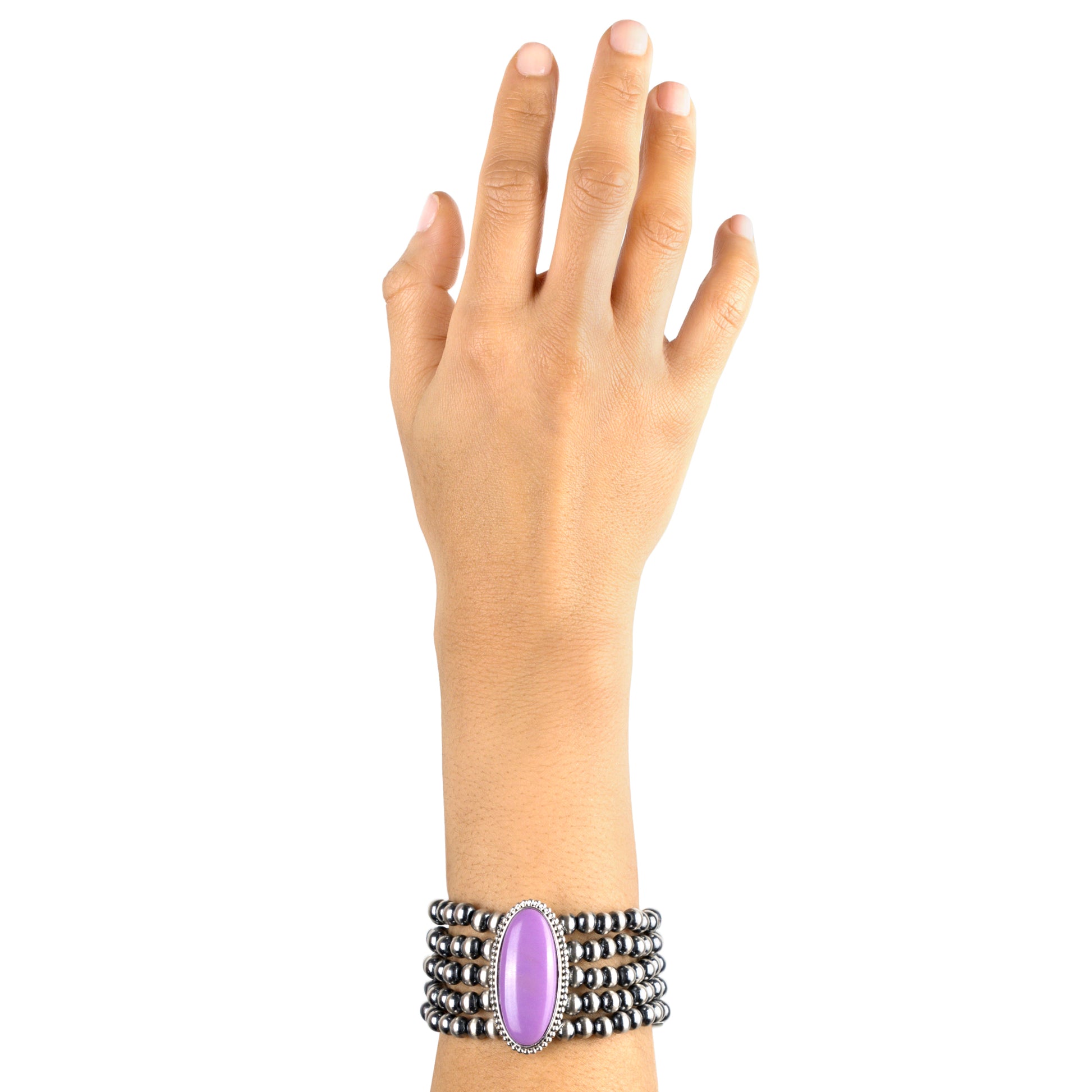 Enigmatic and elegant, this Sterling Silver bracelet's main attraction is a bold 16mm x 36mm oval Phosphosiderite gemstone cabochon with a beaded bezel frame. 5 rows of oxidized, polished 6mm Sterling Silver beads complete the look that is the embodiment of stop-and-stare Southwestern style. This unique stunner is fastened with a toggle clasp, which is both textured and secure. Phosphosiderite gemstone is known to help open the heart to love, compassion, and forgiveness, and enhances one’s ability to connect with others on an emotional level. Every gemstone in the world is naturally unique, just like you! We carefully select every GIA certified gem, making your bracelet one-of-a-kind. You will find it will elevate any outfit! Whether at work, a date night with your honey or a special party or event– American West Jewelry will get you noticed. Get ready for compliments!