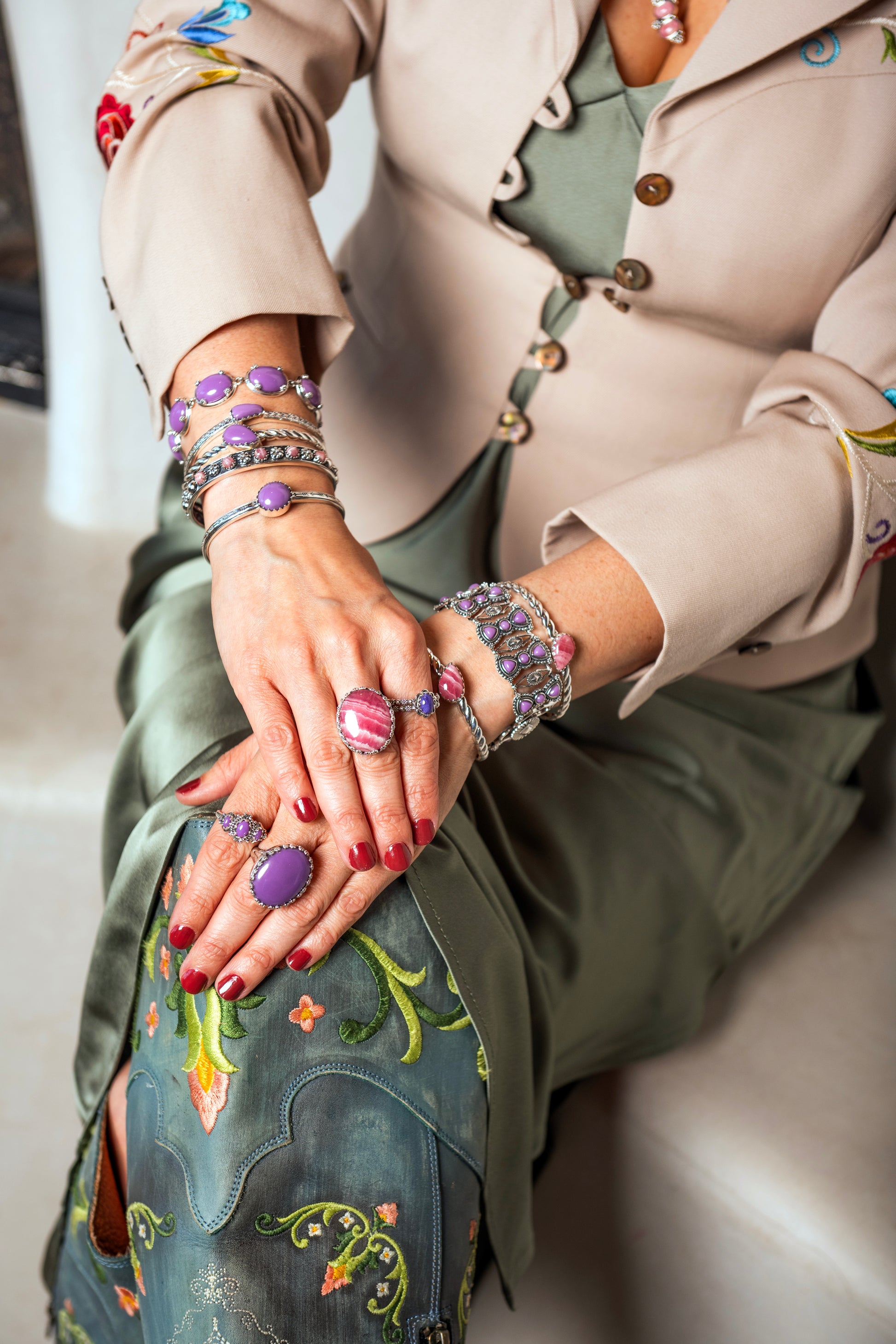 Fresh pick! We love how this triple-row geometric design and gemstone piece plays off a floral-print top or garden party dress. This stunning Sterling Silver bracelet is designed in an elaborate openwork design pattern, with a triple-row of genuine gemstone cabochons set in a frame of textured, oxidized Sterling Silver, in a bezel setting with beaded and rope detailing. The top and bottom gemstone rows feature 5mm trillion cut Phosphosiderite cabochons, with a 4mm round Phosphosiderite stone set between each. The fold-over clasp provides a secure closure. Phosphosiderite gemstone is known to help open the heart to love, compassion, and forgiveness, and enhances one’s ability to connect with others on an emotional level. Every gemstone in the world is naturally unique, just like you! We carefully select the GIA certified gems for each piece, making your bracelet one-of-a-kind. You will find that this bracelet will elevate any outfit! Whether at work, a date night with your honey or a special party or event– American West Jewelry will get you noticed. Get ready for compliments!