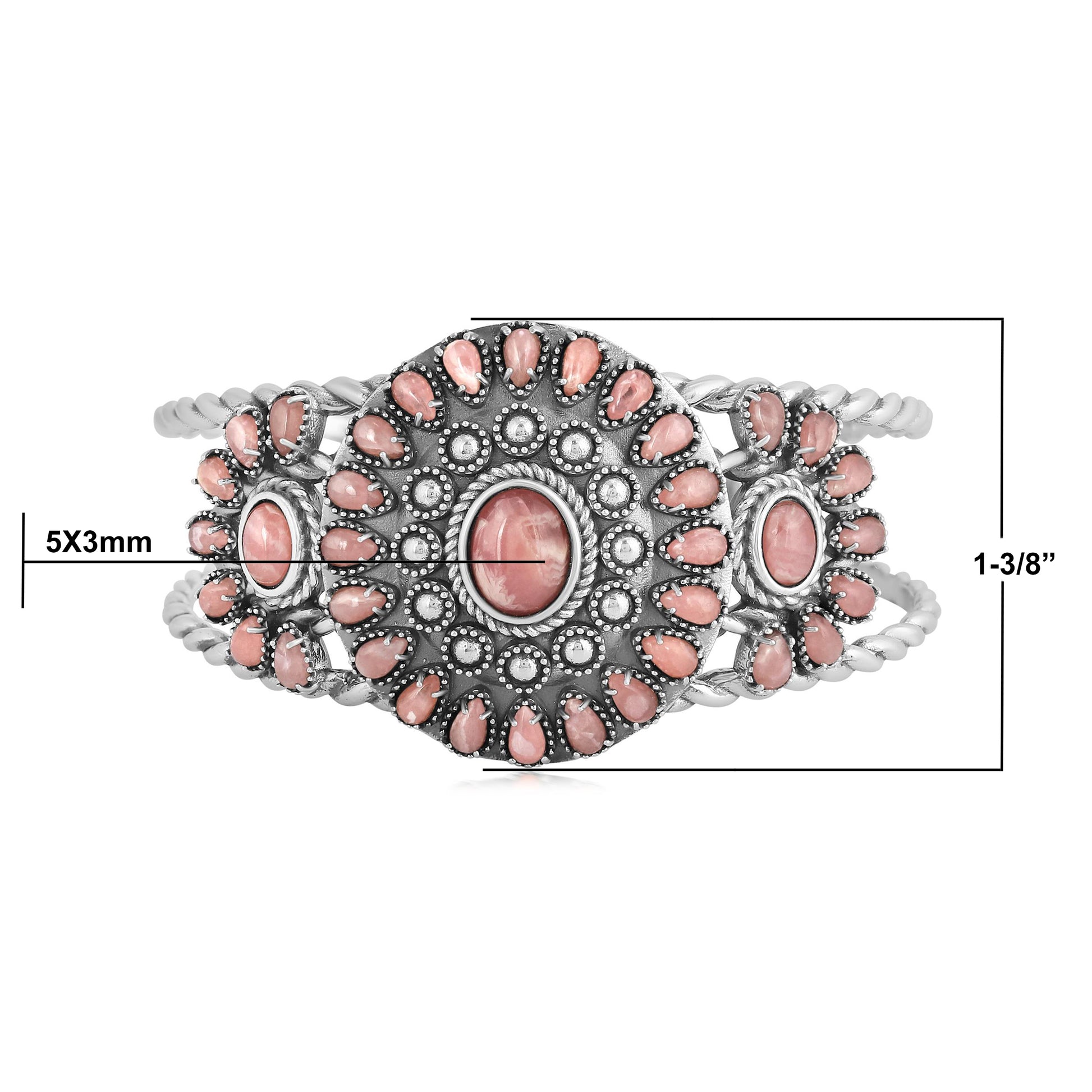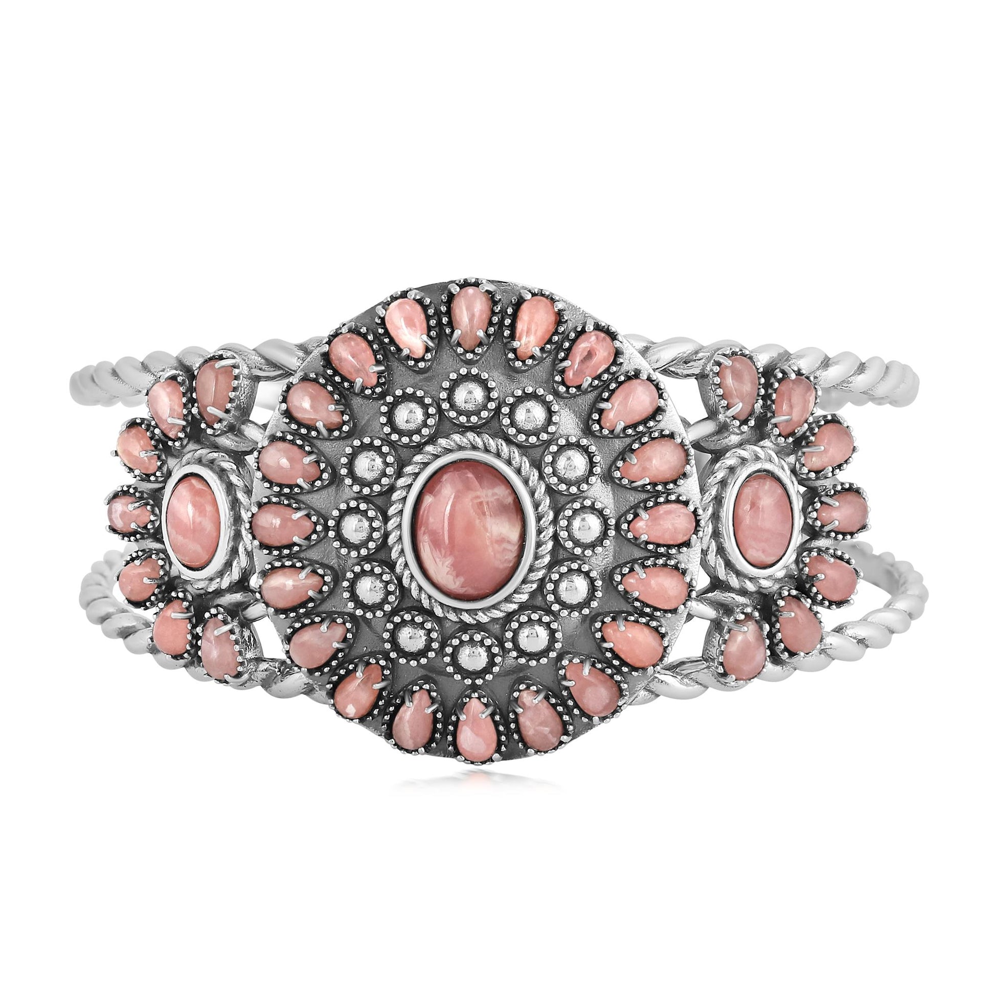 This statement cluster cuff is stunning with oval-shaped gemstone cabochons surrounded by an array of pear-shaped gemstone cabochons. It features 3 bezel-set, oval-shaped Rhodochrosite cabochons at the center of each of the 3 clusters, surrounded by a total of 34 pear-shaped, prong-set Rhodochrosite gemstone cabochons. The oxidized genuine Sterling Silver has added rope and bead detailing and open shoulders, making this colorful cuff an inspirational show-stopper. Rhodochrosite is cherished for its connection to love, compassion, and emotional healing, as well as its ability to inspire joy and positivity. Every gemstone in the world is naturally unique, just like you! We carefully select the GIA certified gems for each piece, making your bracelet one-of-a-kind. You will find that this piece will elevate any outfit! Whether at work, a date night with your honey or a special party or event– American West Jewelry will get you noticed. Get ready for compliments!