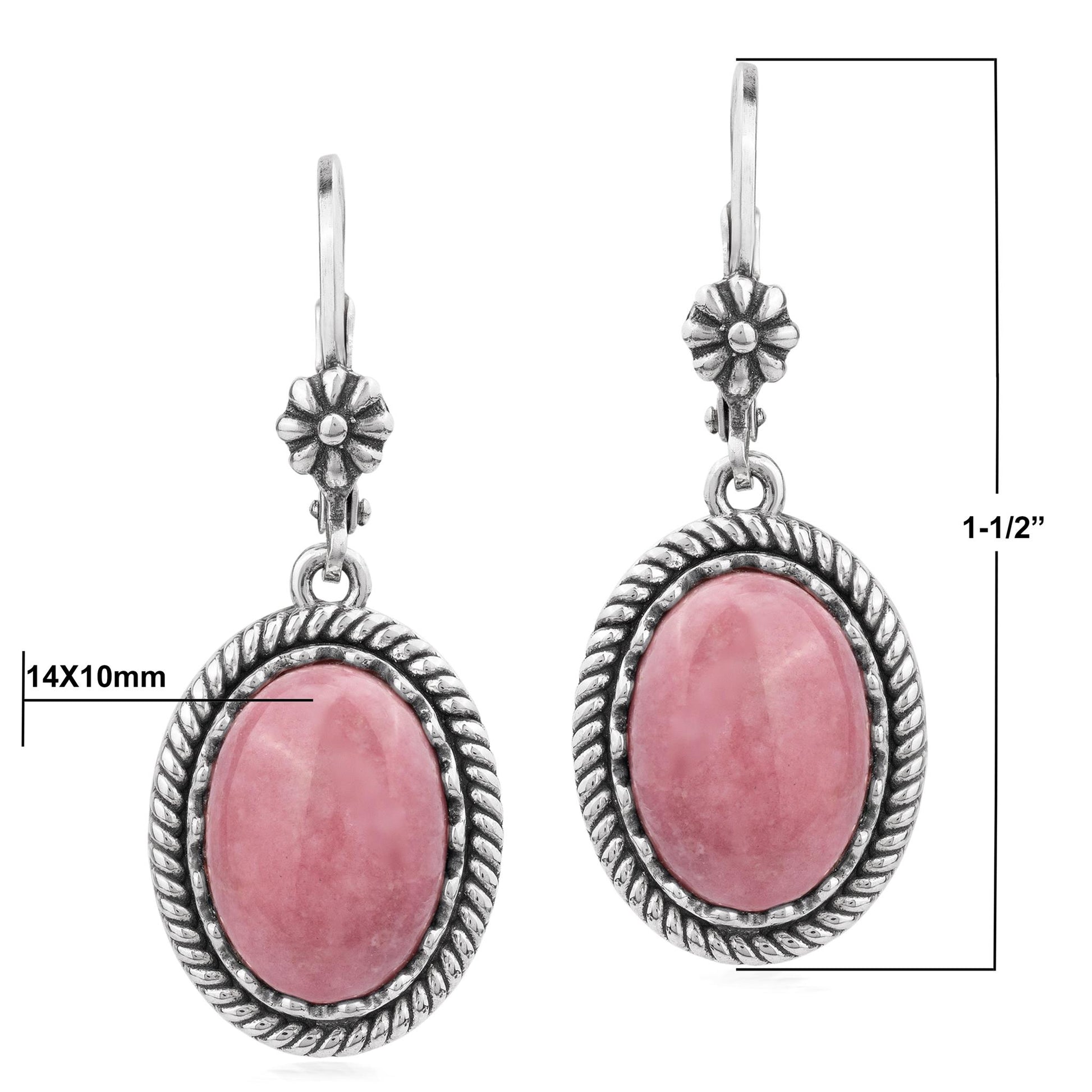 These concha detailed oval gemstone earrings give your daily denim and everyday dresses a fresh perspective. The stars of the show are a stunning pair of 14mm x 10mm Rhodonite cabochons. They are set in serrated bezels and accented with rope detailing and concha flower accents below the lever back closures. Rhodonite promotes a sense of inner calm, self-worth, peace, happiness, joy, and laughter. This pink-hued gemstone helps achieve your greatest potential. Every gemstone in the world is naturally unique, just like you! We carefully select the GIA certified gems for each piece, making your earrings one-of-a-kind. You will find they will elevate any outfit! Whether at work, a date night with your honey or a special party or event– American West Jewelry will get you noticed. Get ready for compliments!