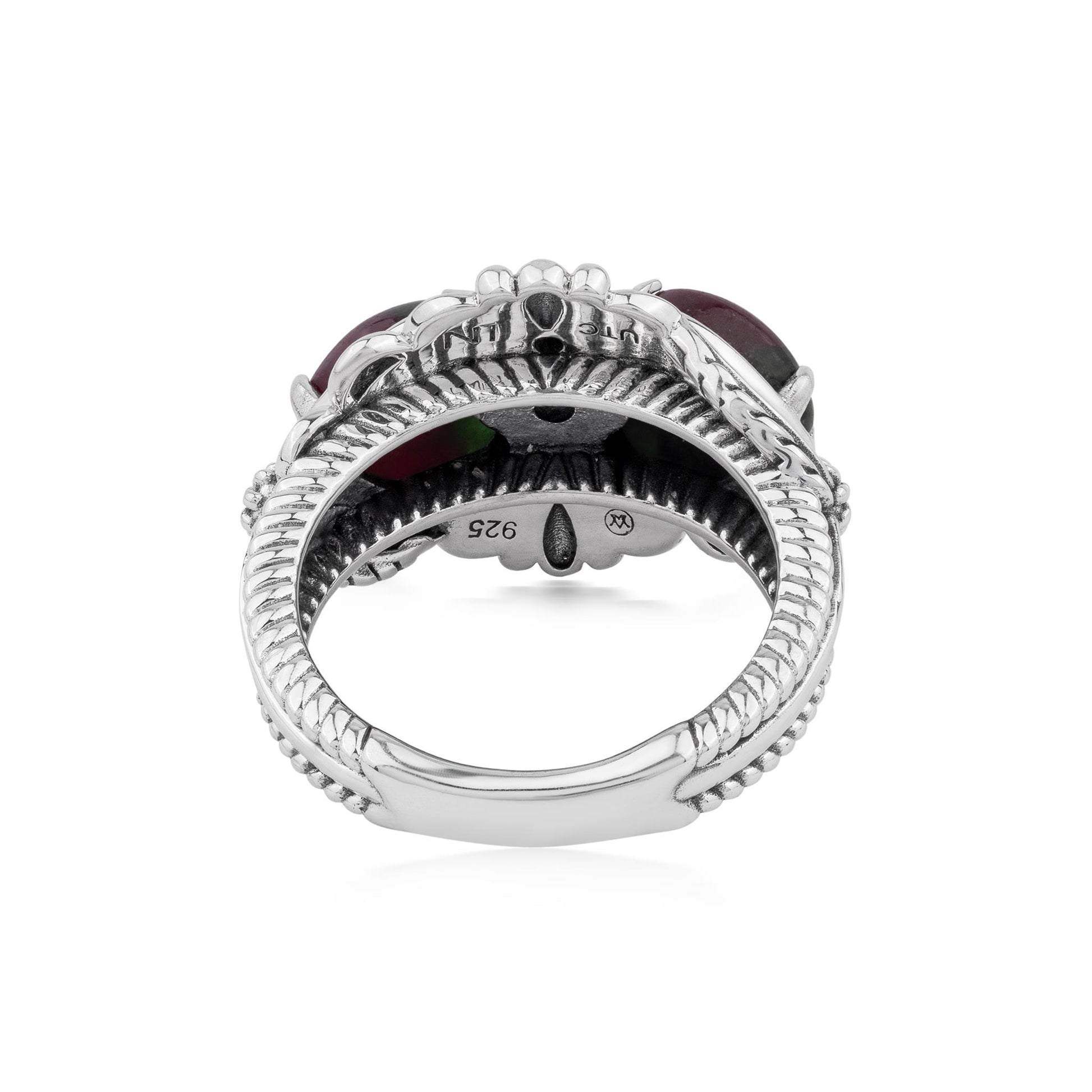 Isn't it romantic? The double heart represents eternal or everlasting love, unity, and deep affection, and this enchanting ring is the perfect symbol of harmony and emotional connection. It starts with two prong-set heart-shaped Ruby Zoisite cabochons at its center, and is framed by leaf and rope detailing with concha flower and beaded accents. The split-shank band is textured in a double rope design and tapers in the back for comfort. Ruby Zoisite offers the energy of happiness, appreciation, abundance, vitality, and growth, promoting emotional healing and a connection to the spiritual realm. Every gemstone in the world is naturally unique, just like you! We carefully select the GIA certified gems for each piece, making your ring one-of-a-kind. You will find it will elevate any outfit! Whether at work, a date night with your honey or a special party or event– American West Jewelry will get you noticed. Get ready for compliments!