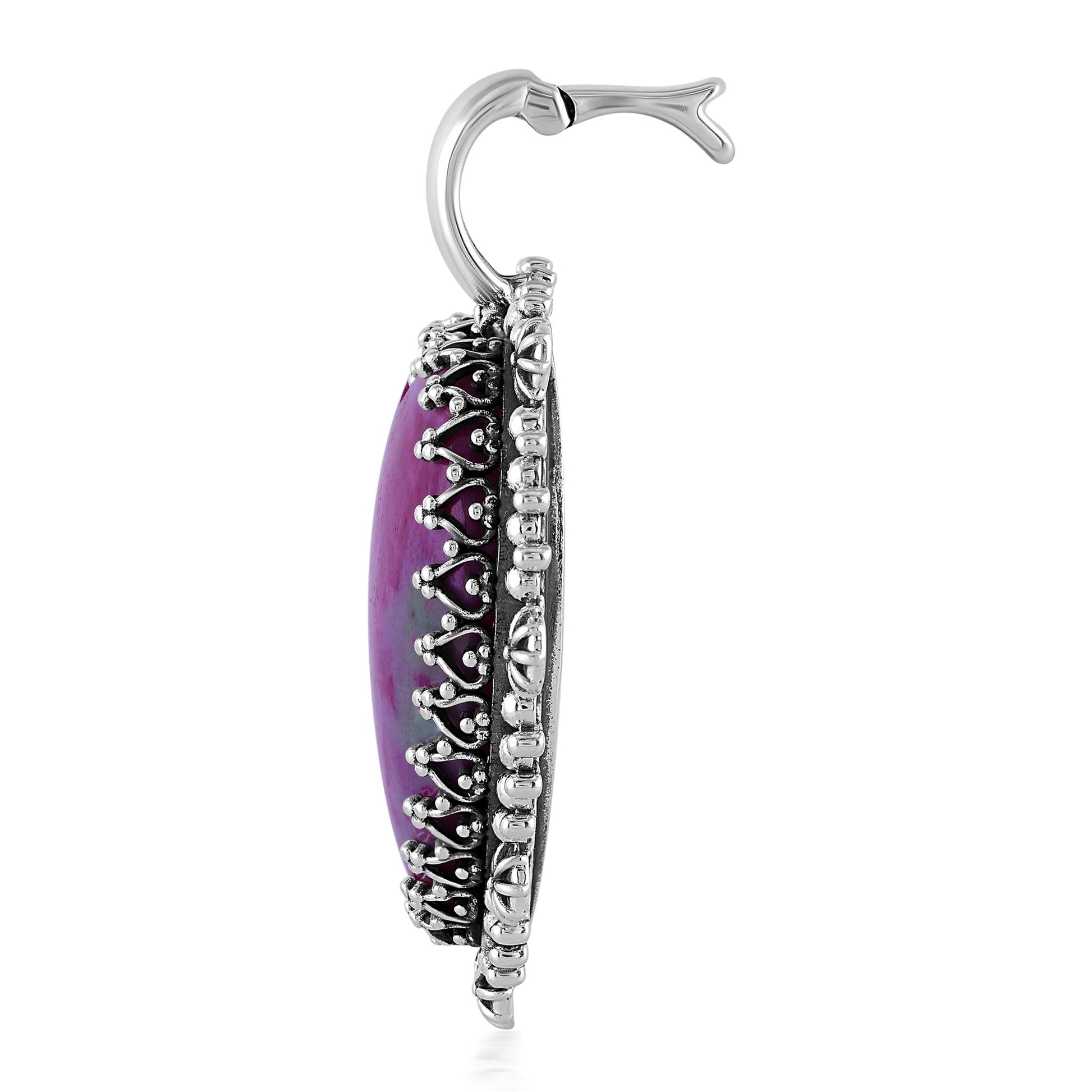 Why wear your heart on your sleeve when you can wear it around your neck? This stunning heart enhancer puts a romantic finishing touch on any look. At the center is a 35mm Ruby Zoisite cabochon. It is set in a serrated bezel and then edged with oxidized beading and flower details. A polished top hinged bail opens easily and accommodates most chains or cords up to 8.5mm in width. Ruby Zoisite offers the energy of happiness, appreciation, abundance, vitality, and growth, promoting emotional healing and a connection to the spiritual realm. Every gemstone in the world is naturally unique, just like you! We carefully select the GIA certified gems for each piece, making your enhancer one-of-a-kind. You will find it will elevate any outfit! Whether at work, a date night with your honey or a special party or event– American West Jewelry will get you noticed. Get ready for compliments!