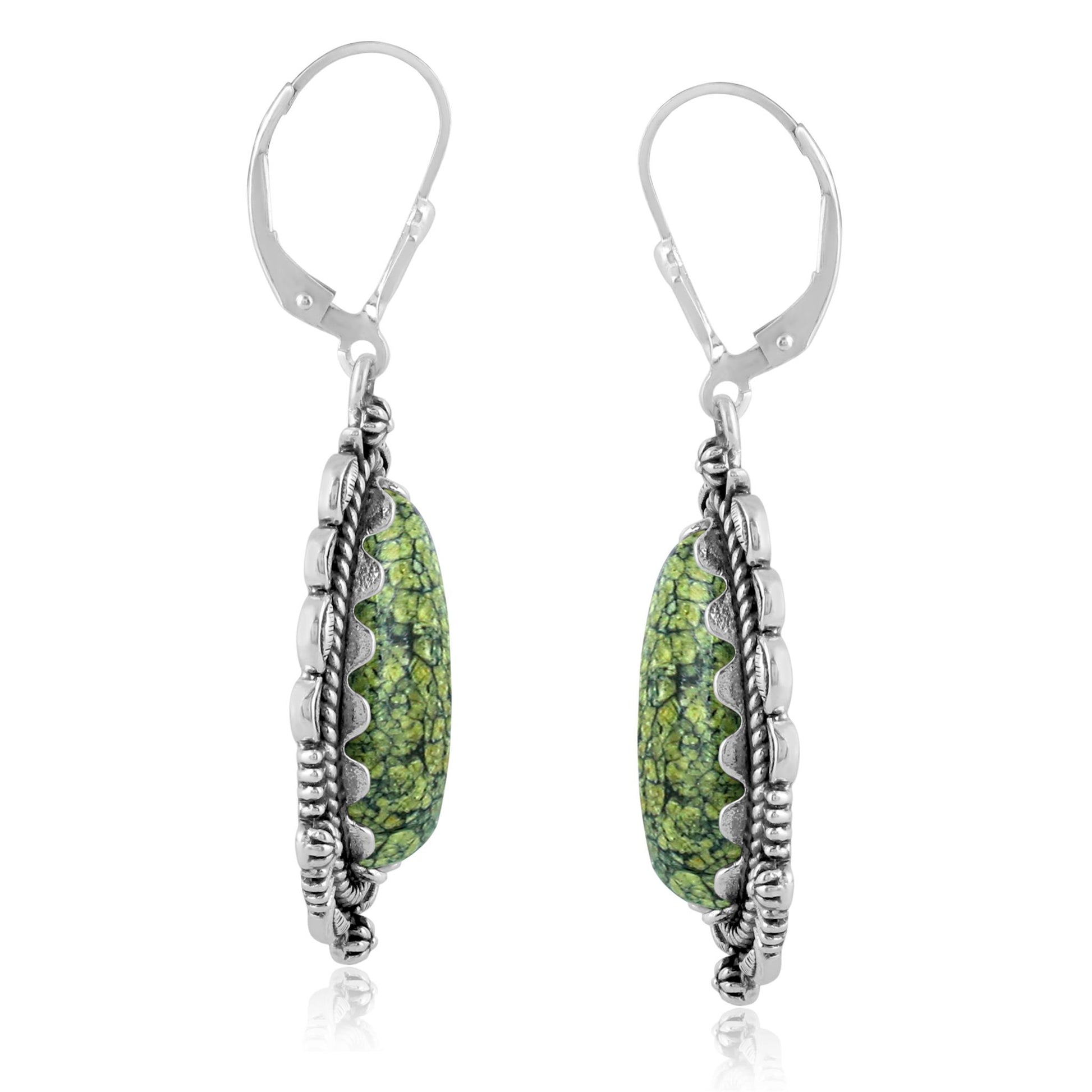Introducing the beautiful American West Serpentine Sterling Silver Drop Earrings. These beauties feature genuine Serpentine gemstones set in a scalloped bezel-setting surrounded by a rope border, concha flower motifs and sun ray designs. The lever back closures are secure and comfortable. Often called a "grounding" stone, Serpentine is associated with protection, transformation, and spiritual growth. It is believed to aid meditation and help clear blocked chakras. Every gemstone in the world is naturally unique, just like you! We carefully select the GIA certified gems for each piece, making your earrings one-of-a-kind. You will find these earrings will elevate any outfit! Whether at work, a date night with your honey or a special party or event– American West Jewelry will get you noticed. Get ready for compliments!