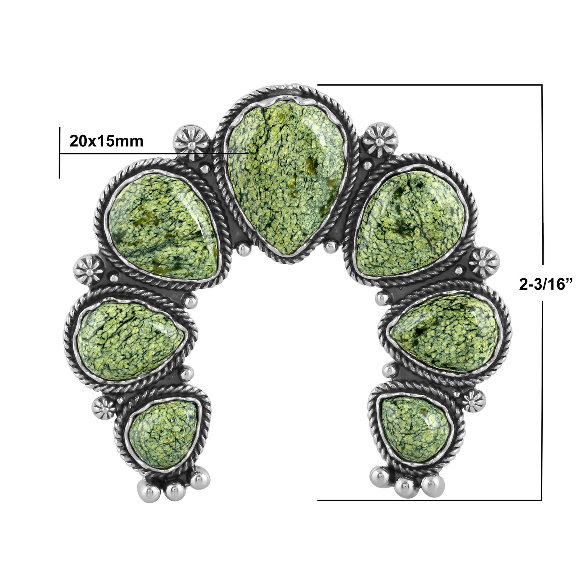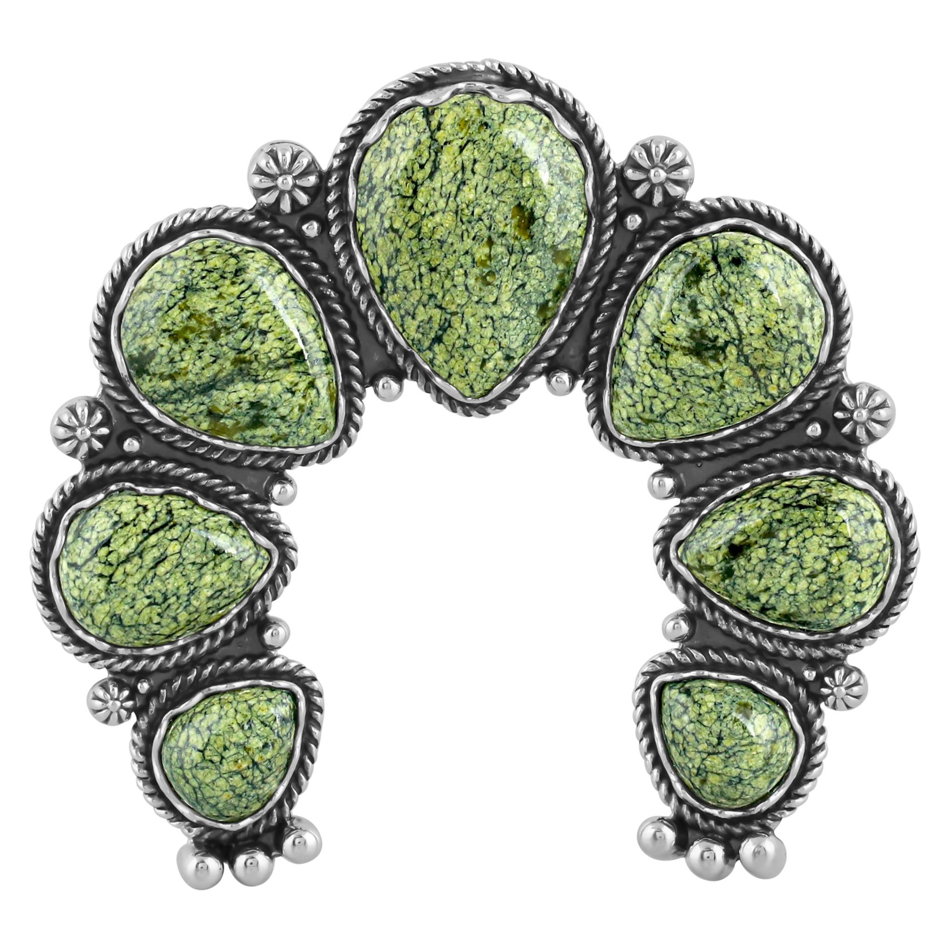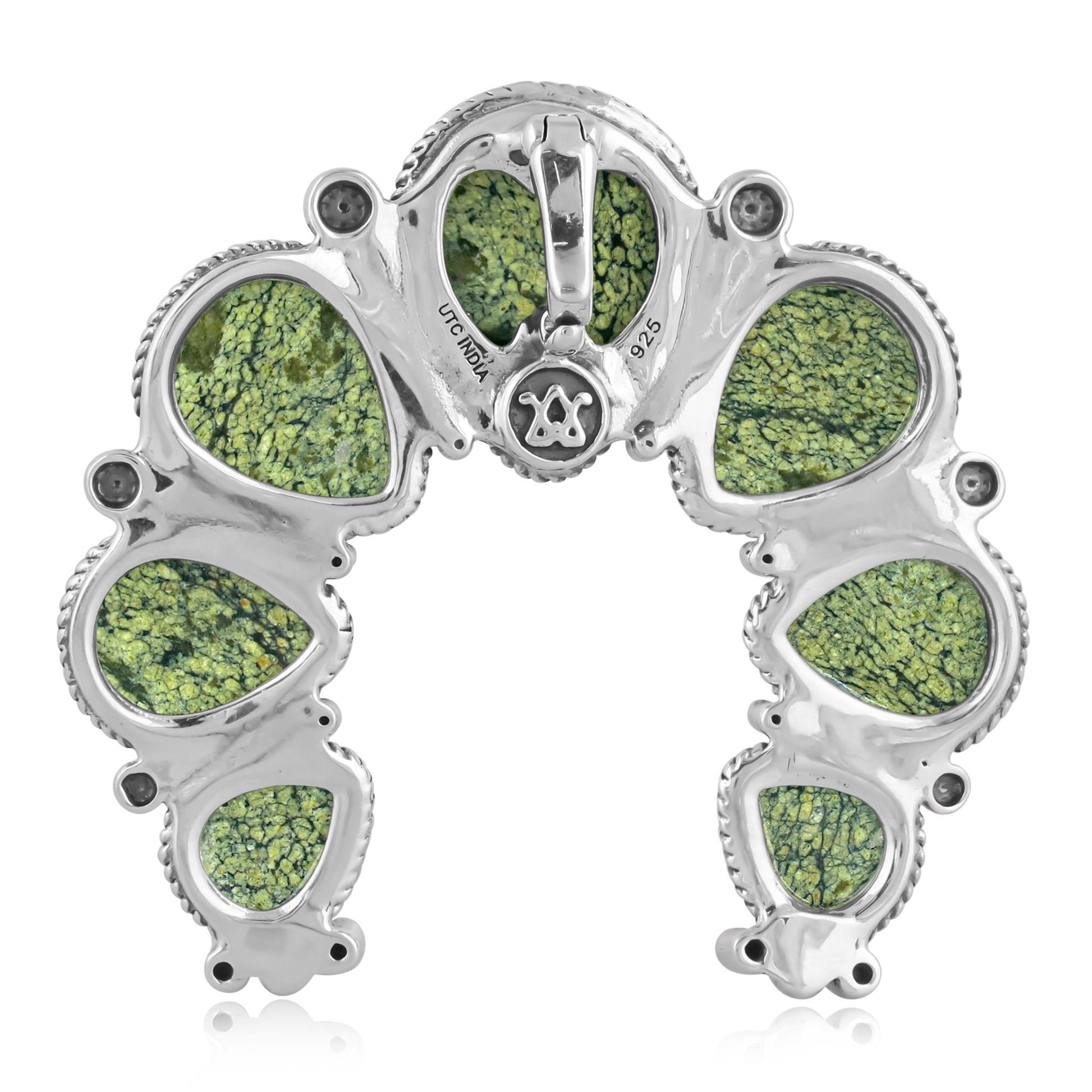 Add a dash of Southwest flair to your outfit when you rock this eye-catching enhancer, flaunting pear-shaped Serpentine gemstone cabochons in a naja shape with whimsical concha accents and an oxidized finish. It features 7 pear-shaped gemstone cabochons graduated in size, concha and beaded accents, a hidden bail, and a polished, oxidized finish. This gorgeous pendant measures approximately 2"W x 2"L. Often called a "grounding" stone, Serpentine is associated with protection, transformation, and spiritual growth. Every gemstone in the world is naturally unique, just like you! We carefully select the GIA certified gems for each piece, making your enhancer one-of-a-kind. You will find that this piece will elevate any outfit! Whether at work, a date night with your honey or a special party or event– American West Jewelry will get you noticed. Get ready for compliments!