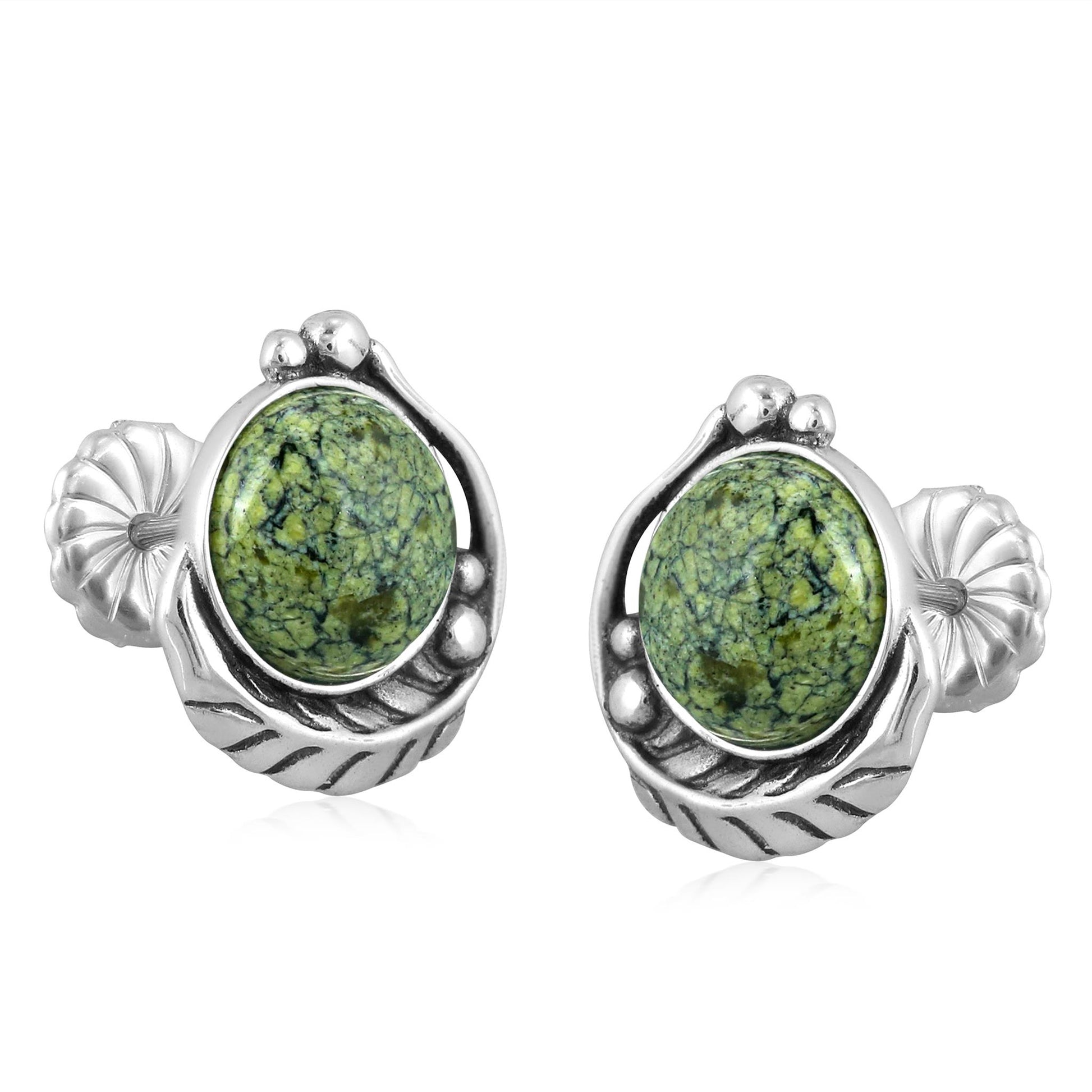 With their leaf-inspired frames and gleaming genuine gemstones, these gorgeous earrings add visual appeal to any look. These naturally colorful, Southwest-inspired, Sterling Silver 3.37 gm button earrings feature a left and right design, with a round Serpentine cabochon at the center, bezel-set and surrounded by leaf detailing. They are post and clutch earrings, made for pierced ears only. Often called a "grounding" stone, Serpentine is associated with protection, transformation, and spiritual growth.