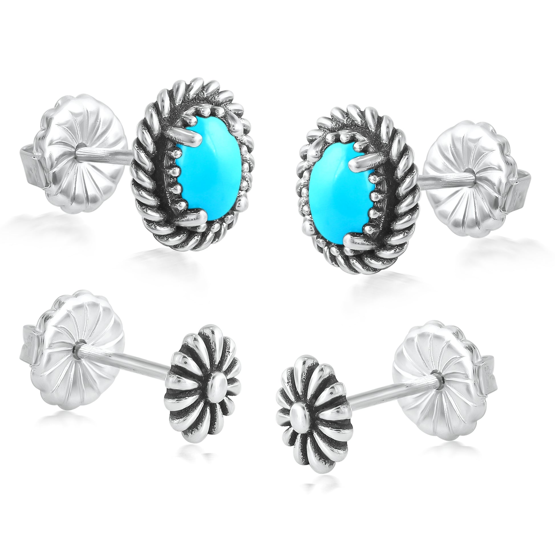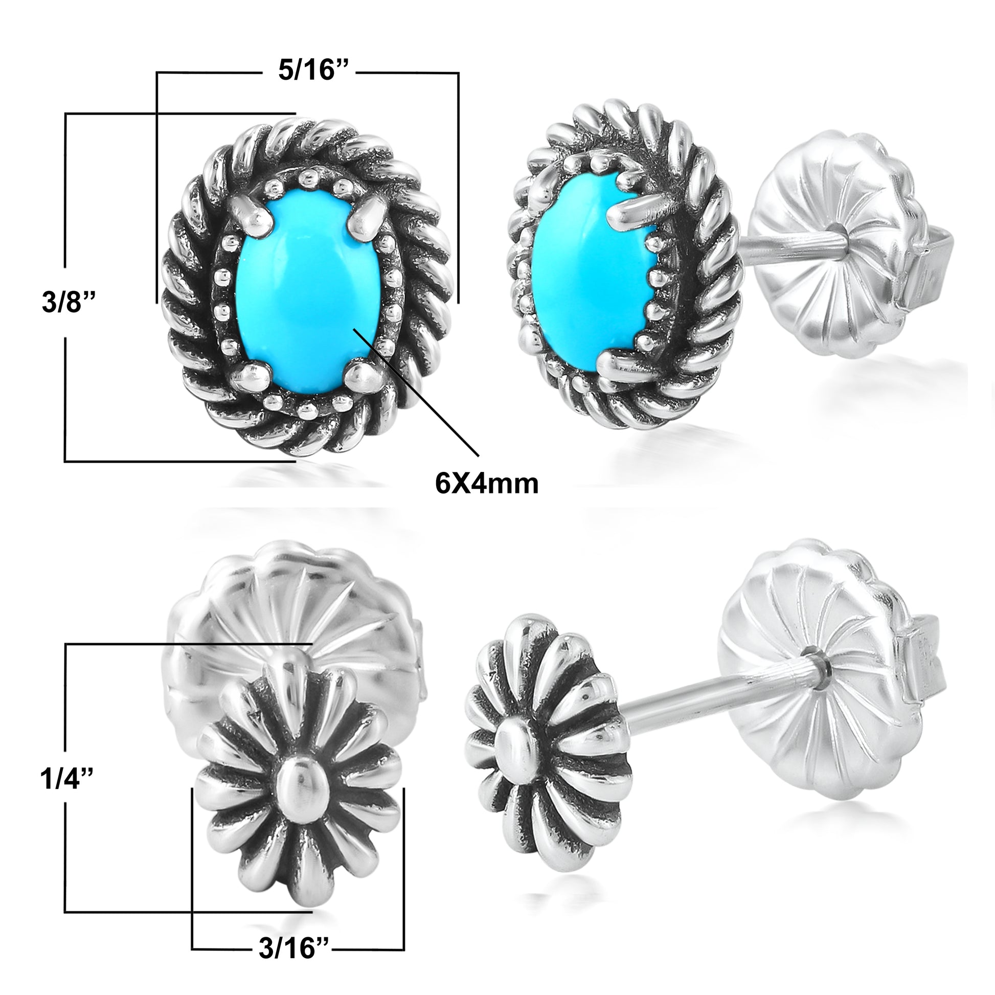 This versatile earring set celebrates Southwestern craftsmanship with two distinct yet complementary designs. The first pair showcases genuine Sleeping Beauty Turquoise oval cabochons, prized for their clear, sky-blue color. Each stone is prong-set in Sterling Silver and framed with bold rope detailing, adding texture and rustic charm that echoes the spirit of the open desert. The second pair features classic Sterling Silver concha flower studs, with finely stamped detailing that brings a touch of vintage flair. Whether worn together or on their own, this set lets you carry a little Western soul wherever you roam. You will find they will elevate any outfit! Whether at work, a date night with your honey or a special party or event– American West Jewelry will get you noticed. Get ready for compliments!