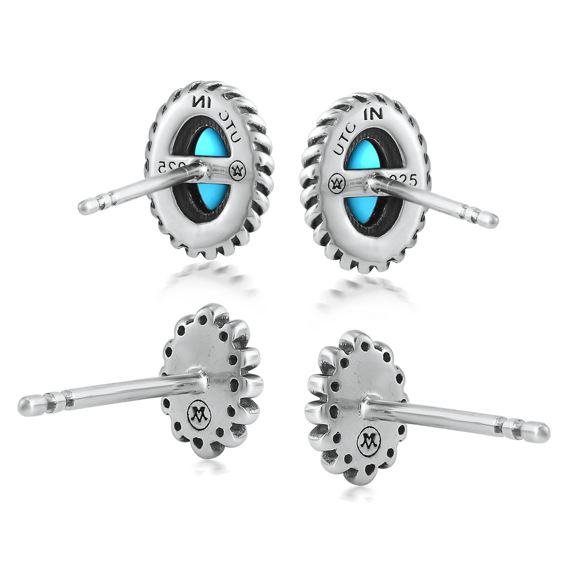 • 2 Sets of earrings including 1 set of Sterling Silver studs with 4x6mm oval Sleeping Beauty Turquoise cabochons and rope accents and 1 set of Sterling Silver Concha Flower studs