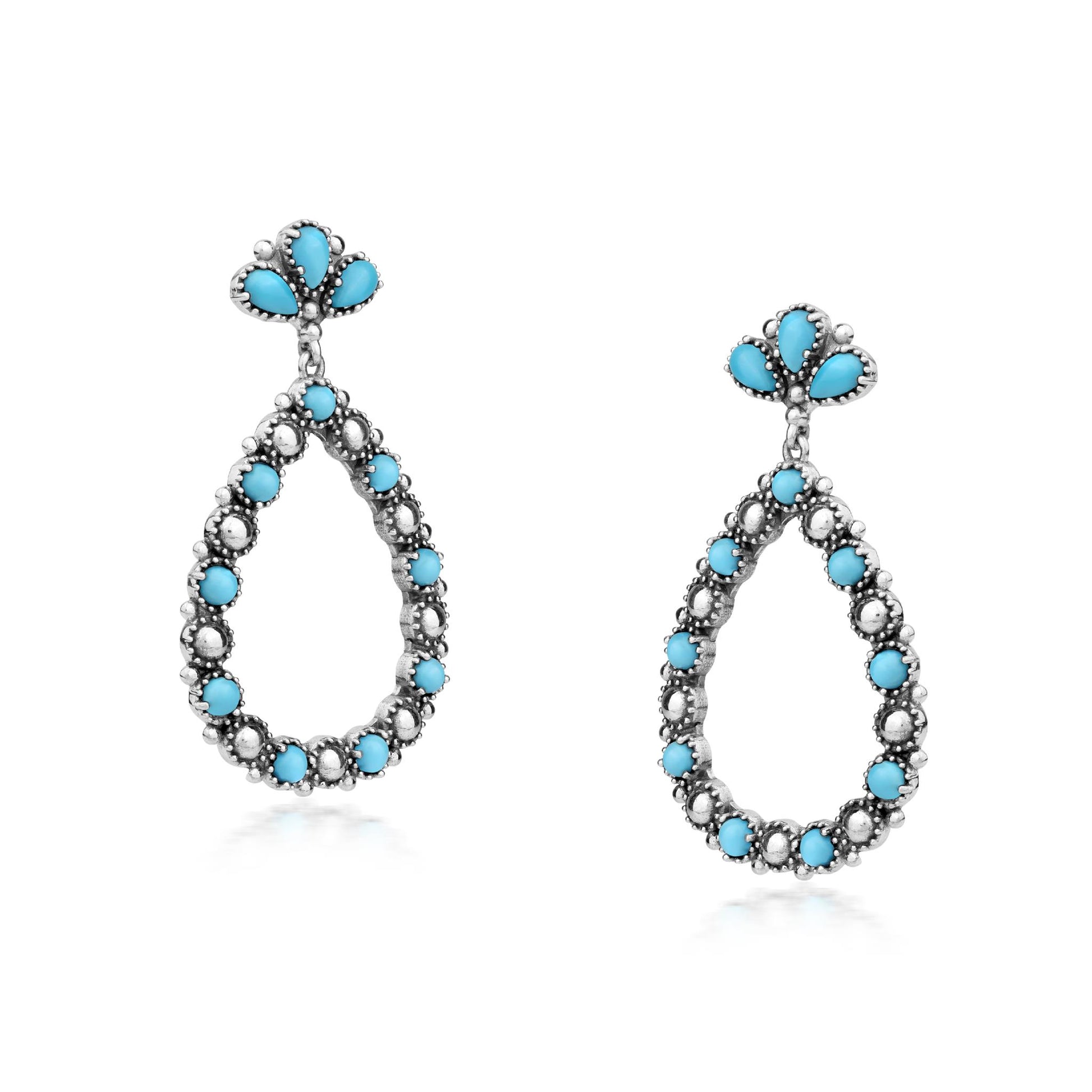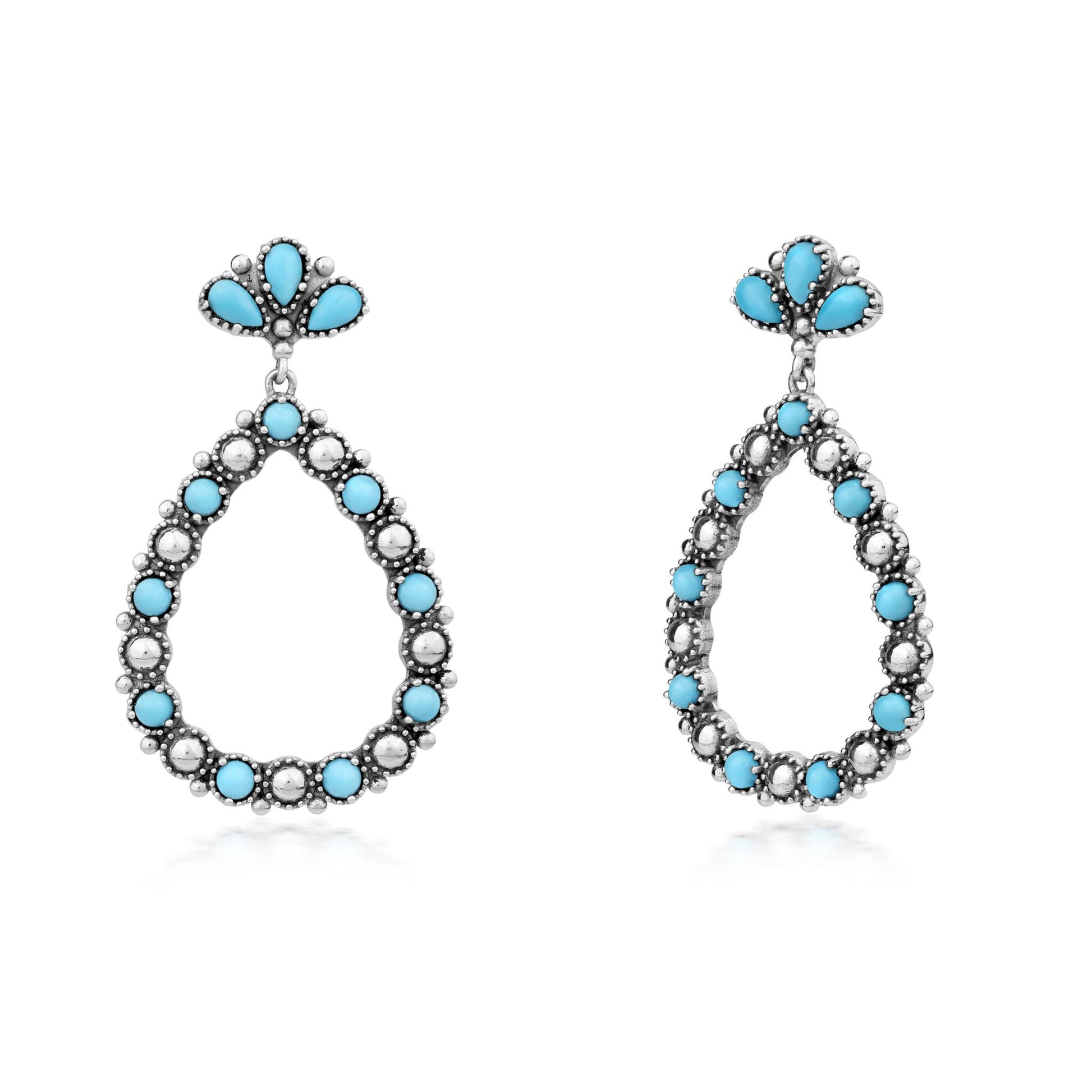 Stroll through your day in style with this pair of vibrant Sterling Silver dangle earrings that bring color and movement to your look. The open teardrop design and vibrant gemstones add personality for coffee catch-ups, celebrations, or everyday outings. A trio pf pear-cut Sleeping Beauty Turquoise cabochons adorn each post, enhanced by oxidized, beaded accents. Beneath them hangs an open teardrop encrusted with 36 (total) round cabochons, all in a beaded setting. These bright blue hues evoke the gorgeous clear skies of the desert Southwest, all in a single glance. Post and oversized clutches hold these stunners securely and comfortably in place. Every gemstone in the world is naturally unique, just like you! We carefully select the GIA certified gems for each piece, making your earrings one-of-a-kind. You will find that they will elevate any outfit! Whether at work, a date night with your honey or a special party or event– American West Jewelry will get you noticed. Get ready for compliments!