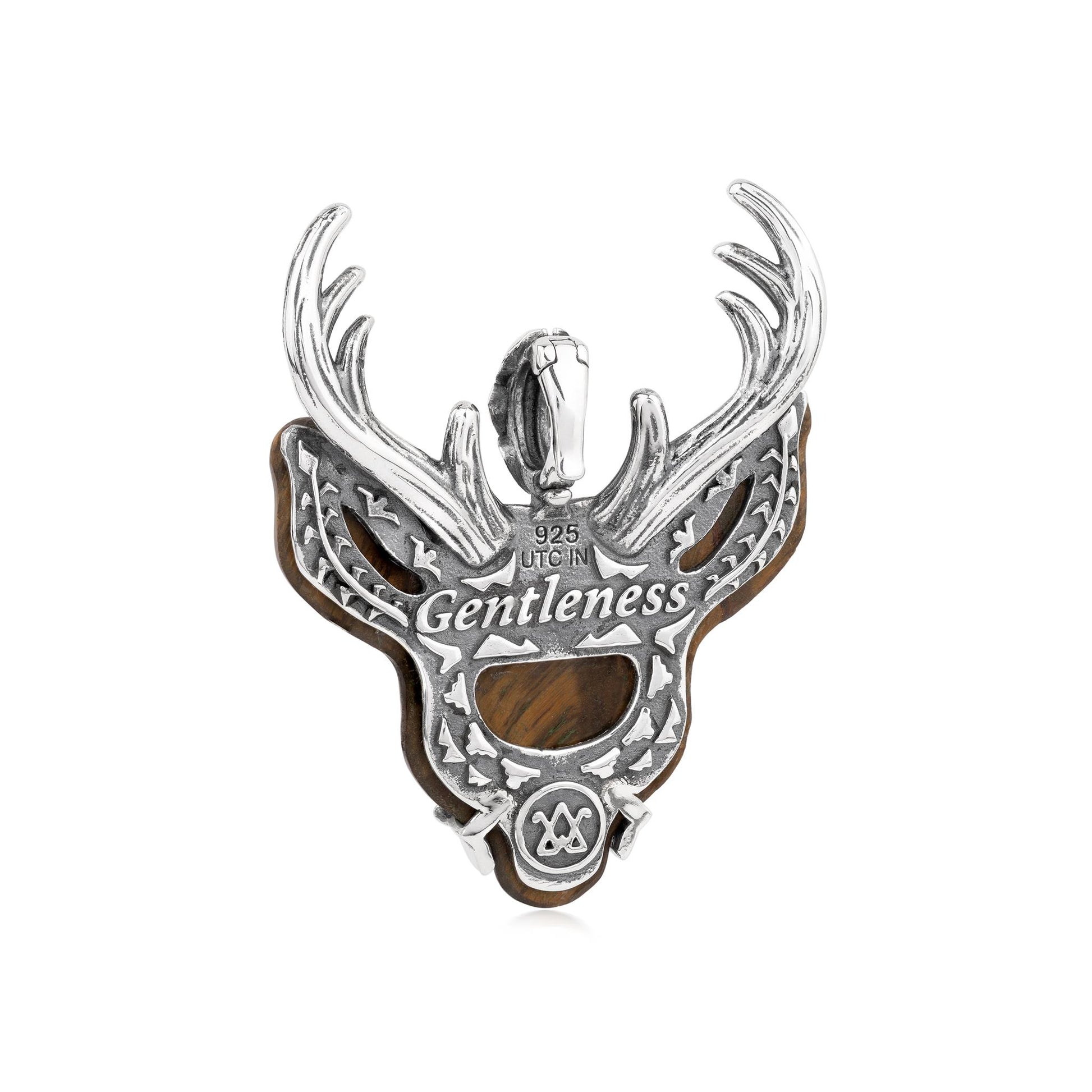 • Pendant features a 37.5 mm x 26 mm deer-shaped Tiger's Eye cabochon with Sterling Silver antlers, face and bail; geometric accents with the word "Gentleness" cast on the reverse side