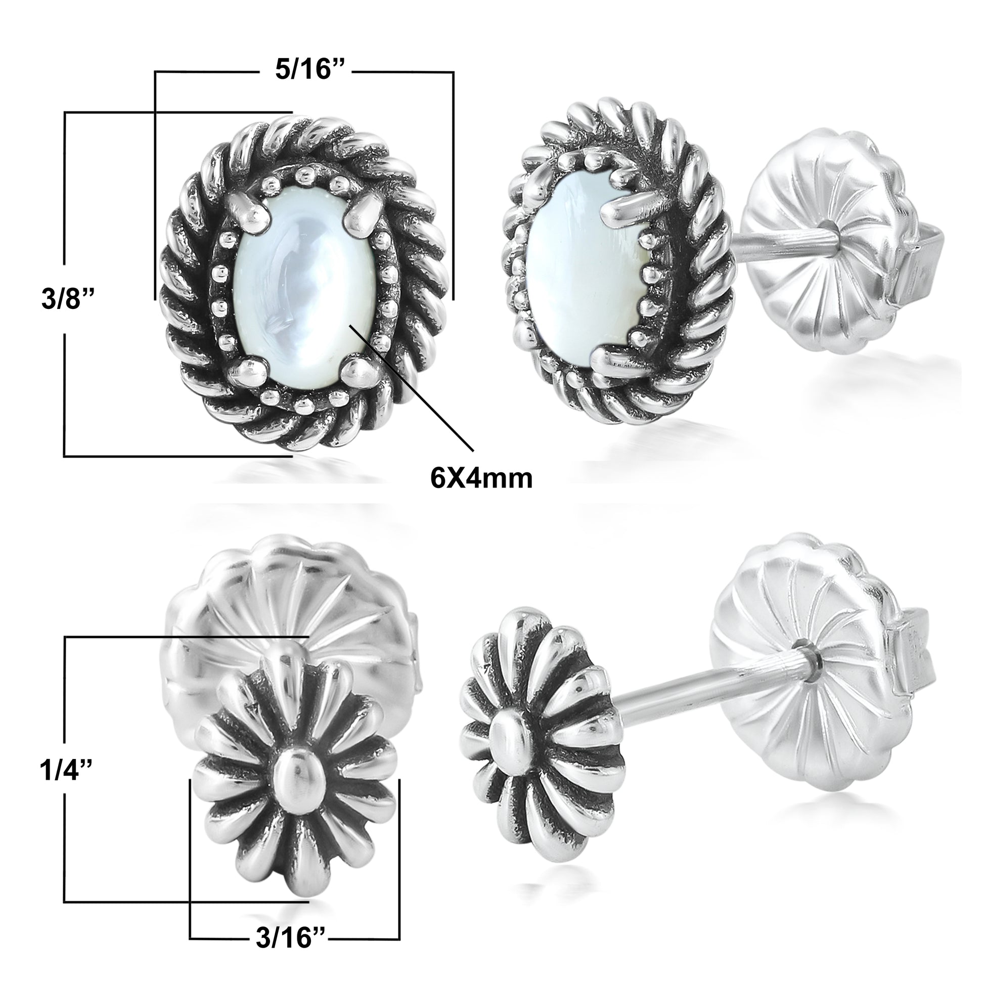 • 2 Sets of earrings including 1 set of Sterling Silver studs with 4x6mm oval White Mother of Pearl cabochons and rope accents and 1 set of Sterling Silver Concha Flower studs
