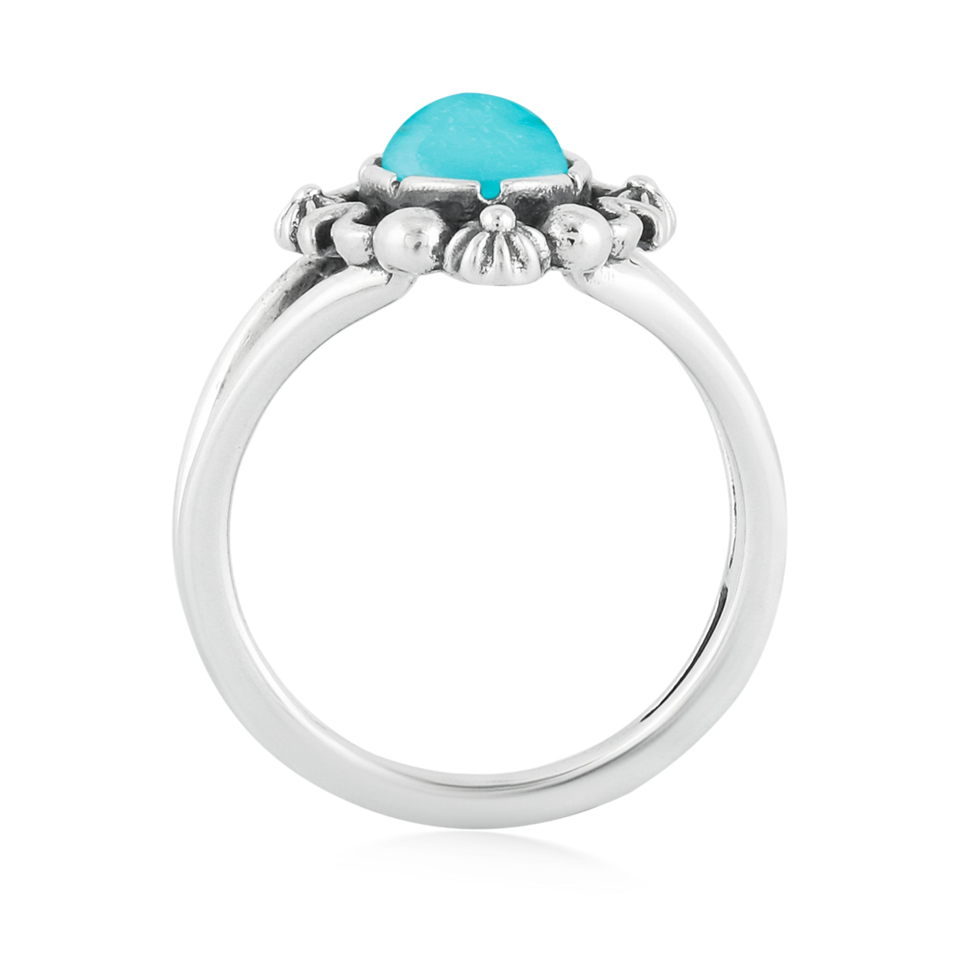 Flaunt boho flair on your finger with this Southwestern-inspired ring adorned with a bold Turquoise cabochon and rustic swirl, bead and concha flower embellishments. The split shank design tapers in the back for comfort. Turquoise jewelry has been thought to bring luck to its wearer and have healing properties, making it an invaluable accessory for those looking to live a healthy and happy life. Every gemstone in the world is naturally unique, just like you! We carefully select the GIA certified gems for each piece, making your ring one-of-a-kind. You will find this ring will elevate any outfit! Whether at work, a date night with your honey or a special party or event– American West Jewelry will get you noticed. Get ready for compliments!