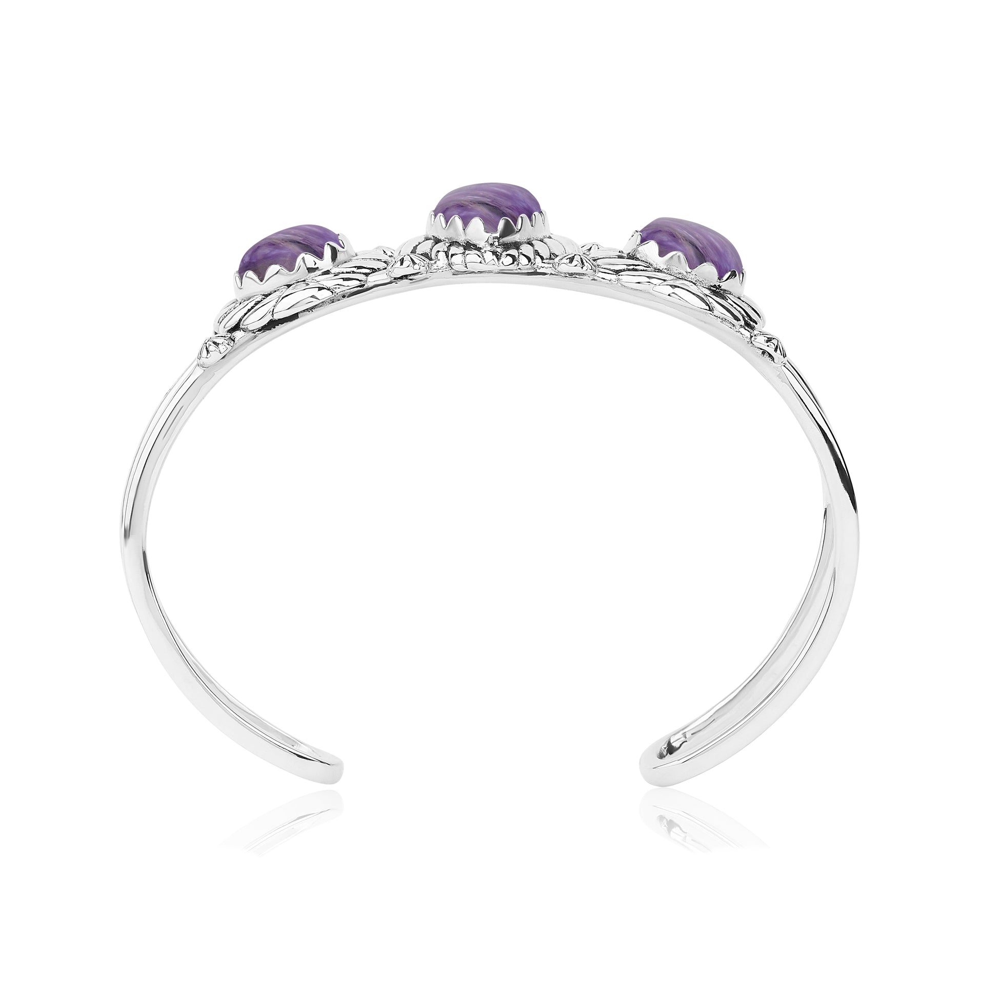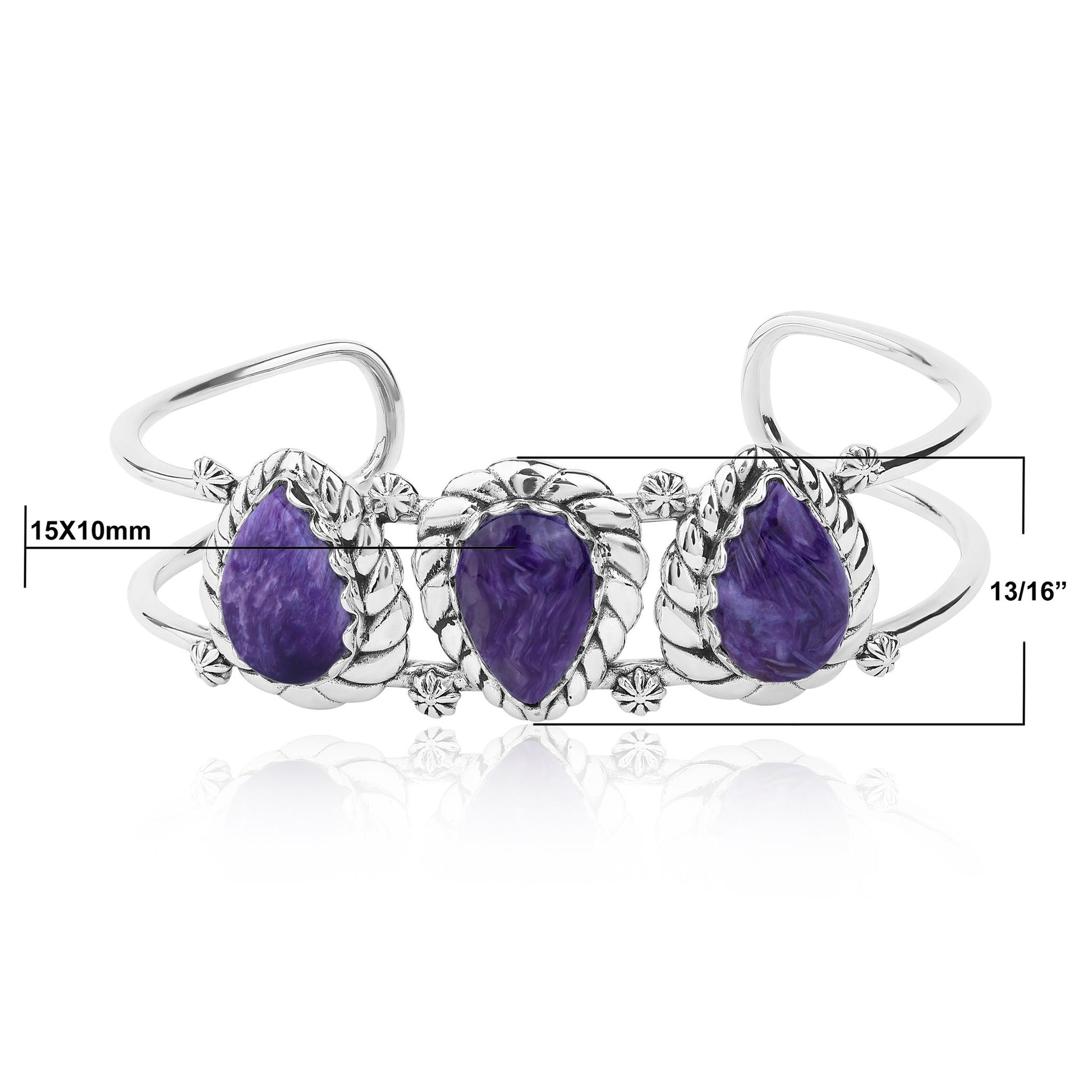 Brimming with bold gemstones and decadent Sterling Silver details, this cuff can't be called a conversation piece. That's because it renders people speechless with its Southwestern beauty and substantial style! This gorgeous cuff bracelet has three pear-shaped Charoite gemstone cabochons, set is a serrated bezel and surrounded by a rope border and concha flower accents. Pair it with our matching pear-cut rope ring or stack it with other bracelets - it is stunning alone and is a perfect base for layering. Charoite has calming, healing properties and can provide emotional support. It’s often associated with reducing stress, grounding energies, and enhancing spiritual awareness. Every gemstone in the world is naturally unique, just like you! We carefully select the GIA certified gems for each piece, making your bracelet one-of-a-kind. You will find that this bracelet will elevate any outfit! Whether at work, a date night with your honey or a special party or event– American West Jewelry will get you noticed. Get ready for compliments!