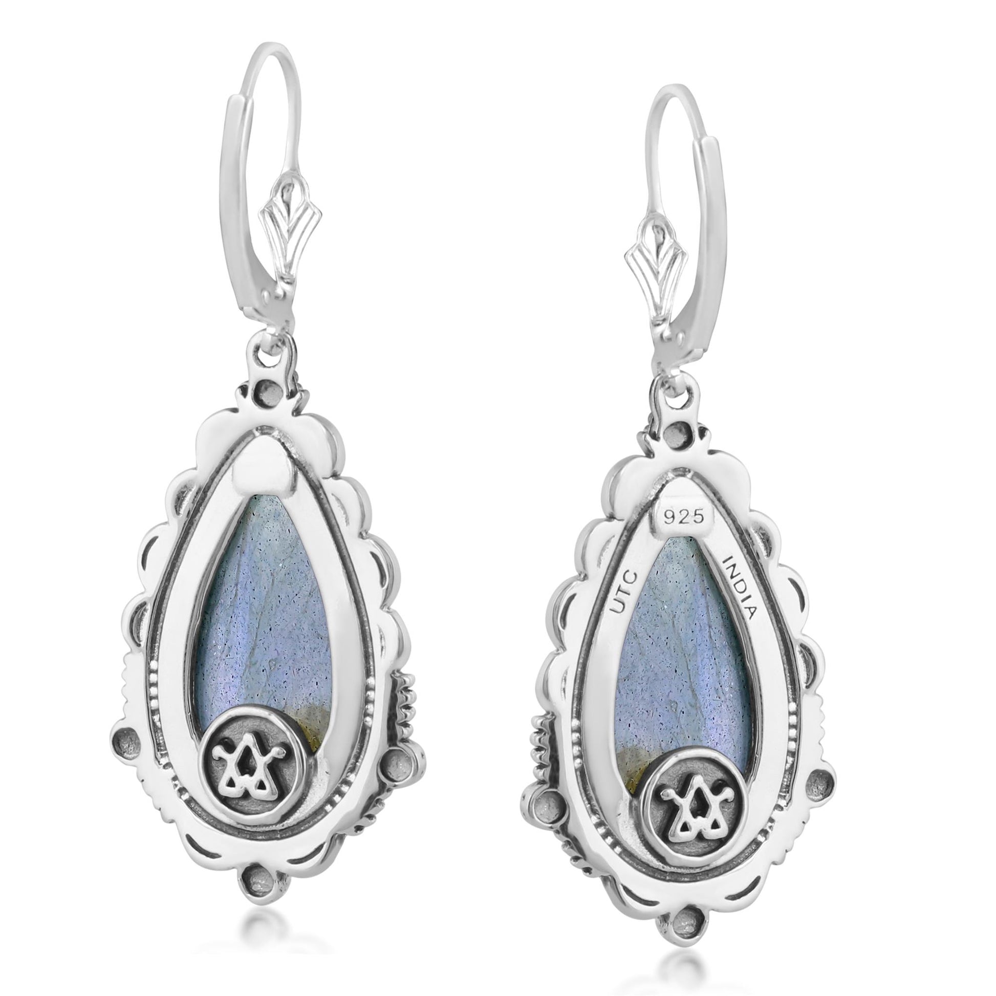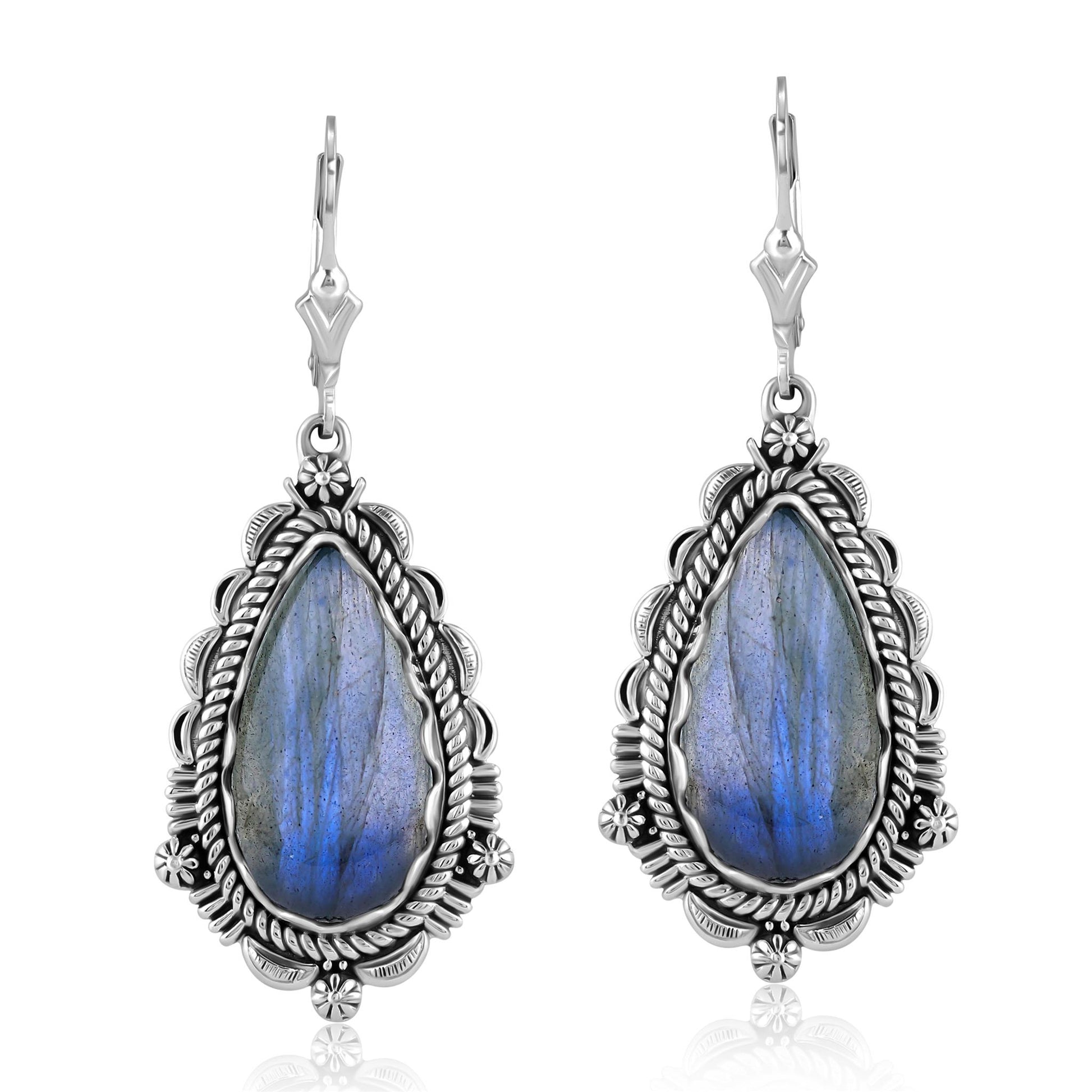 Introducing the beautiful American West Jewelry Sterling Silver Dangle Earrings. These beauties feature genuine Labradorite gemstones set in a scalloped bezel-setting surrounded by a rope border, concha flower motifs and sun ray designs. The lever back closures are secure and comfortable. Labradorite is believed to symbolize transformation and protection, enhancing intuition and spiritual awareness. It is also associated with calming the mind, promoting clarity, and balancing energies. Every gemstone in the world is naturally unique, just like you! We carefully select every GIA certified gem, making your earrings one-of-a-kind. Pair them with our squash blossom necklace to complete your look. Whether at work, a date night with your honey or a special party or event– American West Jewelry will get you noticed. Get ready for compliments!