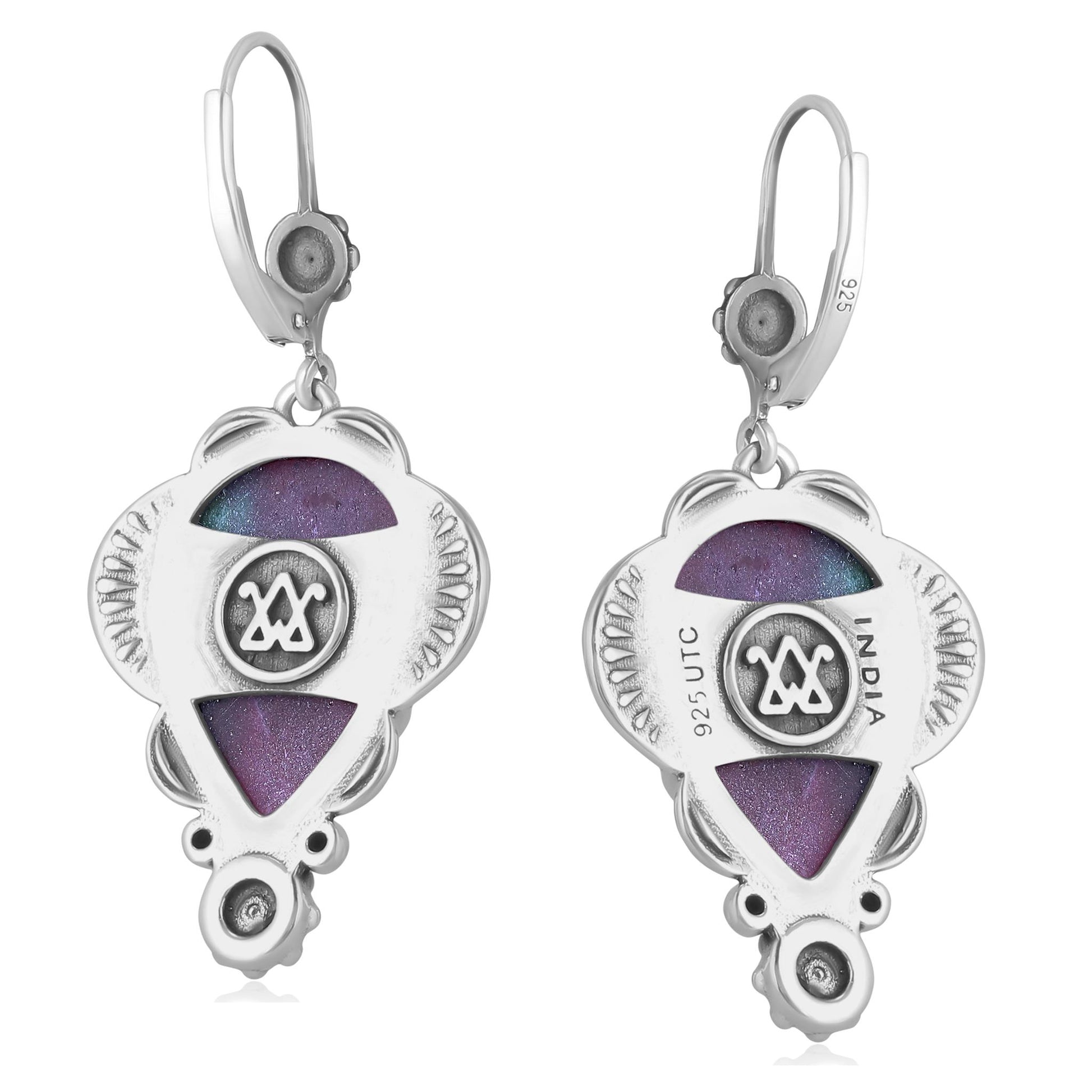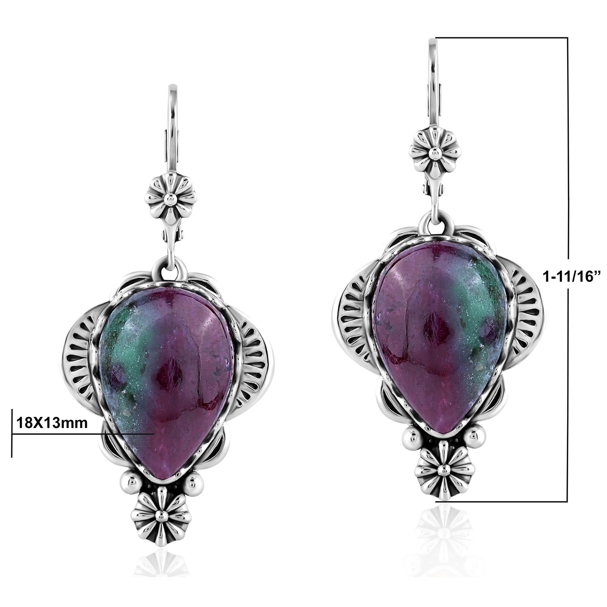 • Sterling Silver earrings feature pear-shaped Ruby Zoisite gemstones set in a scalloped bezel-setting surrounded by concha flower motifs and sun ray designs