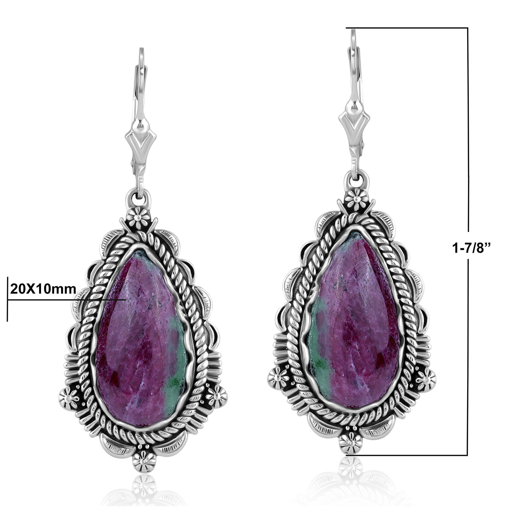 Introducing the beautiful American West Jewelry Sterling Silver Dangle Earrings. These beauties feature genuine Ruby Zoisite gemstones set in a scalloped bezel-setting surrounded by a rope border, concha flower motifs and sun ray designs. The lever back closures are secure and comfortable. Ruby Zoisite offers the energy of happiness, appreciation, abundance, vitality, and growth, promoting emotional healing and a connection to the spiritual realm. Every gemstone in the world is naturally unique, just like you! We carefully select every GIA certified gem, making your earrings one-of-a-kind. Pair them with our squash blossom necklace to complete your look. Whether at work, a date night with your honey or a special party or event– American West Jewelry will get you noticed. Get ready for compliments!