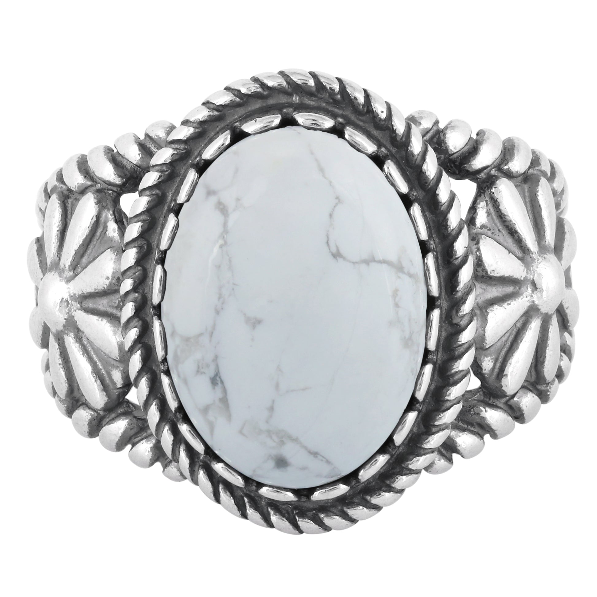 • Naturally Stylish Southwest-inspired Sterling Silver ring that features an oval-shaped white Howlite gemstone in a serrated bezel rope frame with Rope split shanks that have a native flower on each side, with a polished oxidized finish.