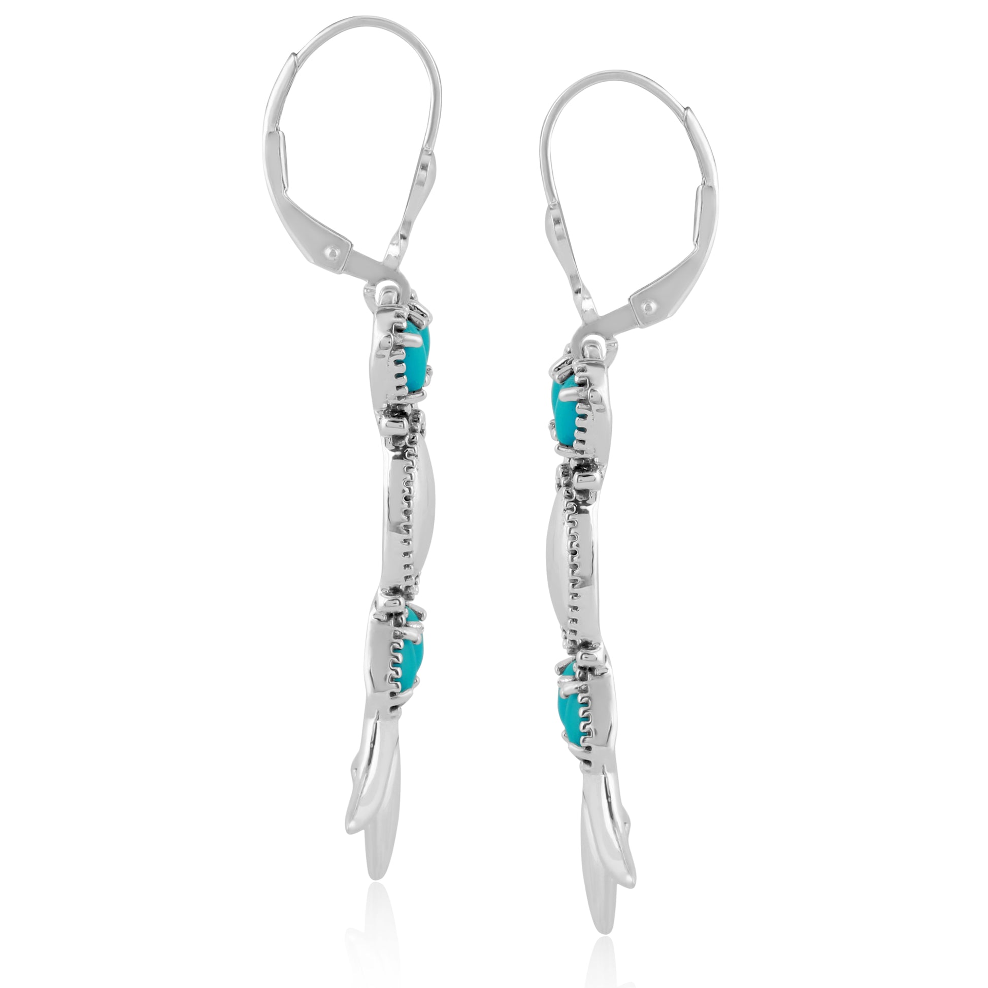 Introducing the American West Lever Back Earring, the perfect addition to any outfit! These stunning earrings feature 8 pear-cut Sleeping Beauty Turquoise cabochons set in an intricate, micro beaded oxidized Sterling Silver silhouette. Sleeping Beauty Turquoise is a highly sought-after variety of Turquoise known for its vibrant sky-blue color and minimal veining, primarily sourced from the Sleeping Beauty Mine in Globe, Arizona. Every gemstone in the world is naturally unique, just like you! We carefully select the GIA certified gems for each piece, making your earrings one-of-a-kind. You will find that these earrings will elevate any outfit! Whether at work, a date night with your honey or a special party or event– American West Jewelry will get you noticed. Get ready for compliments!
