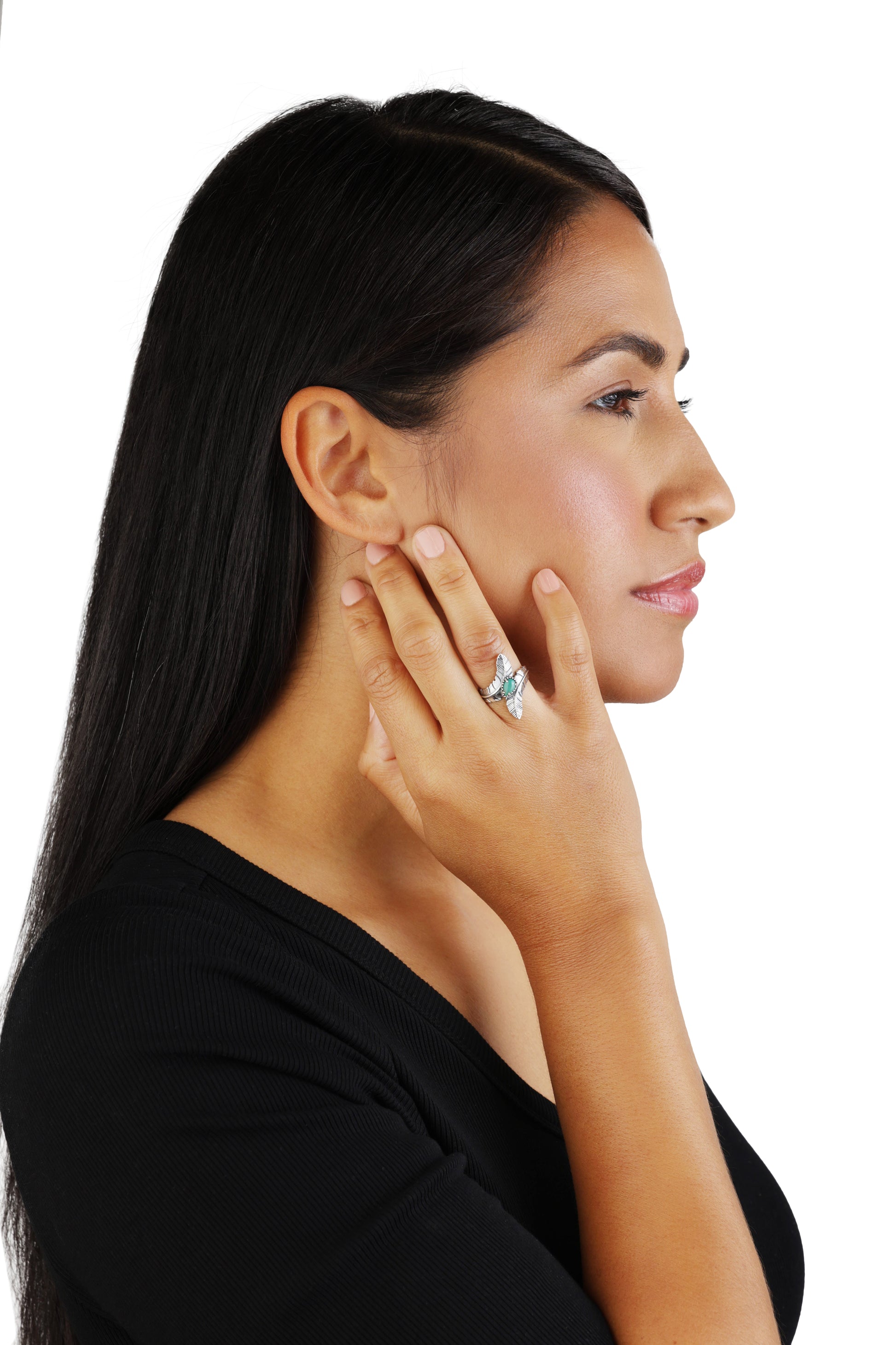 This ring is inspired by the Golden Eagles that soar free through the desert sky with power and grace. The band is comprised of a unique double-feather design etched in Sterling Silver, and is adorned with a pear-shaped, prong-set Green Turquoise gemstone. A legendary Southwestern style of dimension, it is oxidized for depth and then given a natural, polished finish. Turquoise has long been considered sacred due to its beautiful and unique appearance. Turquoise jewelry has been thought to bring luck to its wearer and have healing properties, making it an invaluable accessory for those looking to live a healthy and happy life.