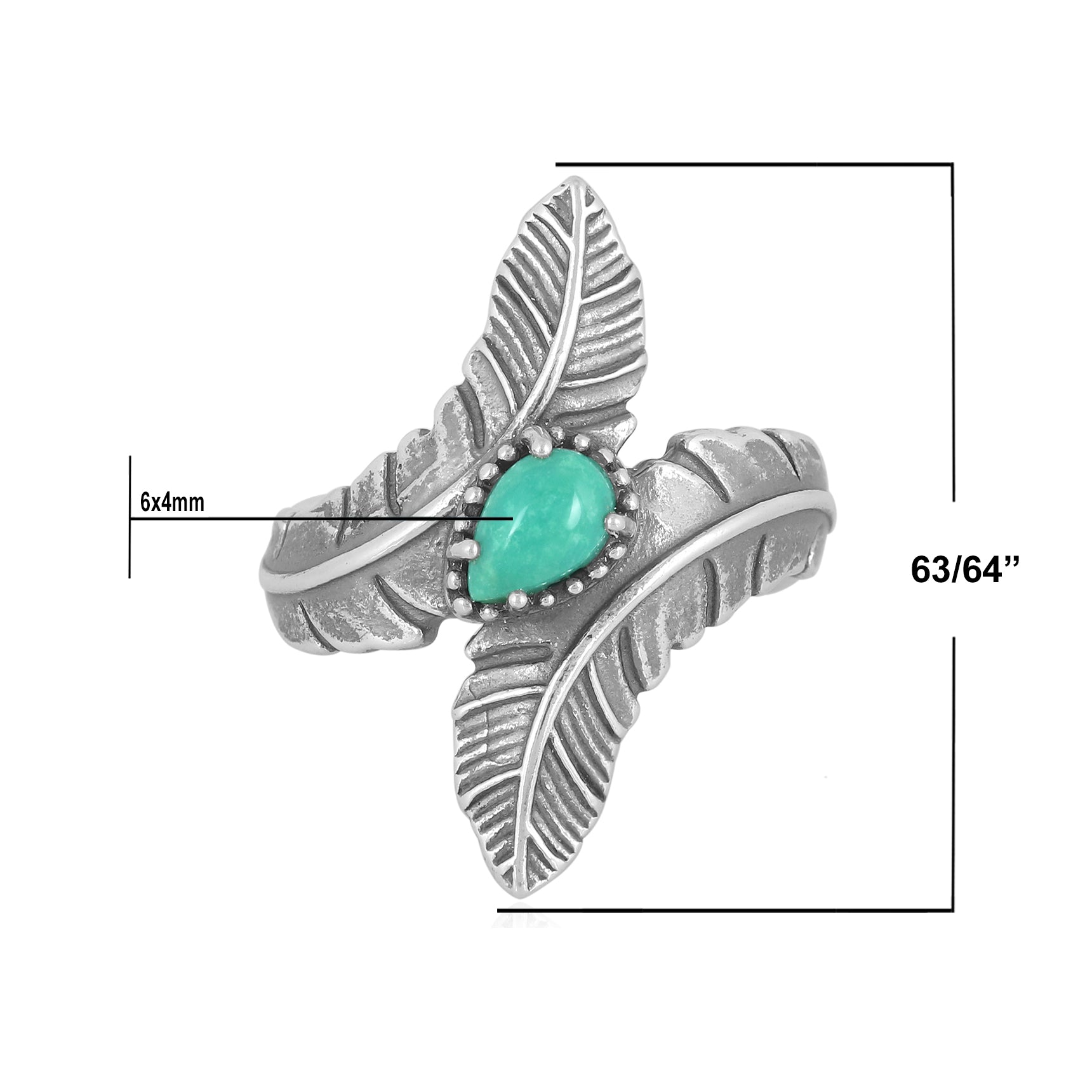 • Sterling Silver ring with double-feather design, knuckle to knuckle style ring handcrafted from Sterling Silver; center pear-shaped 6mm x 4mm Green Turquoise gemstone