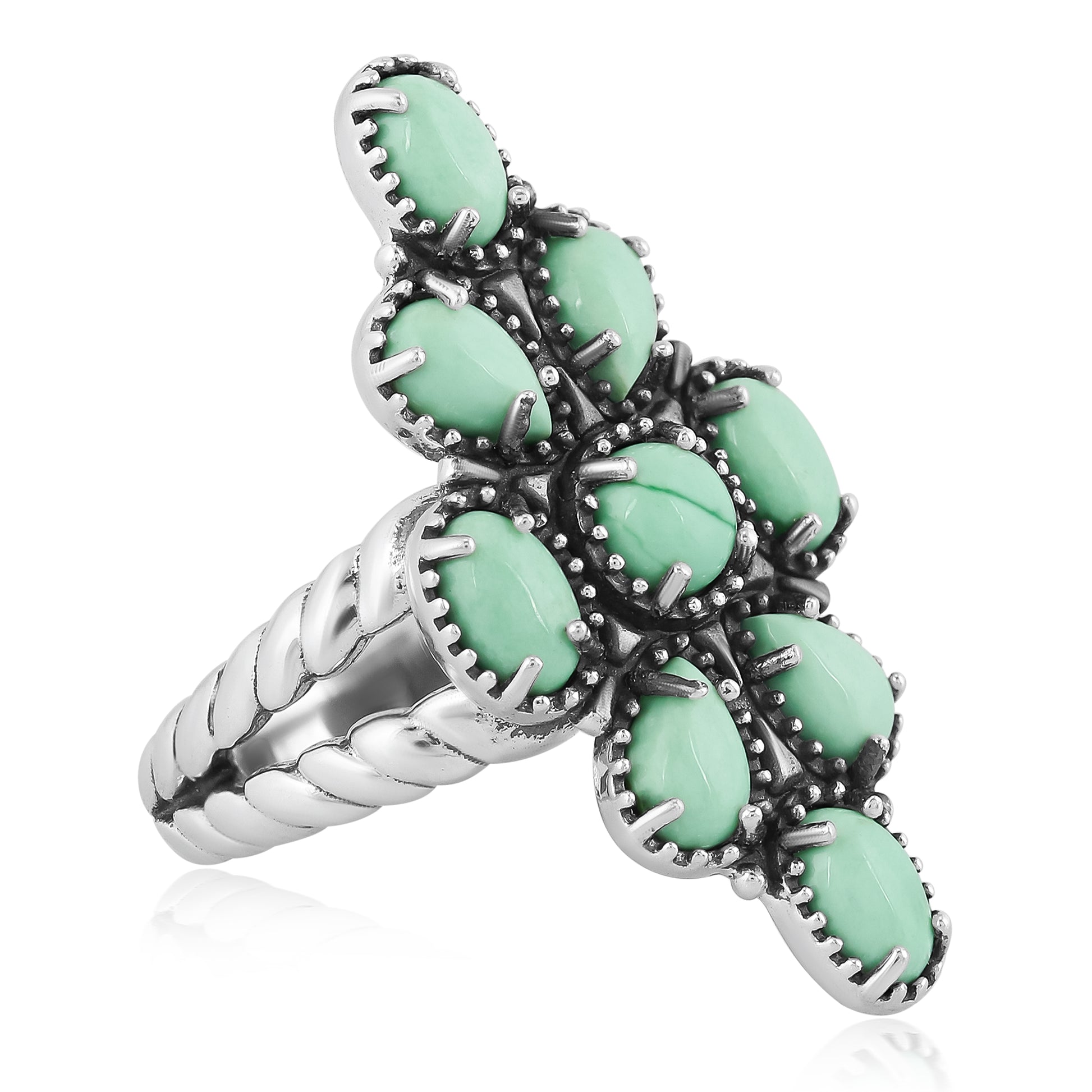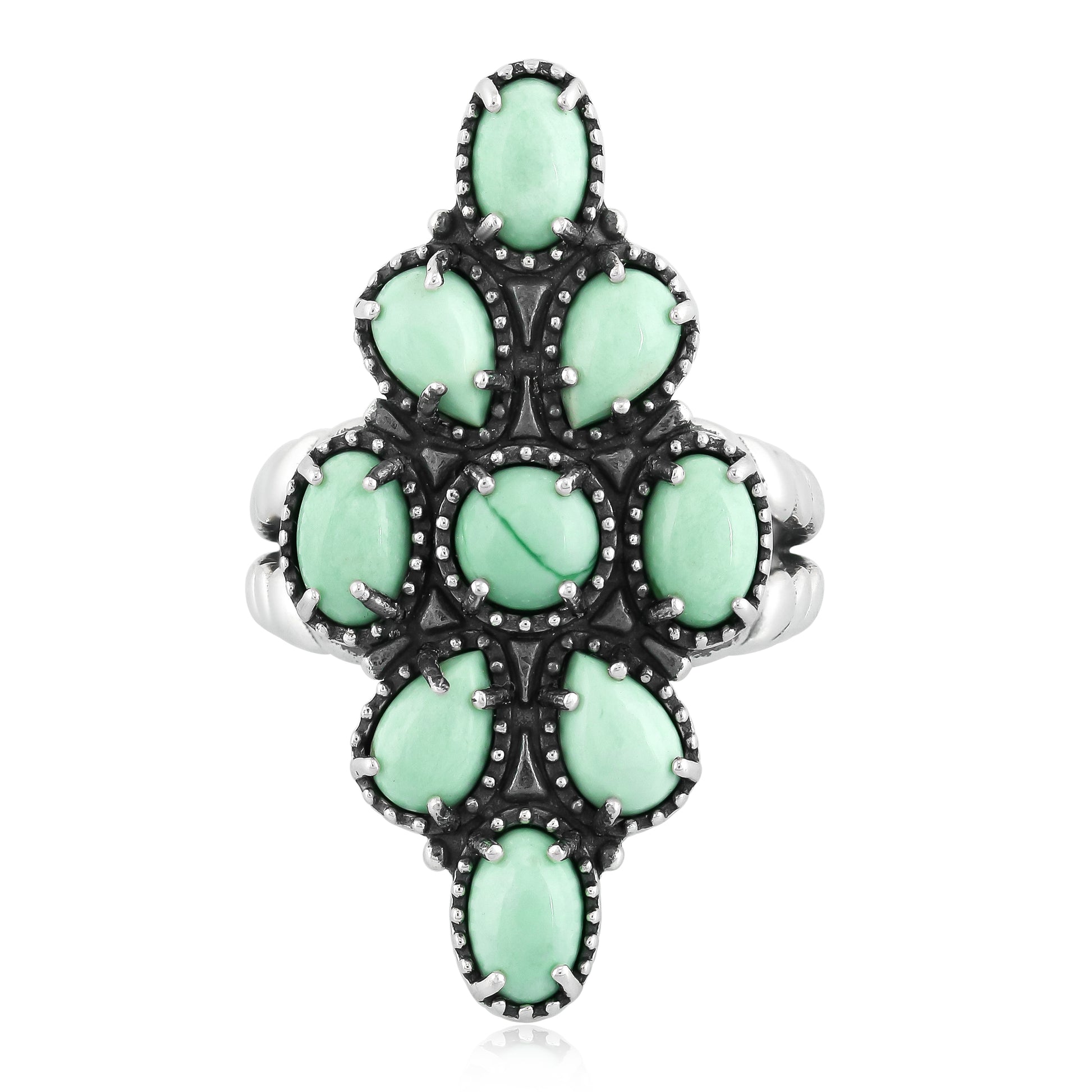 Introducing the American West Jewelry Cluster Ring. This ring is inspired by the vibrant leaves of the amaranth that thrives wherever it takes root. The piece features an array of nine unique Variscite gemstones and is complimented by a Sterling Silver rope band. Designed by Carolyn Pollack out of her home in Albuquerque, New Mexico, this exclusive ring captures the wonder and flair of the Land of Enchantment. Ideal for any ensemble, make it part of your collection today.