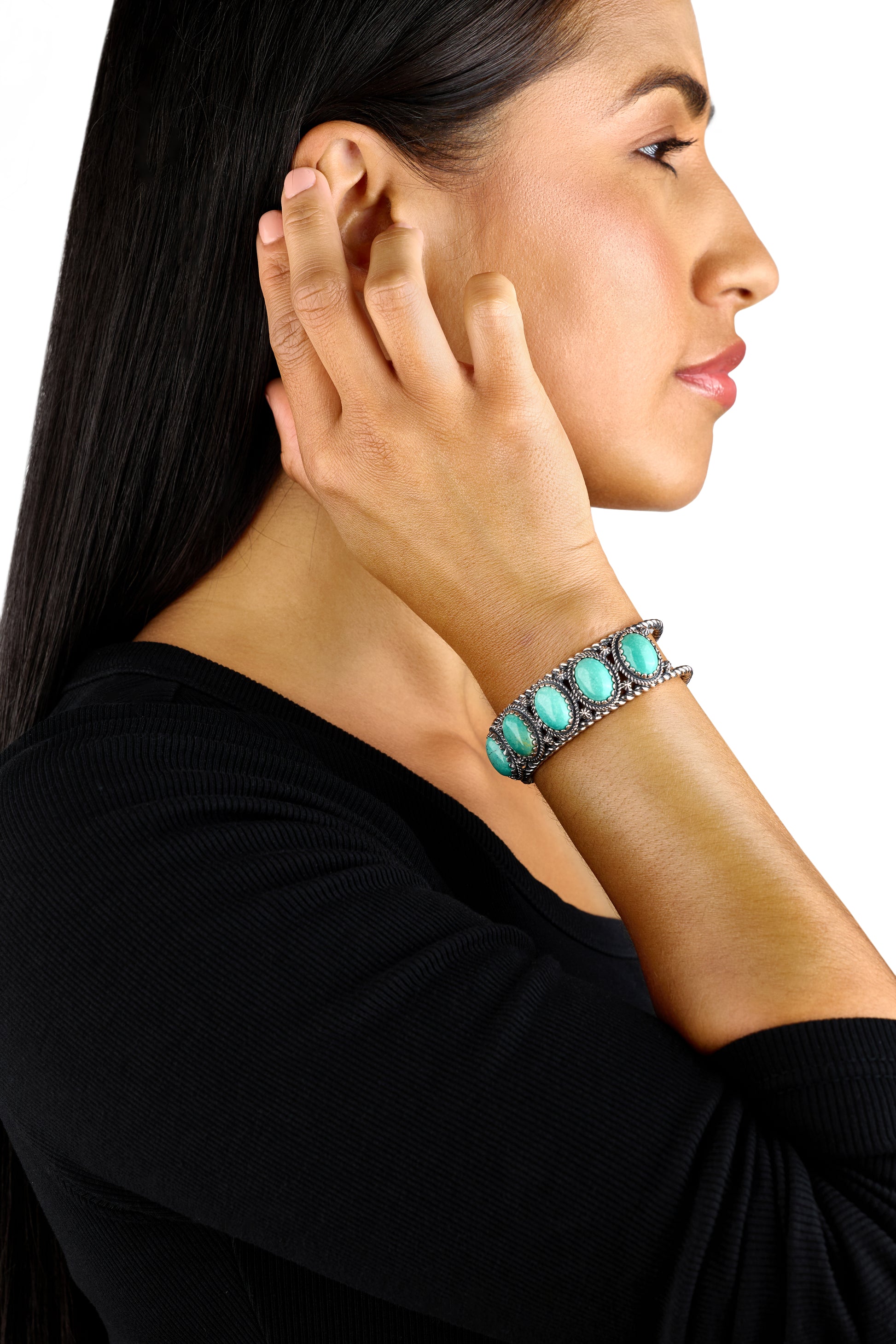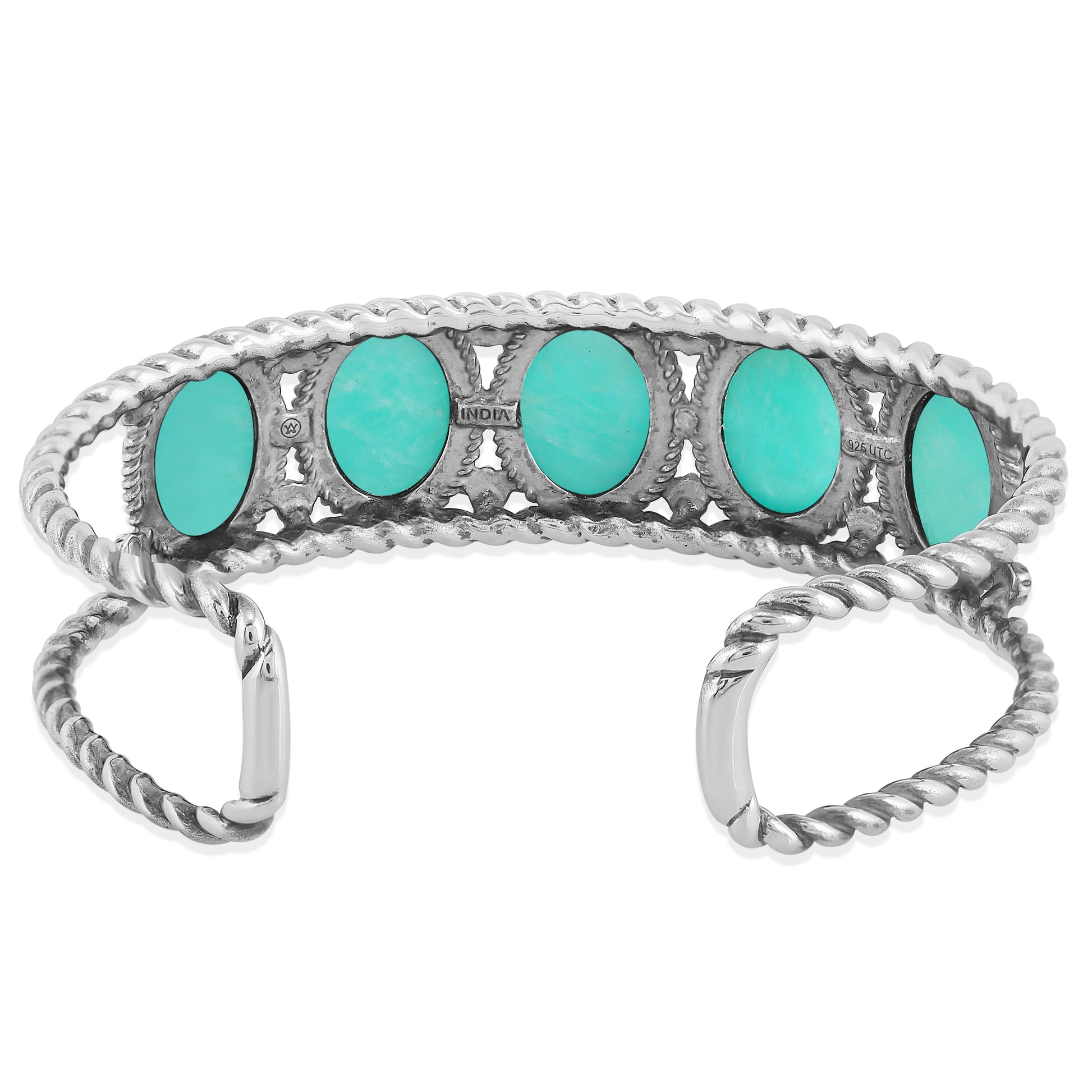 Add a kick of vibrant chic to any look with this versatile, Southwest-inspired bracelet of nickel-free .925 Sterling Silver. This cuff bracelet is proudly designed for the beauty and rich history of the western region in Sterling Silver and five oval 14 x 10mm Amazonite cabochons. It features a notched bezel, a rope border, and flower-design accents and an oxidized, polished finish. At .75" wide, this piece brilliantly captures the wonder and flair of the Land of Enchantment.
