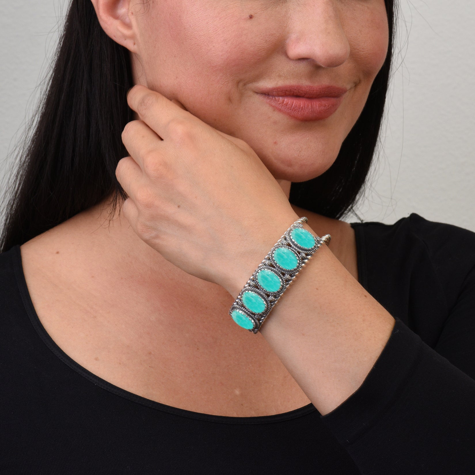 • Cuff features five 10 x 14 mm oval-shaped Amazonite gemstones set in a scalloped bezel-setting, with a rope border, concha flower motifs, and rope border details around the cuff