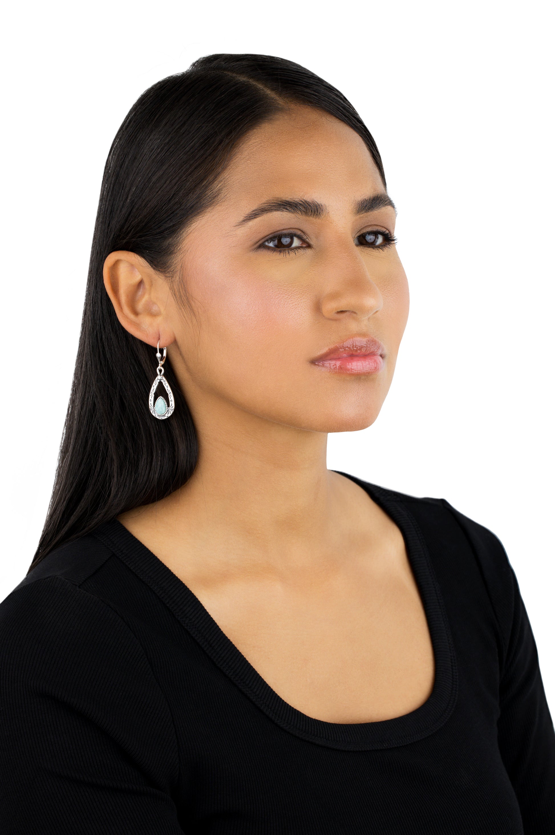 •Sterling silver dangle earrings designed by Carolyn Pollack feature a pear-shaped bezel-set Amazonite gemstone surrounded by a rope-style border and framed with a pear-shaped stamped native-inspired design, and a polished oxidized finish.