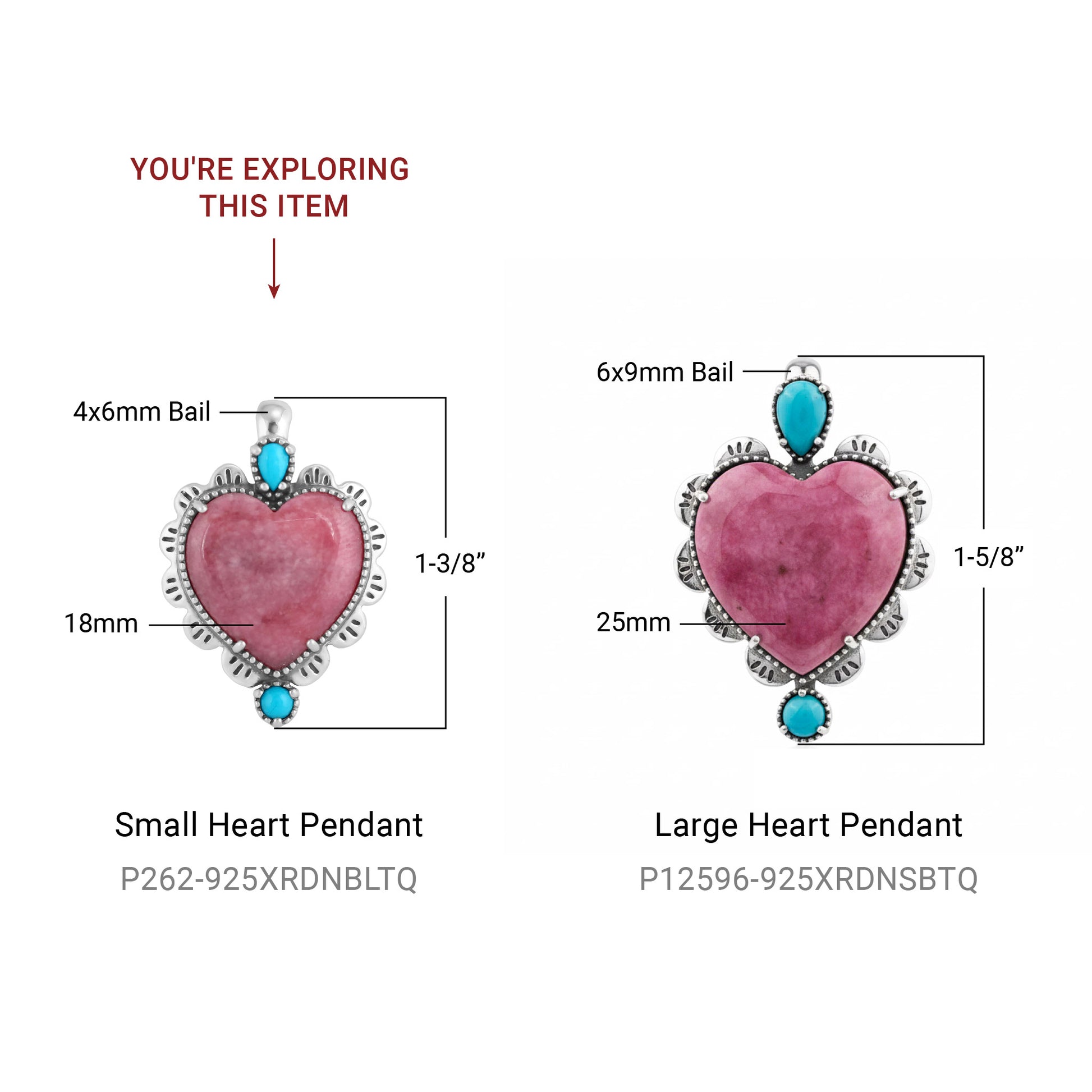 Add a kick of vibrant color to any look with this versatile, Southwest-inspired pendant of real, nickel-free .925 Sterling Silver. It features a heart-shaped 18mm Rhodonite gemstone in a prong setting with one teardrop-shaped and one round-shaped Sleeping Beauty Turquoise gemstone at top and bottom. All are adorned with a scalloped sun ray concha design on the outer edge. The snap hinged bail fits on most chains or cords. The pendant measures 1.4" wide x 2.25" long, including the bail. Rhodonite gemstone is believed to promote emotional healing, compassion, and balance, while Sleeping Beauty Turquoise is a highly sought-after variety of Turquoise known for its vibrant sky-blue color and minimal veining, primarily sourced from the Sleeping Beauty Mine in Globe, Arizona.