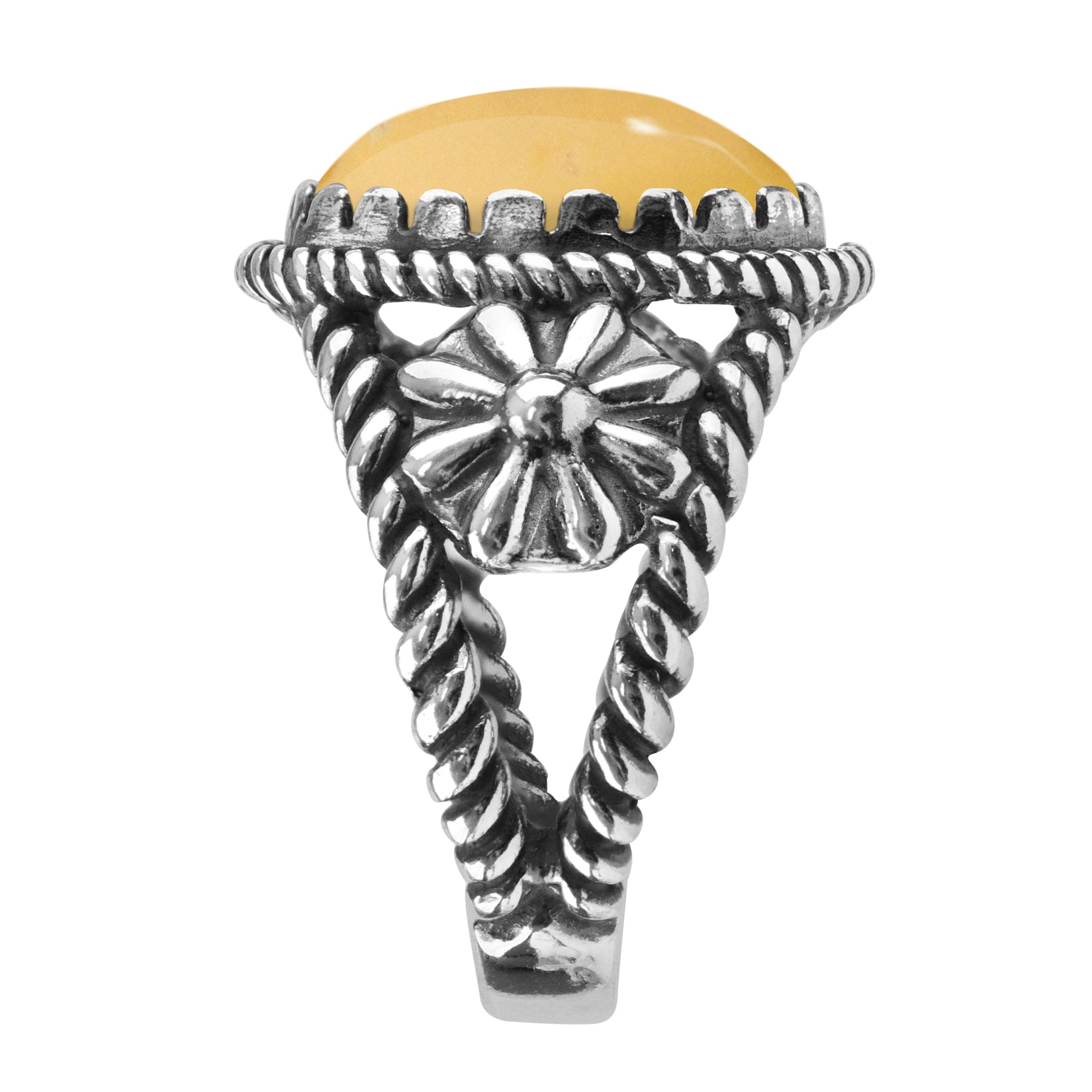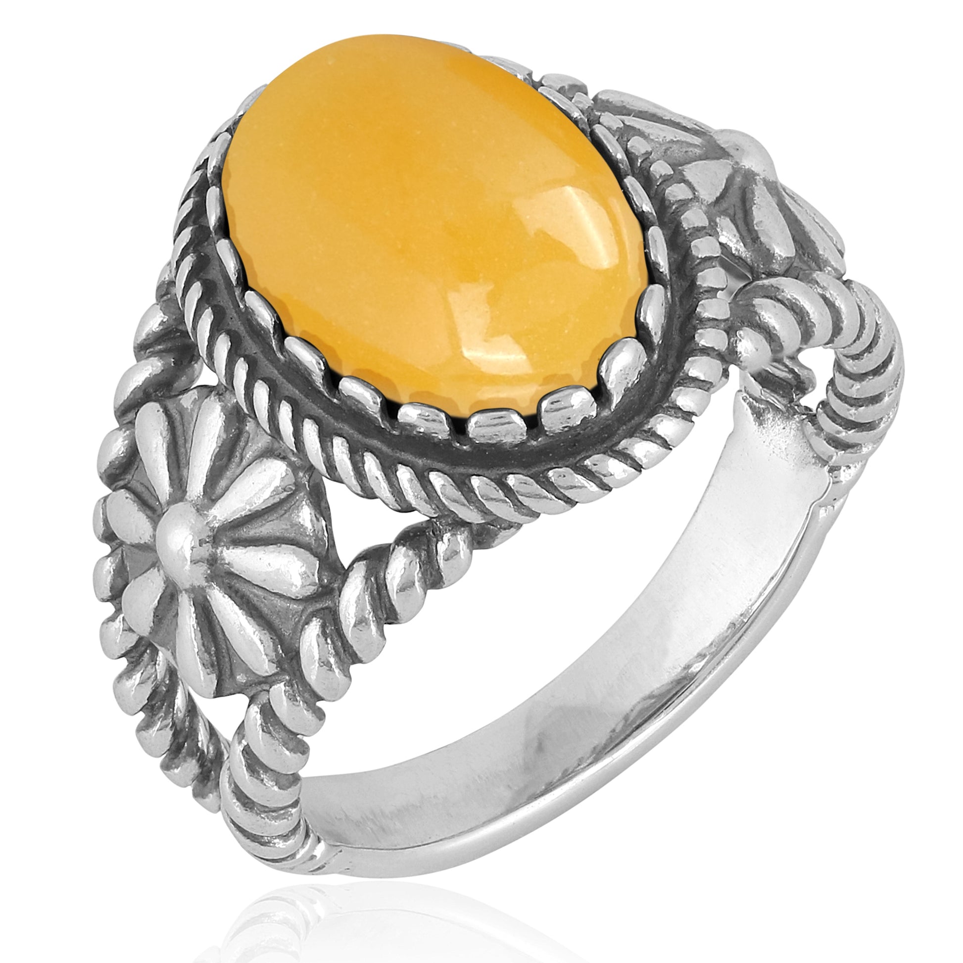 Add a splash of vibrant color to any look with this versatile, Southwest-inspired ring of real, nickel-free .925 Sterling Silver. This ring is proudly designed to represent the beauty and rich history of the western region in silver with an oval-shaped Yellow Jasper genuine gemstone at the center. It is surrounded by a serrated bezel rope frame with rope split shanks featuring a native flower on each side. This statement ring has an oxidized, polished finish. It was designed by Carolyn Pollack in Albuquerque, New Mexico and brilliantly captures the wonder and flair of the Land of Enchantment. Ideal for any ensemble, make this exclusive ring part of your collection today.