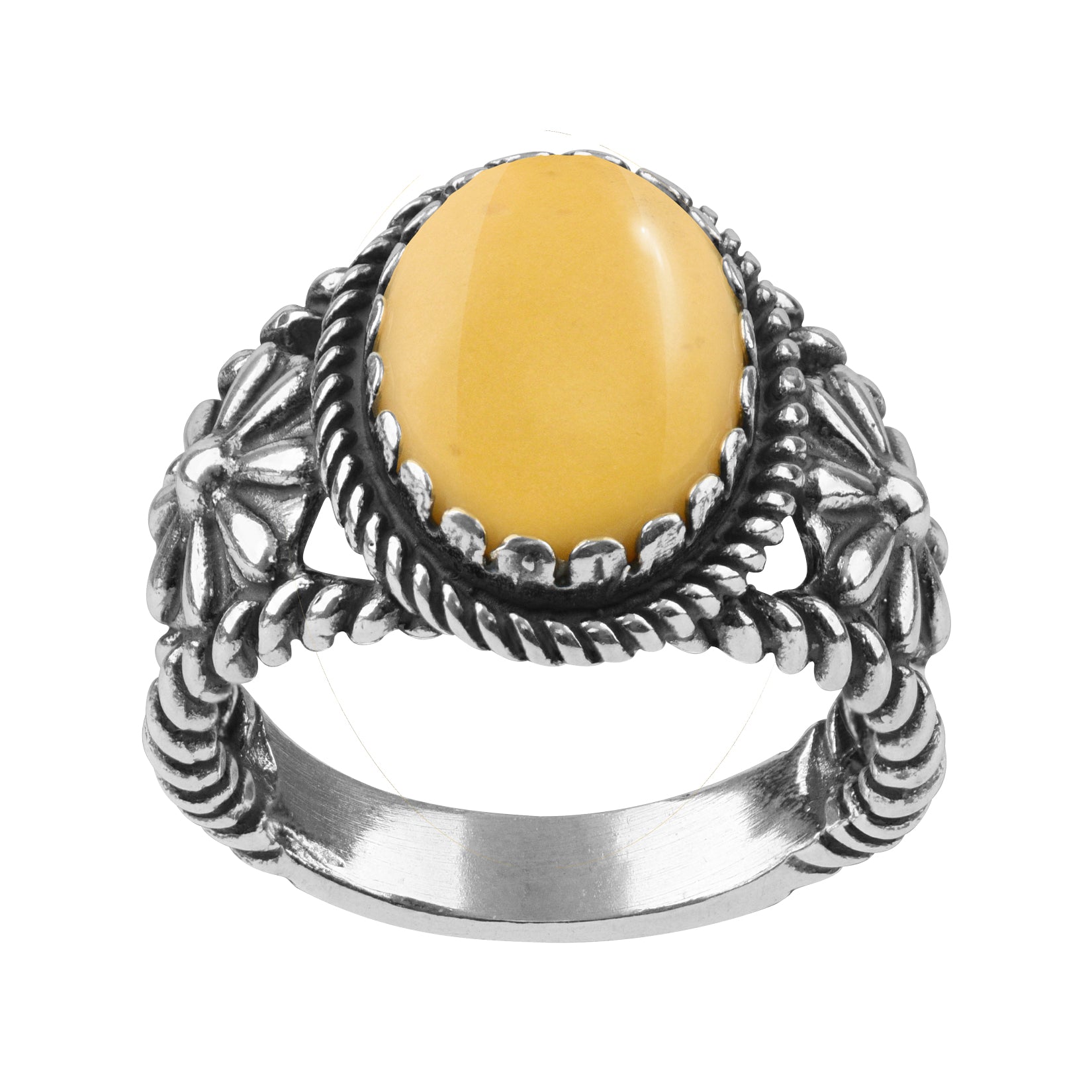 •Naturally colorful Southwestern Sterling Slver ring designed by Carolyn Pollack features an oval-shaped 10x14mm Yellow Jasper gemstone set in a scalloped bezel-setting, with a rope frame with rope split shanks that have a native-inspired concha flower on each side, and a polished oxidized finish