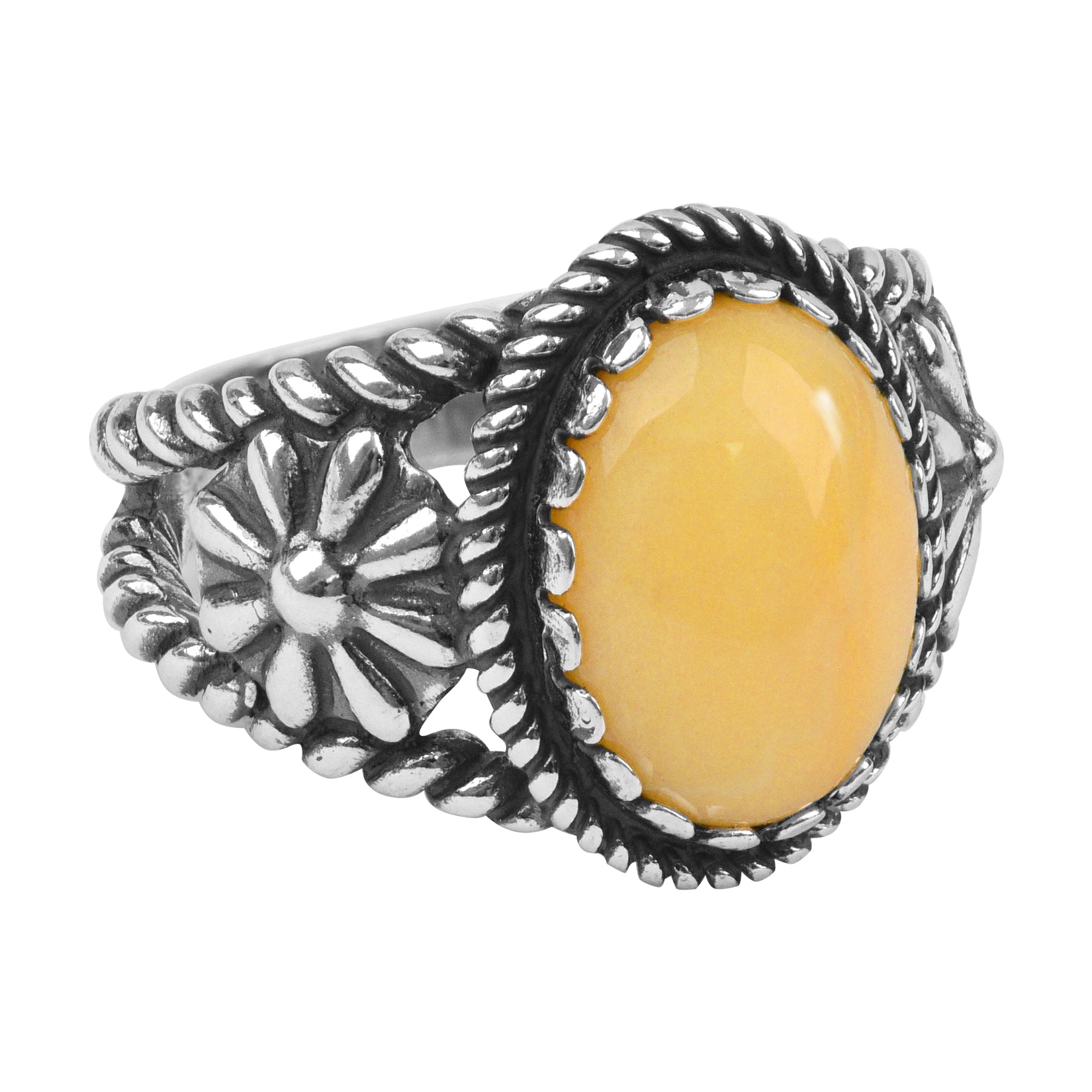 Sterling Silver Yellow Jasper Gemstone Concha Flower Design Ring, Sizes 5 to 10