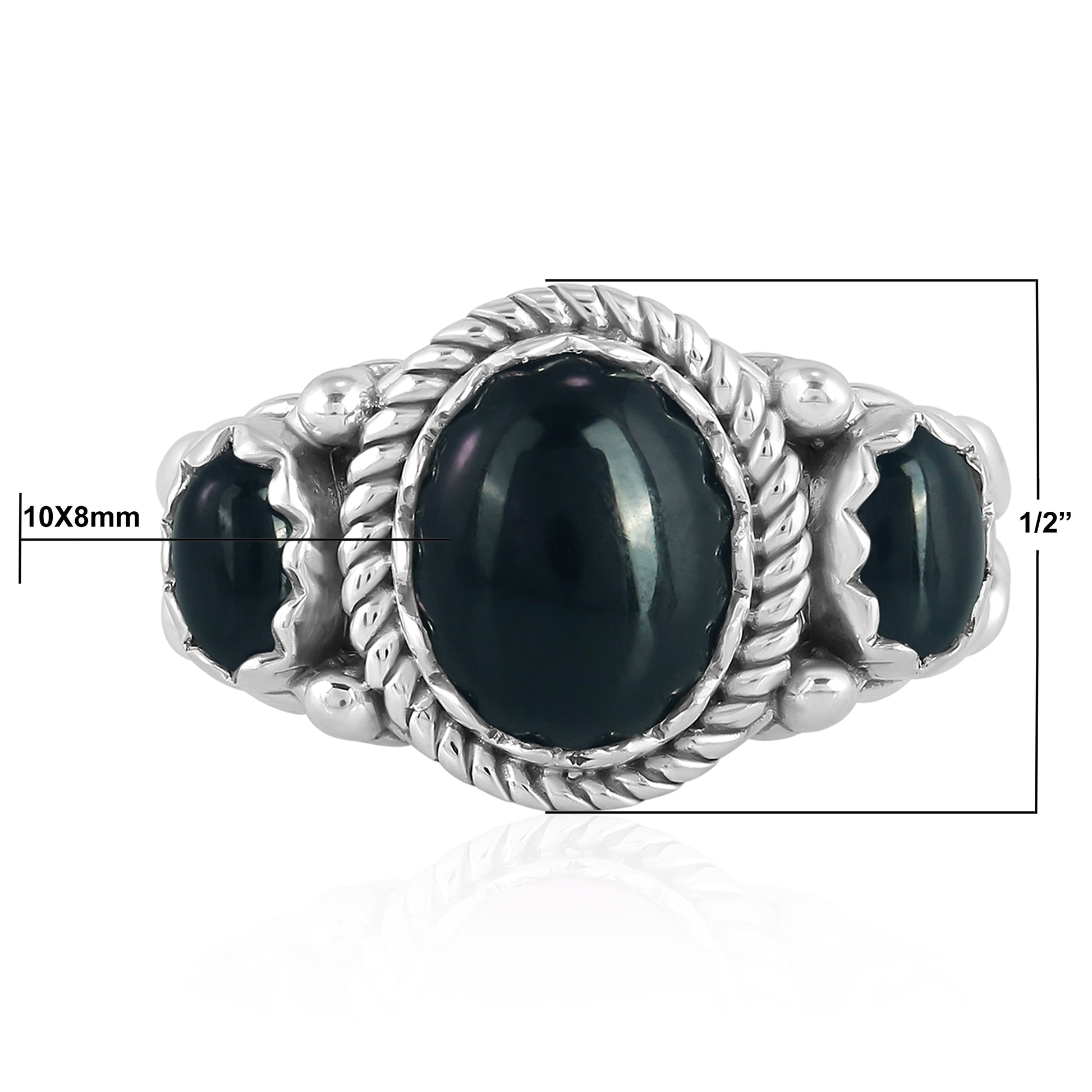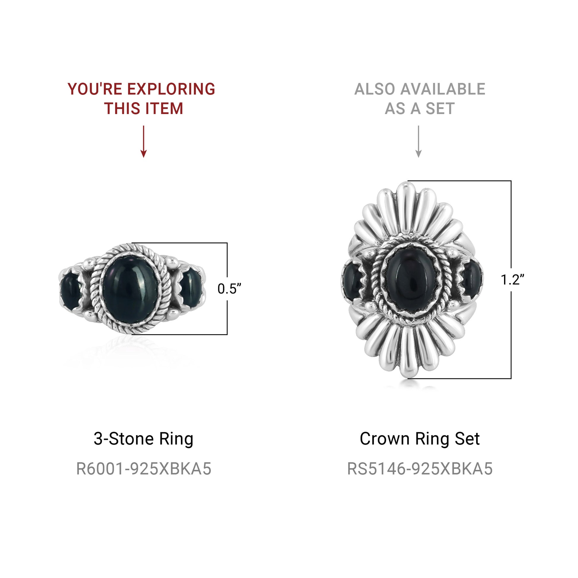 Introducing the American West Jewelry 3-Stone Ring. This naturally colorful, Southwest-inspired Sterling Silver ring features 3 oval Black Agate gemstones, with a decorative bezel setting with rope detailing and a split shank in a polished, oxidized finish. Create a bold statement and elevate your look. This beautiful ring is designed from nickel-free Sterling Silver and is available in a range of sizes to fit every finger. Black Agate is considered a symbol of strength and courage. It is believed to protect the wearer from harm.