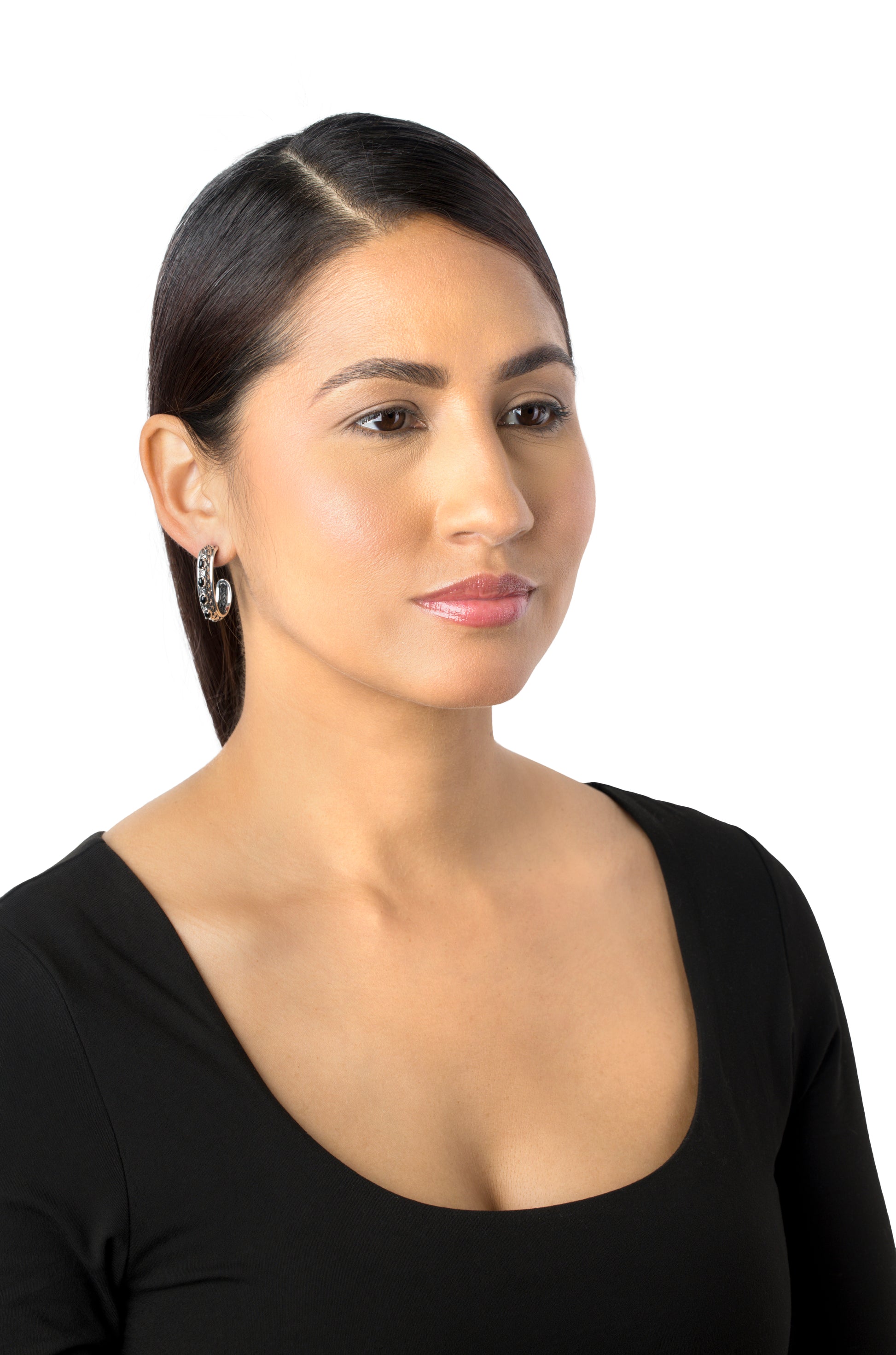 Sterling Silver Black Onyx Patterned J-Hoop 1 Inch Earrings
