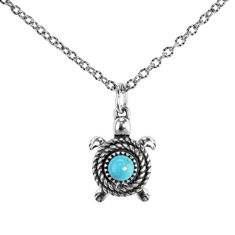 The Spirit Stone Collection features animal-inspired pieces that embody the power of the wild through genuine, hand-carved gemstones. Add fun and color to any look with this versatile, Southwestern Turtle Necklace made of Sterling Silver and genuine Turquoise. Our Turtle Necklace features a round 6x6mm Blue Turquoise gemstone cabochon set in a double rope bezel on a textured chain; all with an oxidized, polished finish. Pair it with our Turquoise Turtle earrings to complete your look! Turquoise denotes wholeness, wisdom and higher truth, and Native Americans value this semi-precious stone for its shamanic medicine and spiritual transmission. Turquoise helps you give voice to your wisdom, influence, authority and respect.